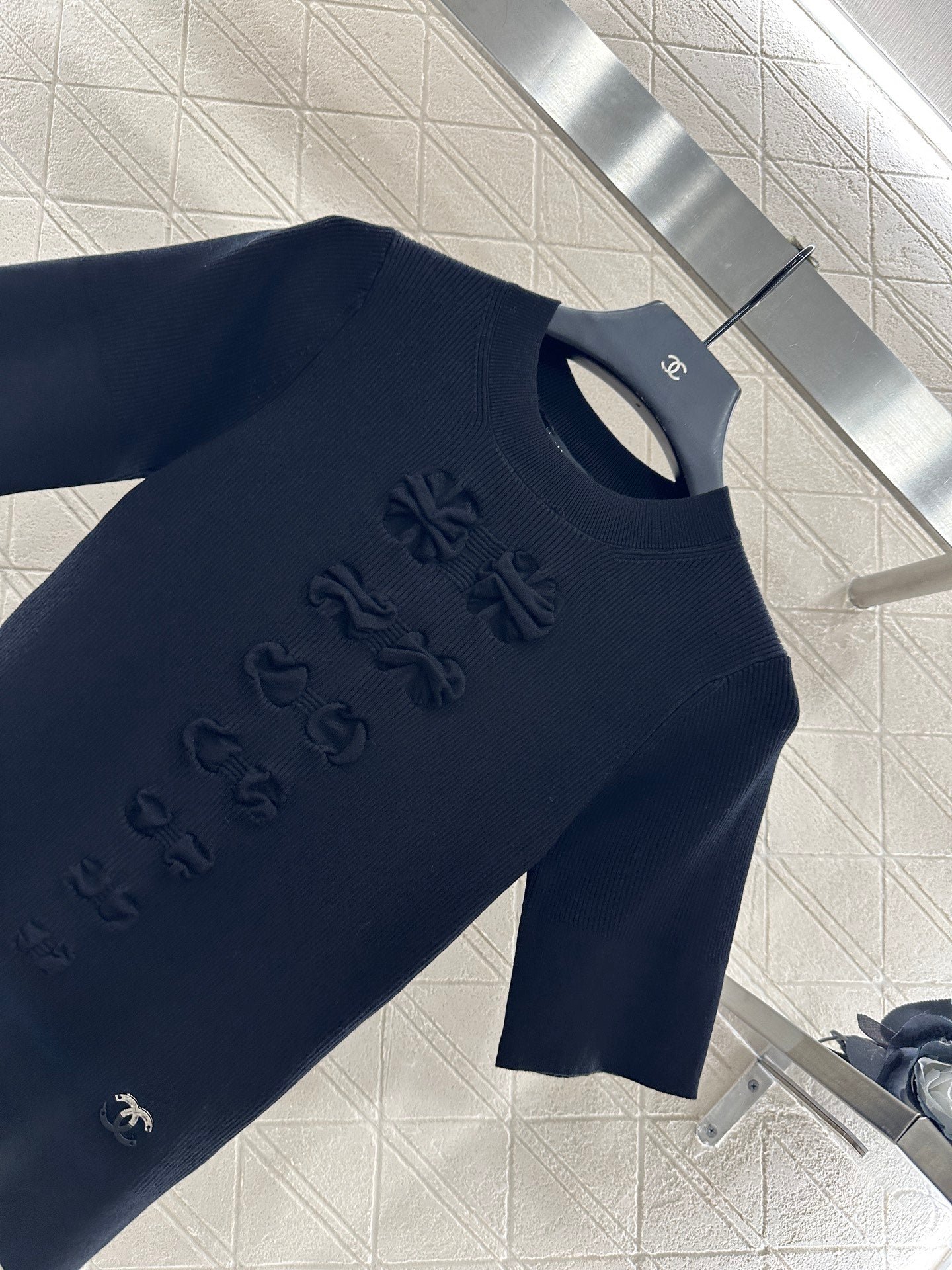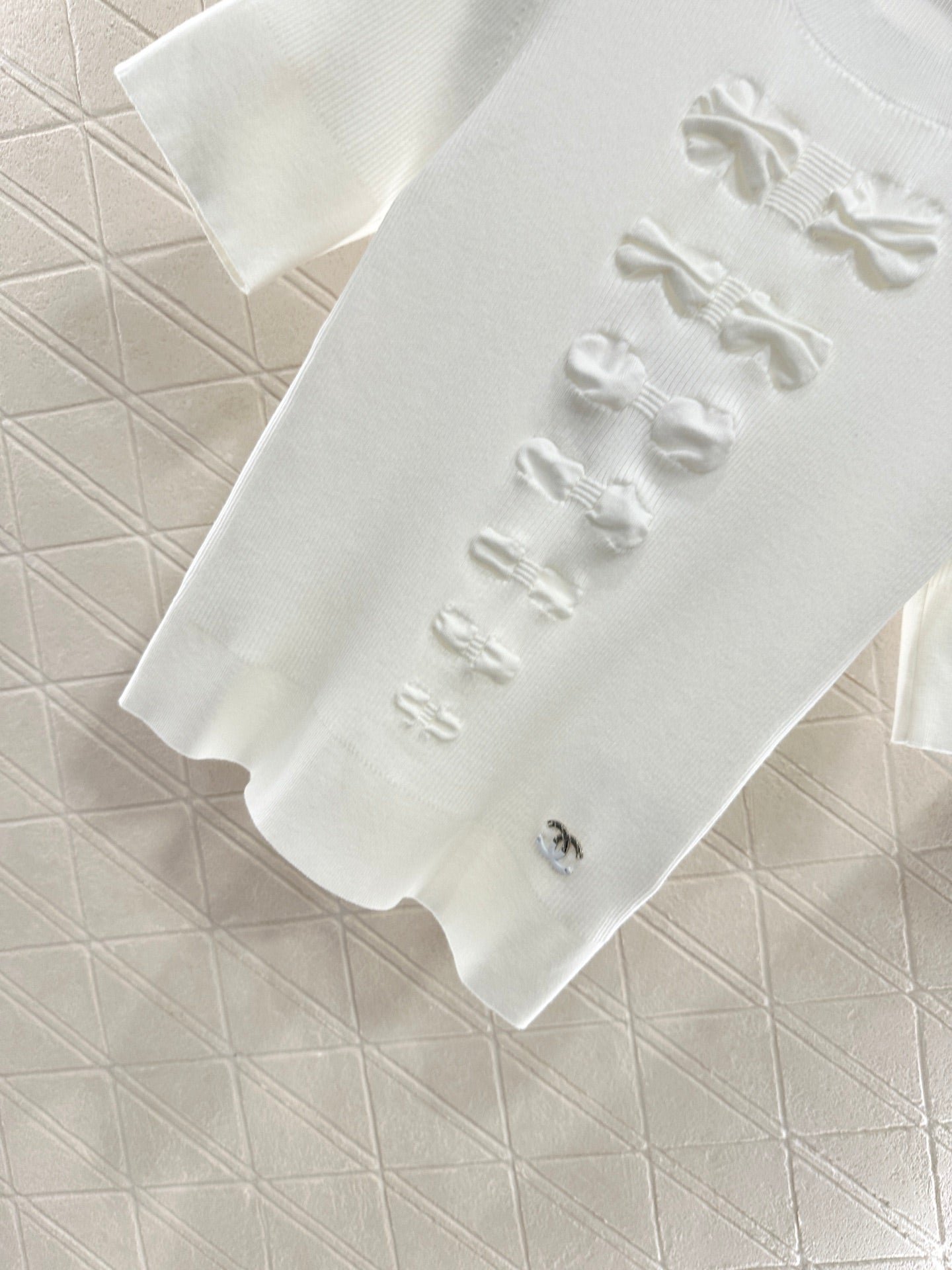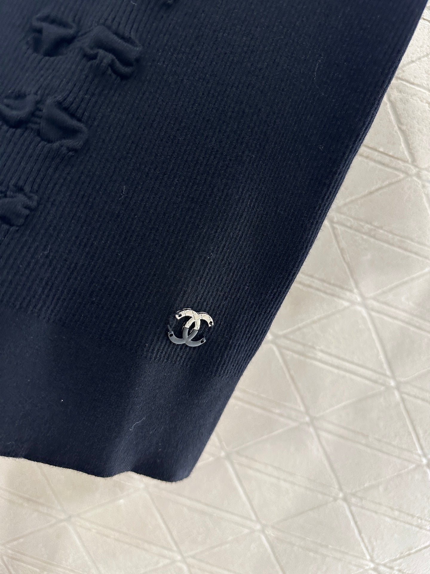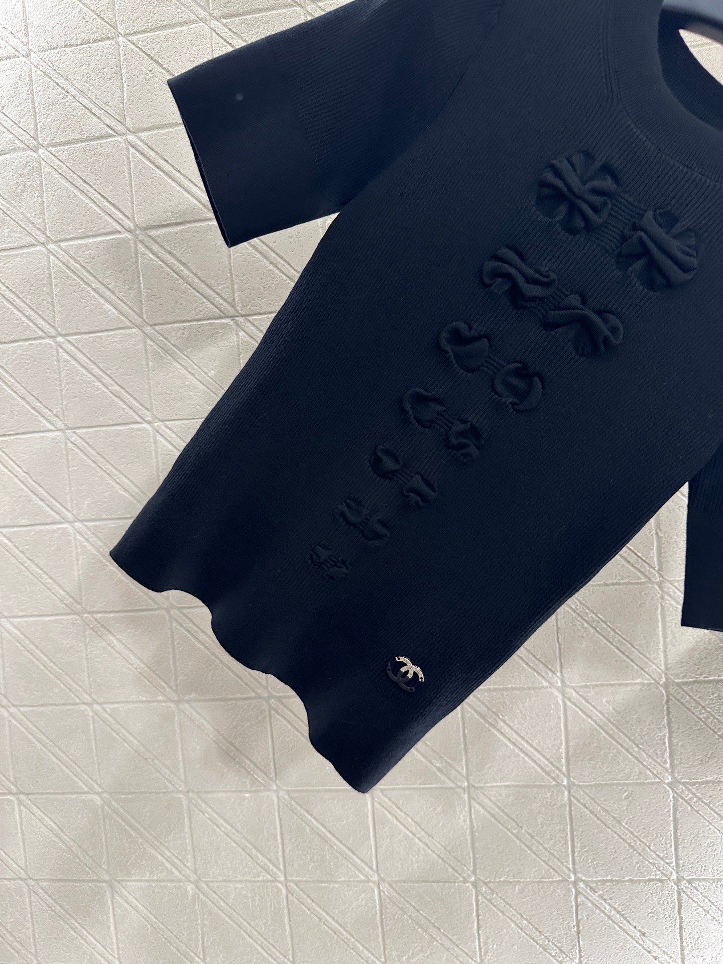 Cotton and wool yarn weaving, soft and delicate, comfortable texture, round neck knitted short sleeved, decorated with concave and convex textures from top to bottom to create bow decorations, rich design layers, combined with threaded elastic edging to make it more slimming. The double C-letter logo at the hem shows the brand tone, low-key and textured, with elastic fabric that fits the body shape, showing elegance and generosity on the upper body