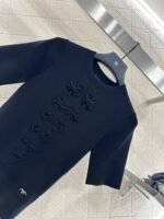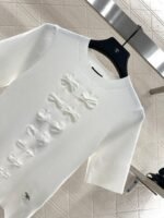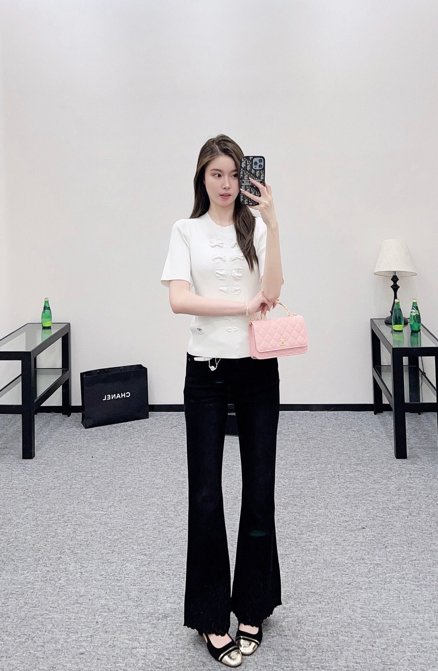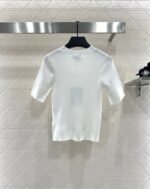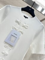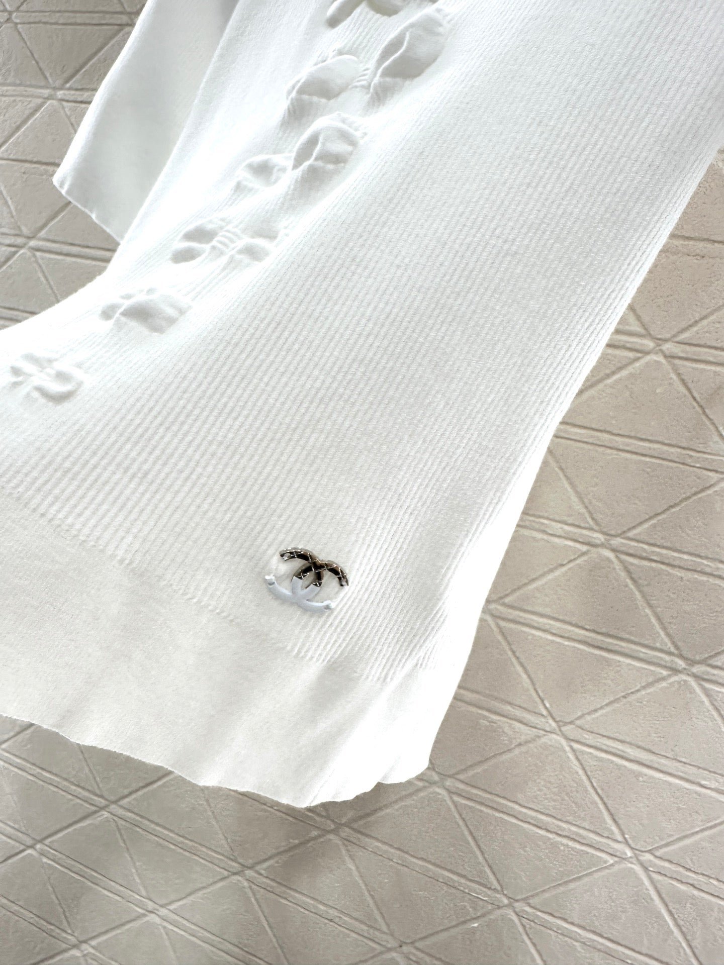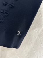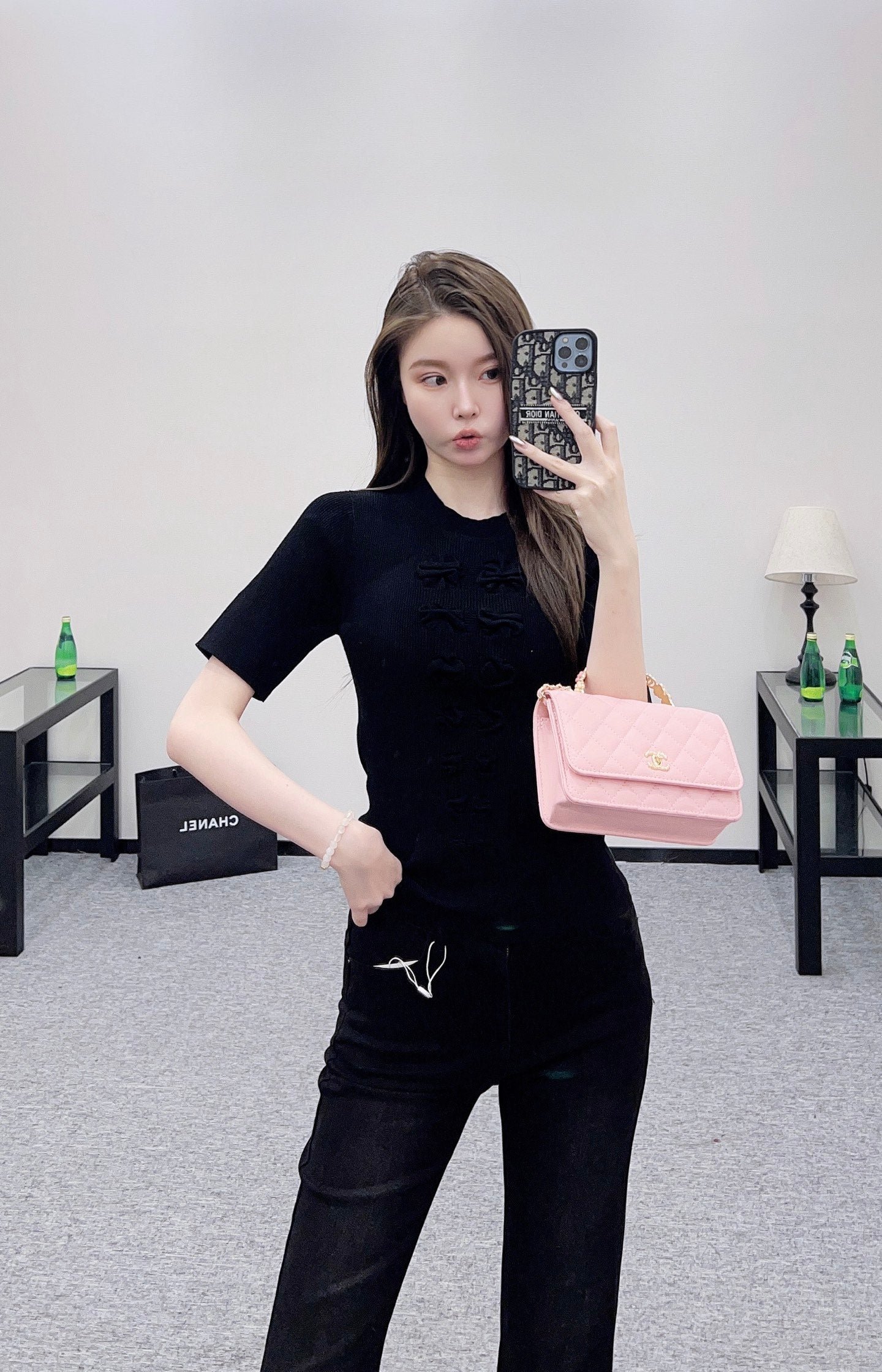Cotton and wool yarn weaving, soft and delicate, comfortable texture, round neck knitted short sleeved, decorated with concave and convex textures from top to bottom to create bow decorations, rich design layers, combined with threaded elastic edging to make it more slimming. The double C-letter logo at the hem shows the brand tone, low-key and textured, with elastic fabric that fits the body shape, showing elegance and generosity on the upper body