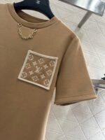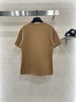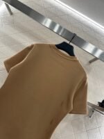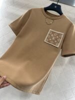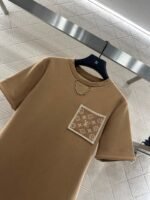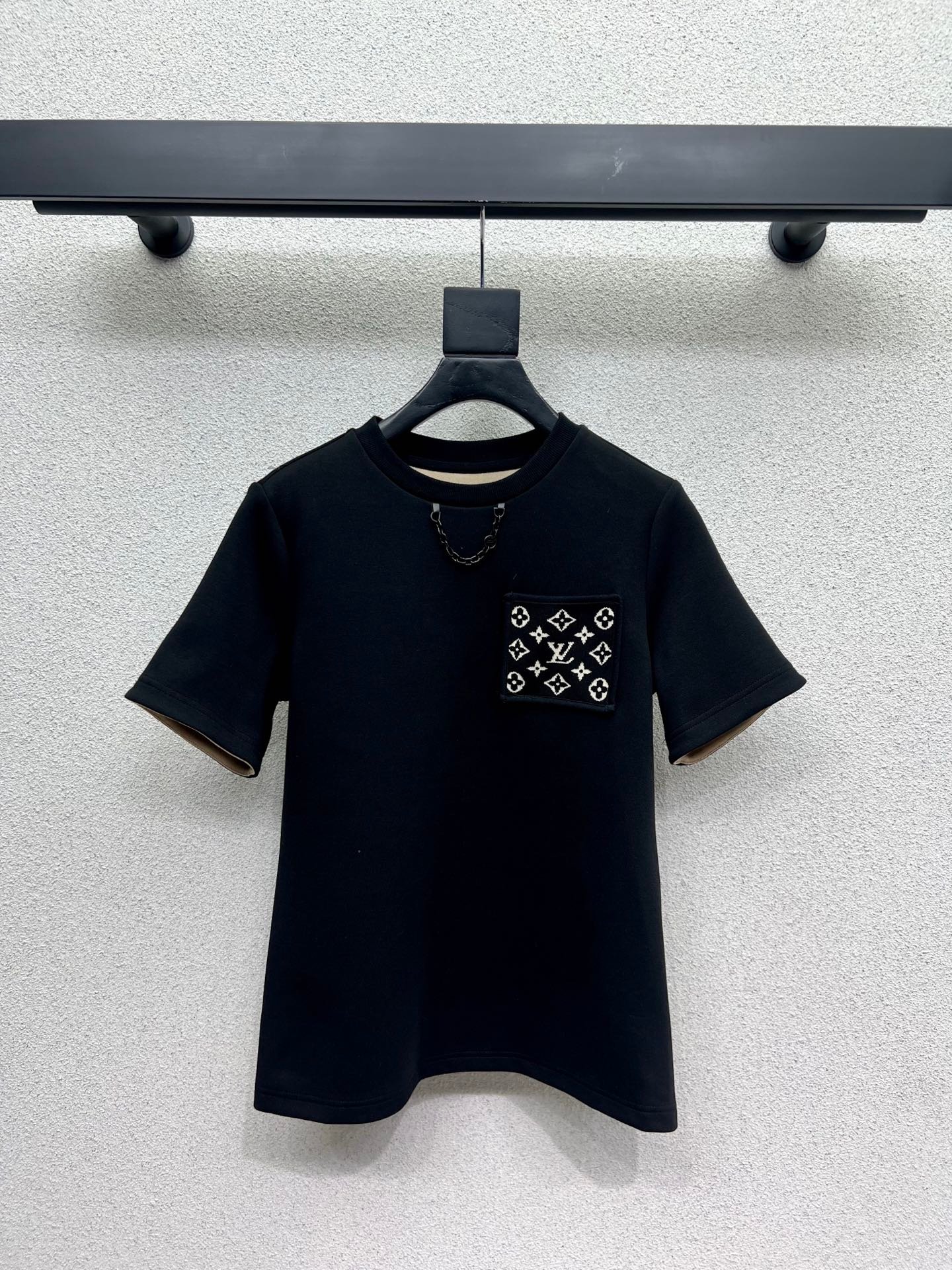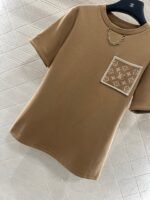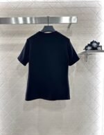 Cotton polyester blend material, composite process treatment, glossy texture, comfortable thickness, conventional short sleeved cutting, highlighting brand style, using cotton polyester material, slightly elastic, presenting a slimming visual effect, the collar is embellished with letter chains, jacquard letter pockets echo, rich layers, fashionable and casual, both single wear and interior are fashionable and eye-catching