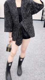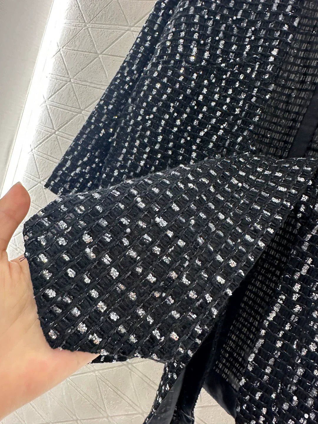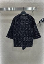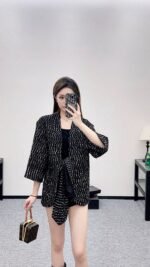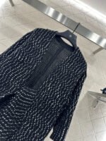 Cotton and wool material texture for high-end dressing, loose shoulders, oversized open top jacket, cut with a large body, using bead and yarn interweaving to create a textured open top design. The front side is connected by two-piece straps to create a loose silhouette, highlighting a sense of luxury and slimming