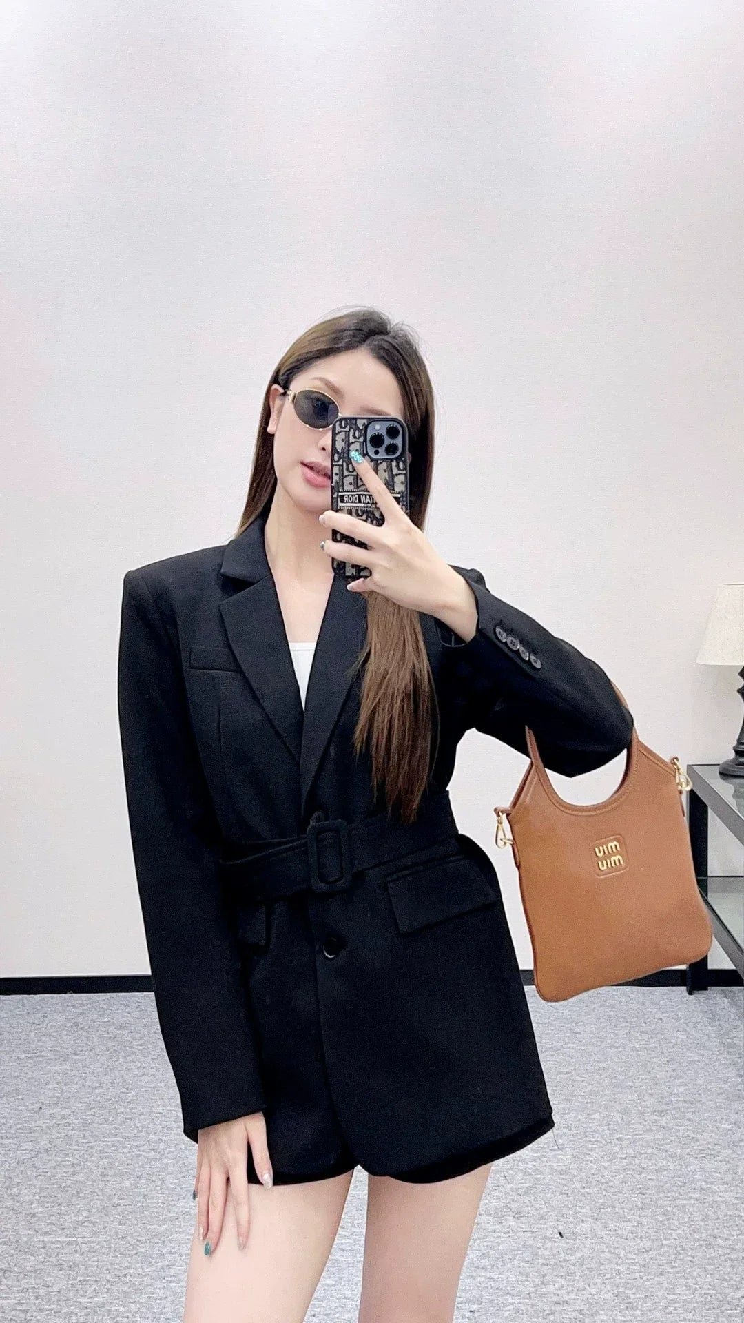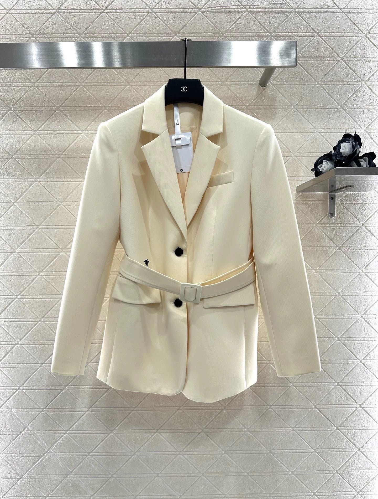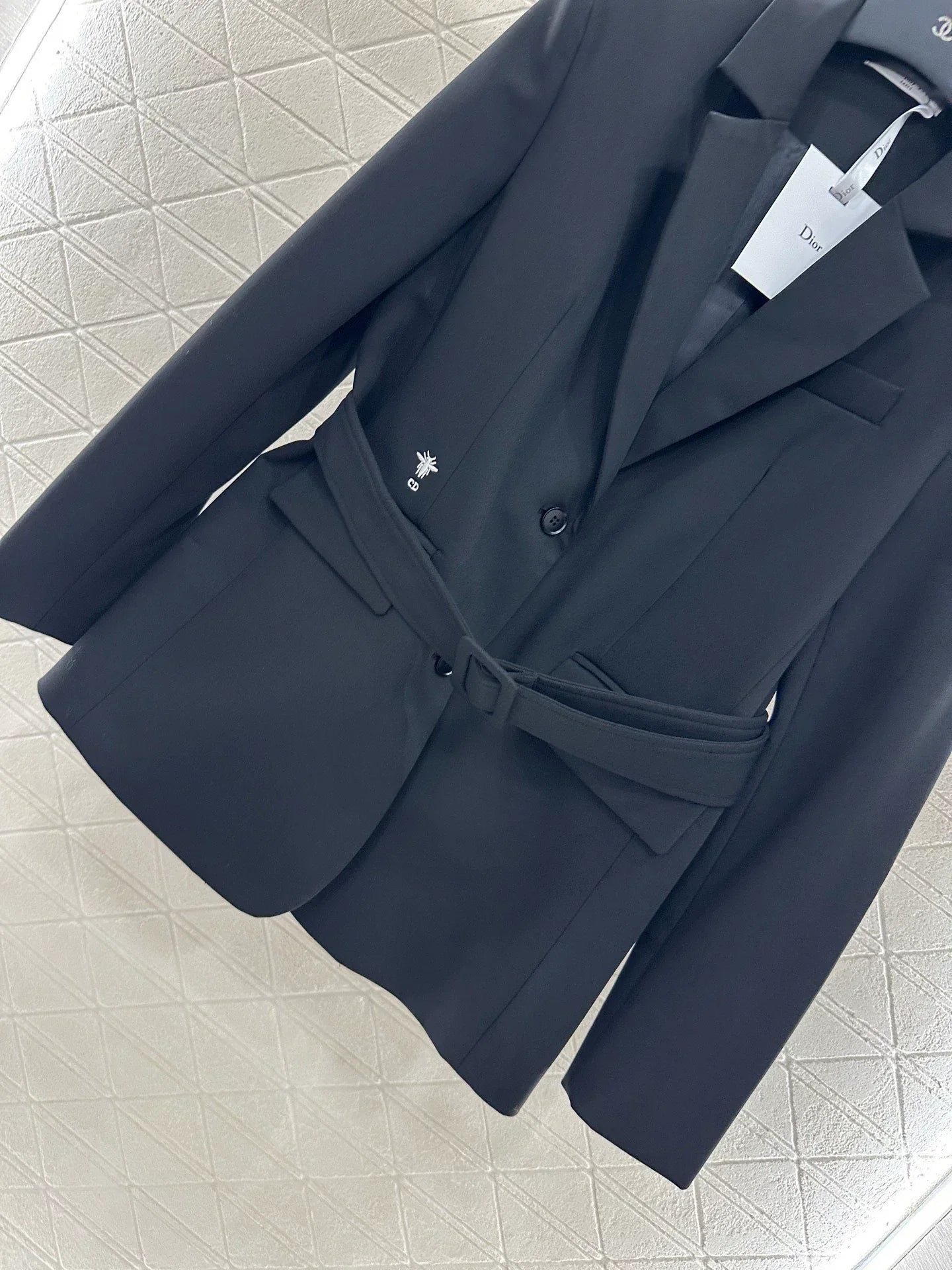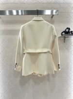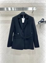 Acetic acid material texture, gloss, stronger drape, high-end lapel shoulder suit style, single row buckle adjustment and narrowing at the front, using this fabric waistband adjustment to highlight the waistline and show more style. The three-dimensional cutting makes the dressing more inclusive and not picky. The bee CD logo on the waist side is elegant and relaxed, creating a fashionable and trendy dressing style