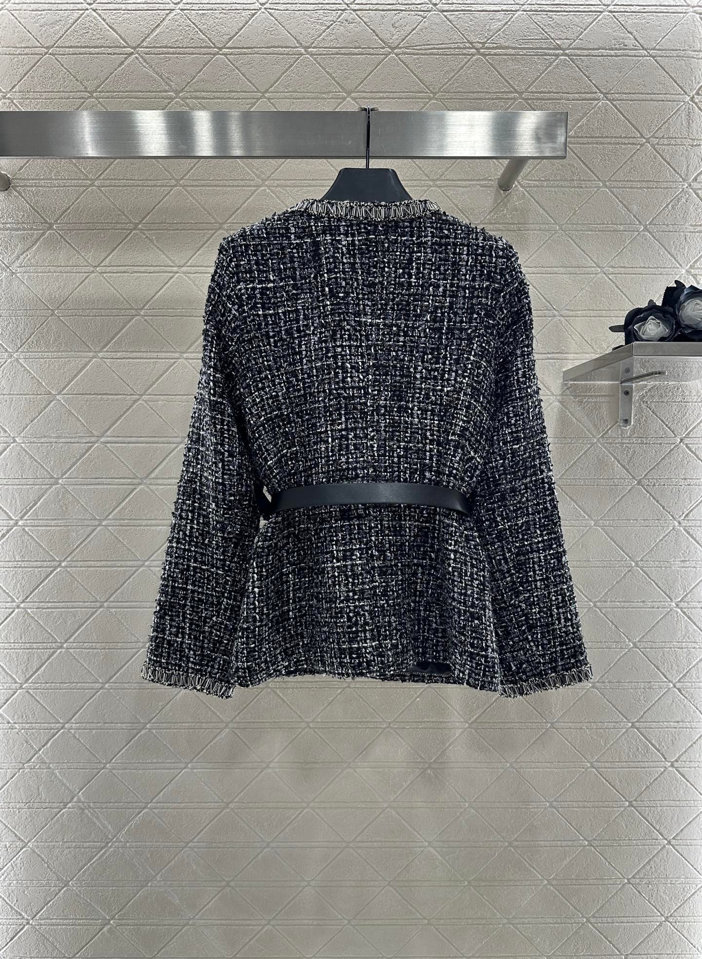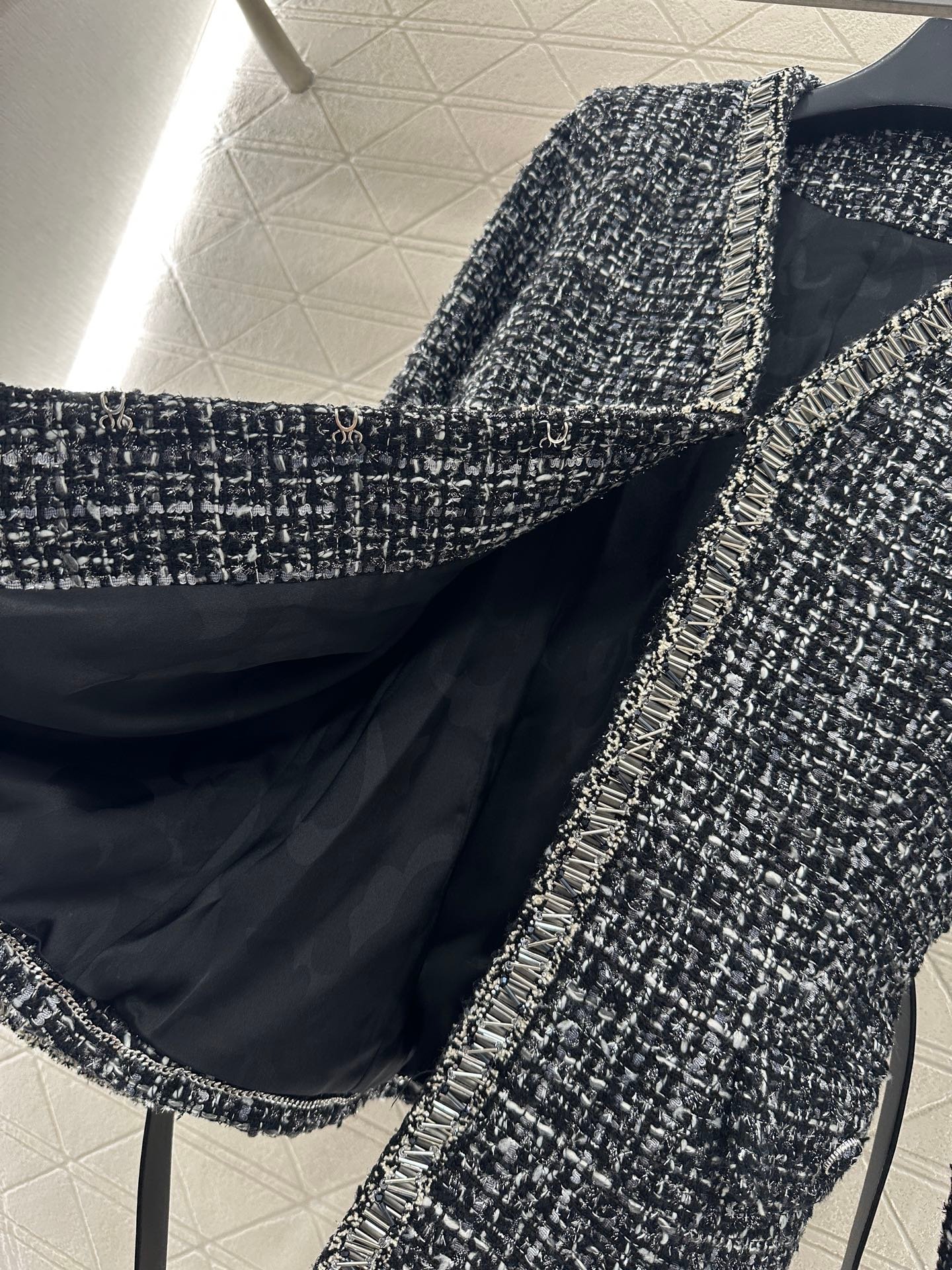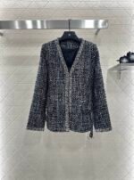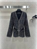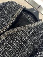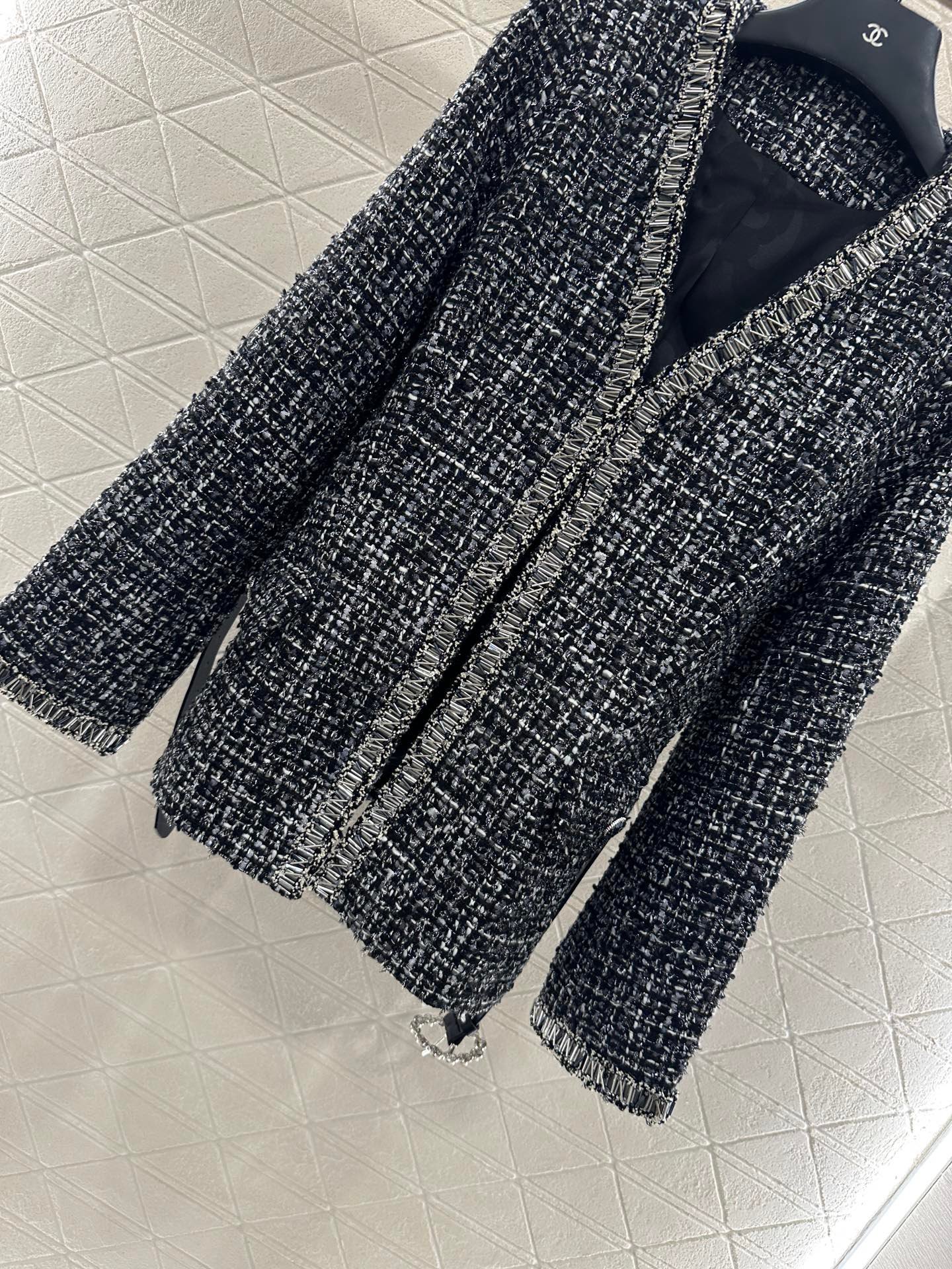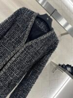 The texture is obvious, the wool material is visible to the naked eye, and the texture is superior. The coarse flower striped woolen fabric creates a model of socialite style. The V-neck padded shoulder jacket has a hidden buckle on the front, luxurious and elegant. The nail bead process is composed of edge decoration and double C logo belt decoration, elegant and charming. It is the first choice for fashionable dressing