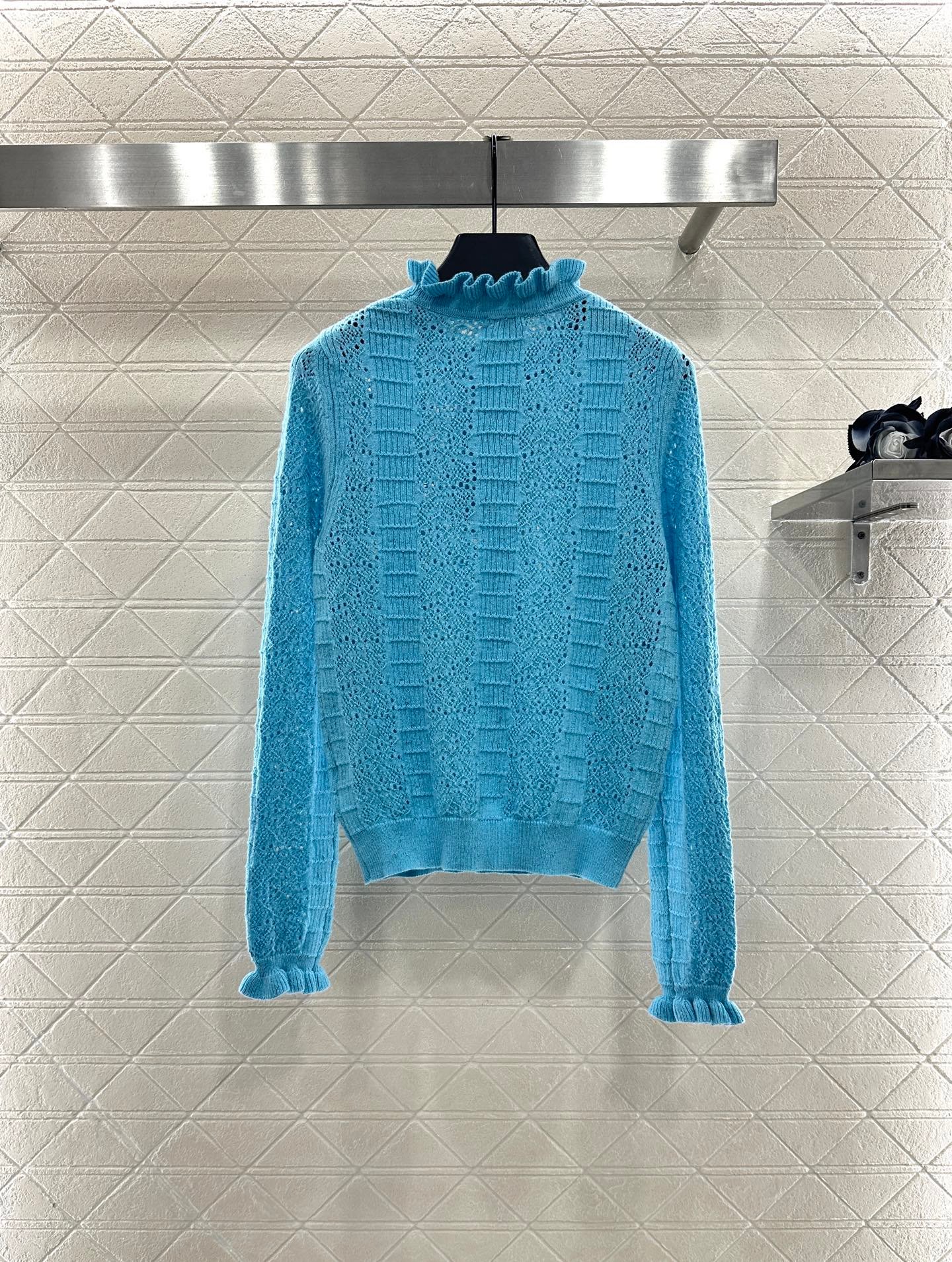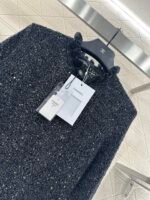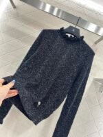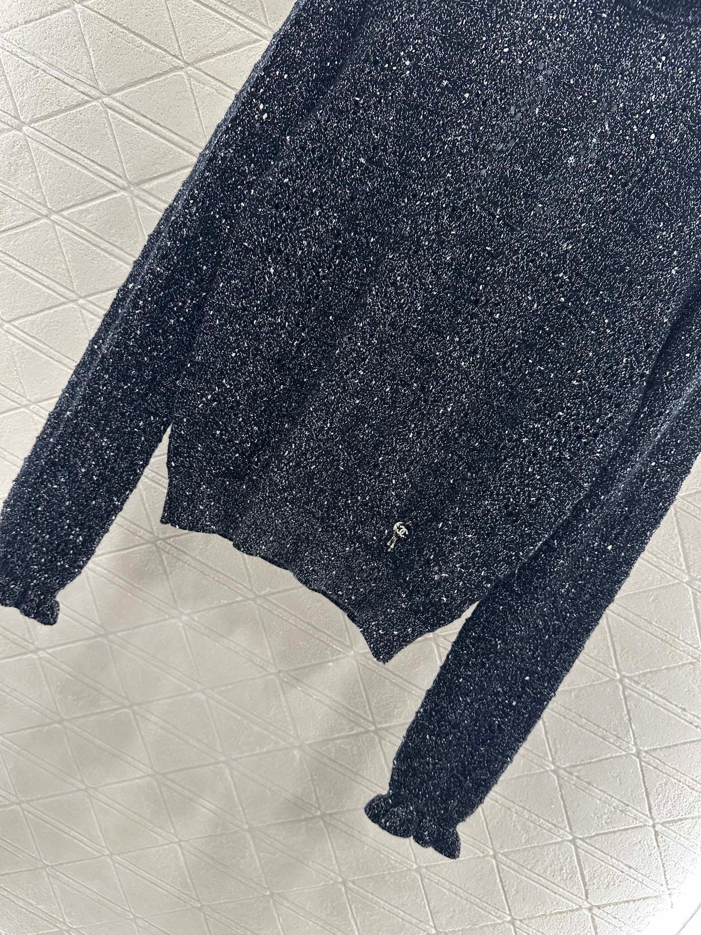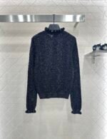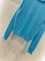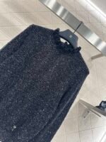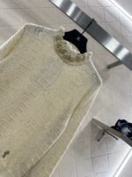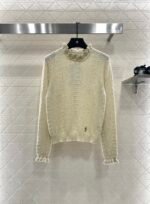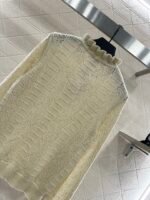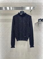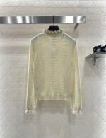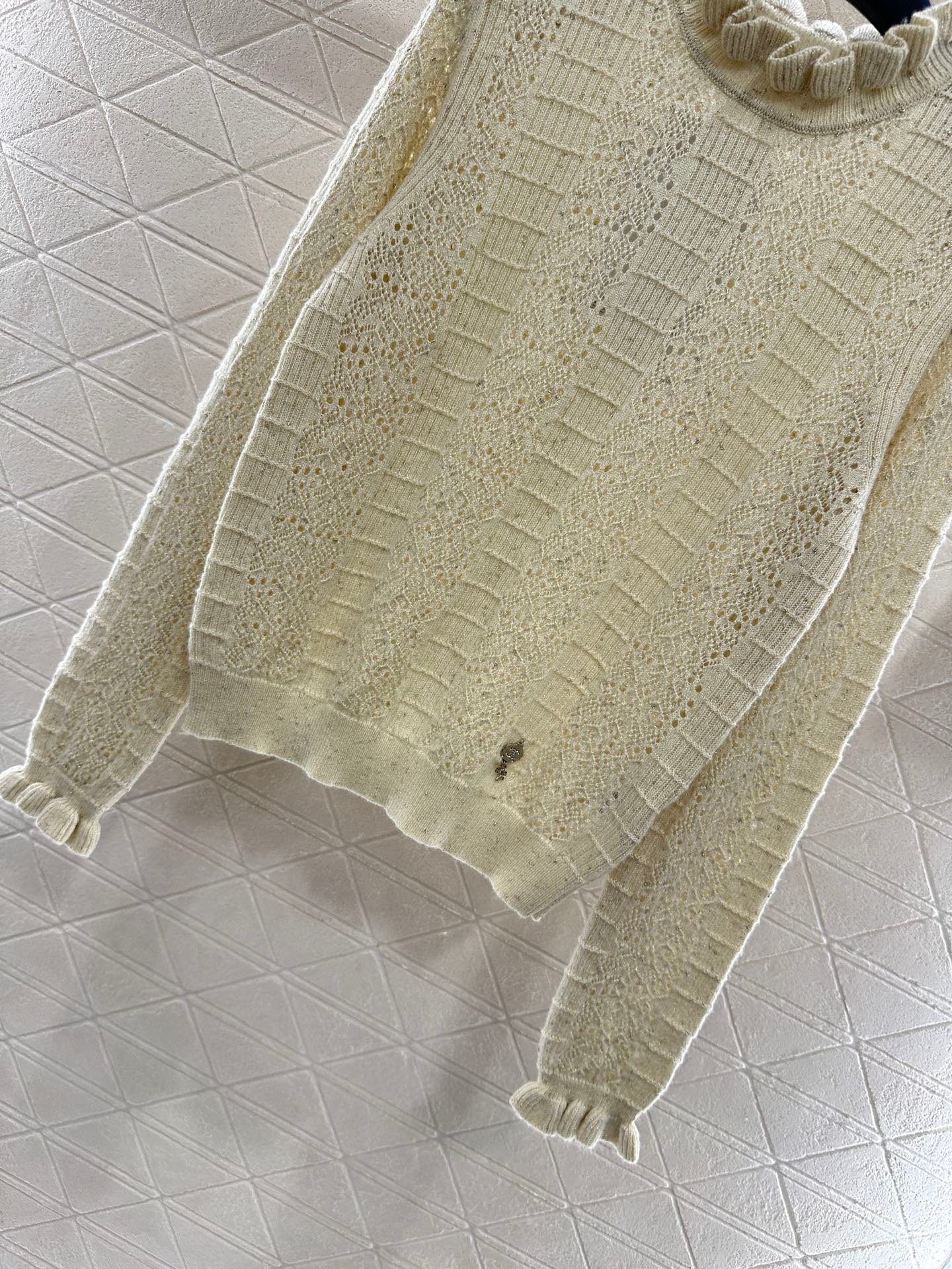 Woven from cashmere and wool yarn, delicate and soft, full of elasticity, with a delicate small stand up collar knitted long sleeved design. The collar edge is outlined with three-dimensional fungus pleated lace, with full attention to detail. The basic style is matched with a large vertical hollow knitting, with a fresh and light texture, and the iconic double-C logo embellishment. The gold and silver threads are integrated, creating a strong retro and luxurious style that reduces aging and looseness, allowing for easy daily use.