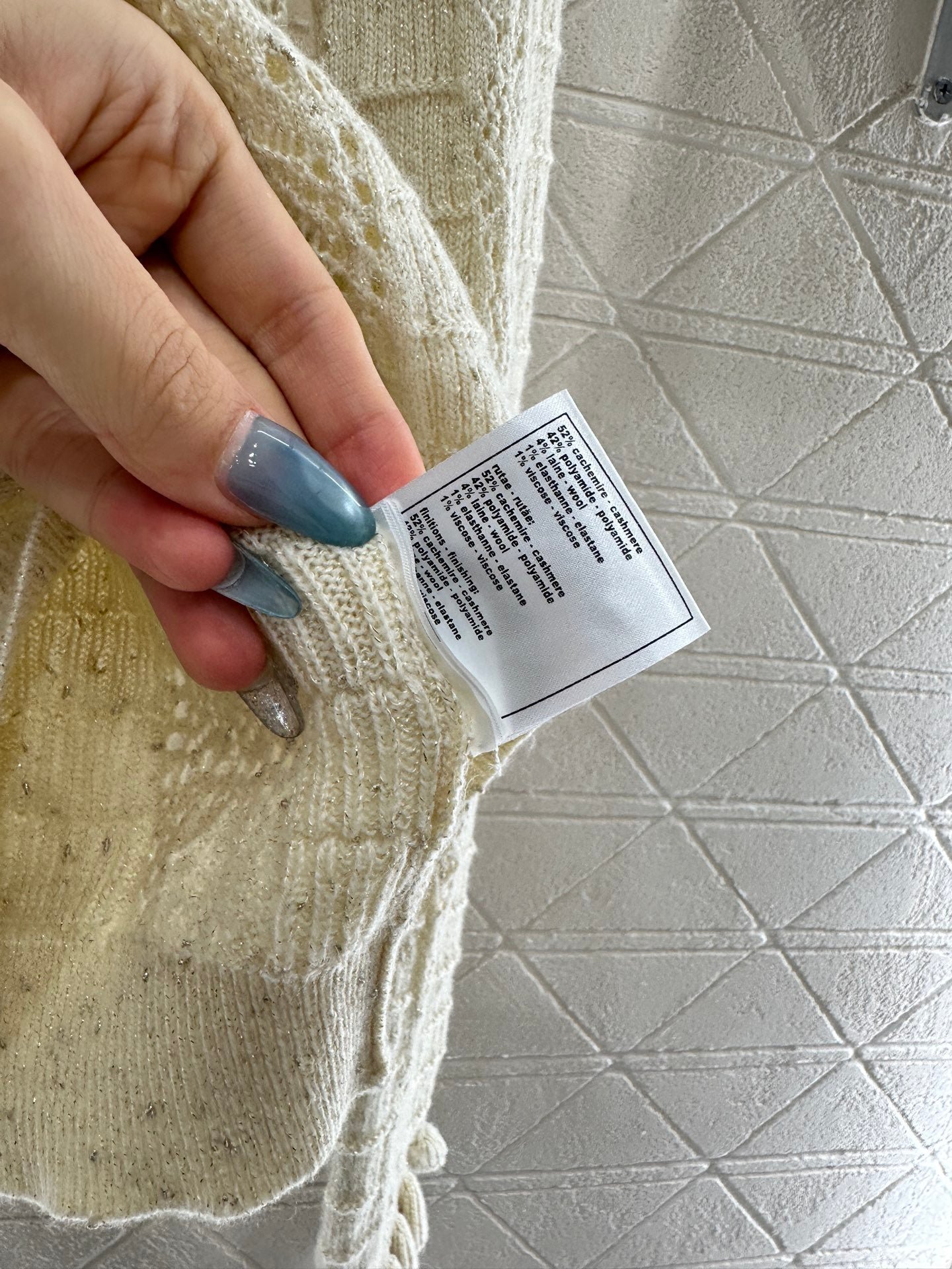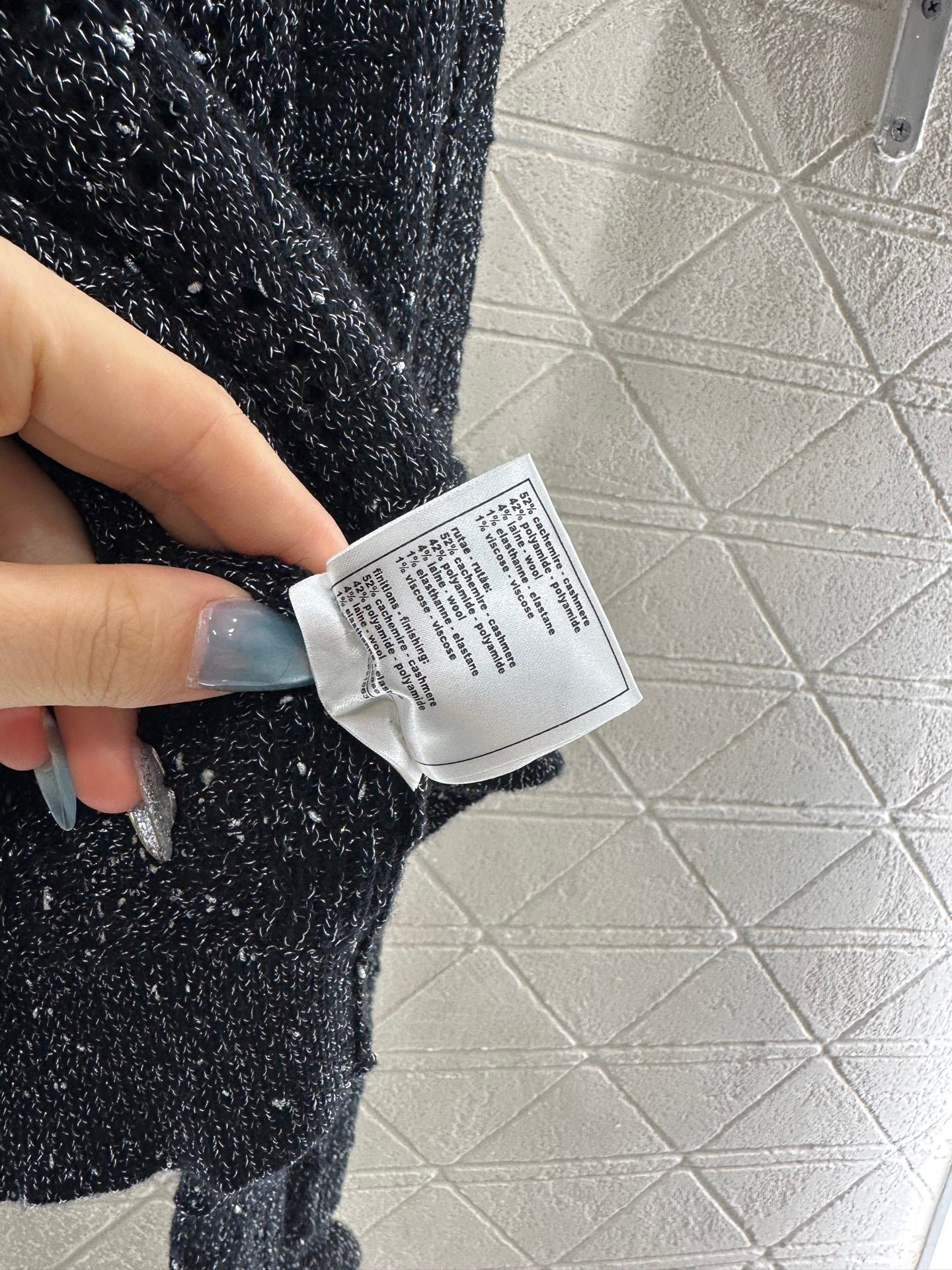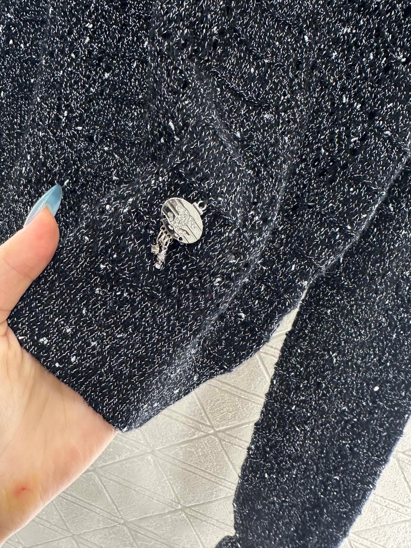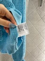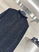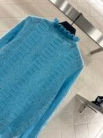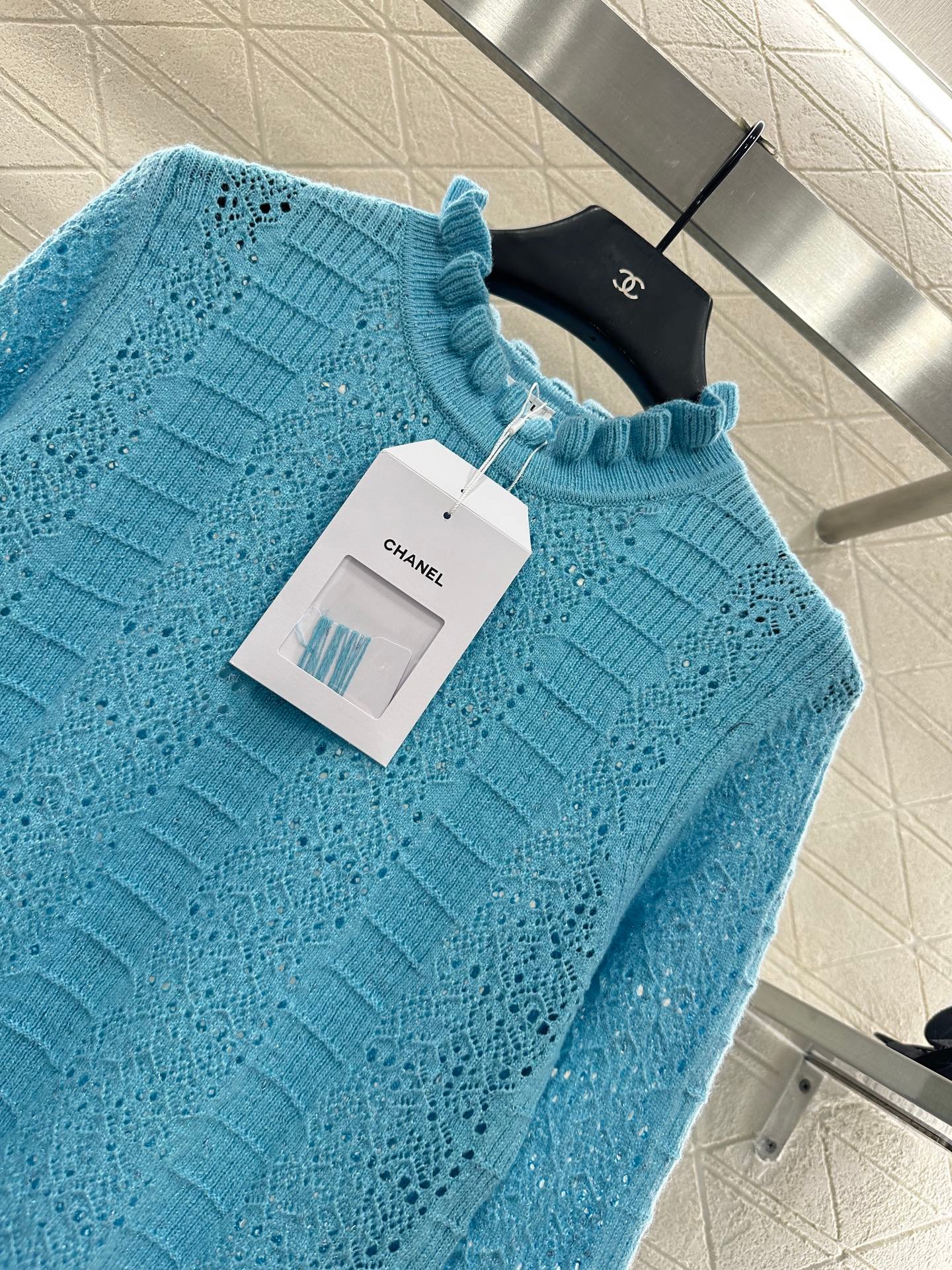 Woven from cashmere and wool yarn, delicate and soft, full of elasticity, with a delicate small stand up collar knitted long sleeved design. The collar edge is outlined with three-dimensional fungus pleated lace, with full attention to detail. The basic style is matched with a large vertical hollow knitting, with a fresh and light texture, and the iconic double-C logo embellishment. The gold and silver threads are integrated, creating a strong retro and luxurious style that reduces aging and looseness, allowing for easy daily use.