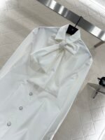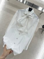 Made of all cotton material, processed with craftsmanship, comfortable and crisp, this shirt features drawstring sleeves and a collar embellished with ribbons. When tied, it turns into a bow for a more elegant look. The front of the shirt is adorned with rhinestone double C logo details, which are simple, fashionable, and easy to showcase the brand’s high-end feel, highlighting the temperament and style. A mid length silhouette with perfect relaxation, accommodating the waist, hips, and hips, exuding an elegant style.