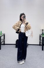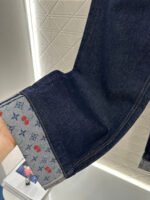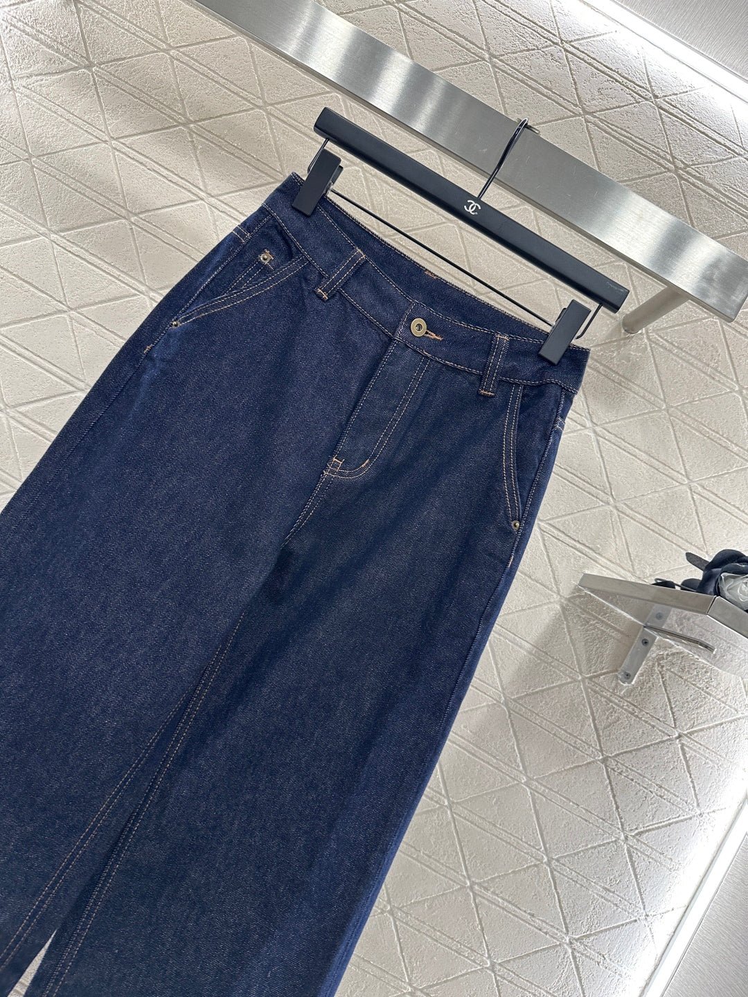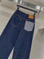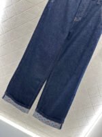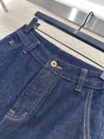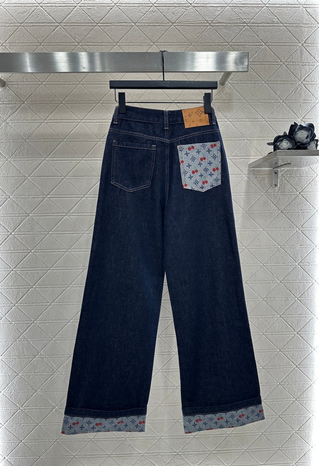 Twill cotton denim fabric with excellent breathability, soft and skin friendly, high waisted buckle, symmetrical pocket, wide leg straight leg pants, cut with multiple enzyme washing processes to create a retro deep blue feeling, retro and fashionable pants legs, folded edges embellished with contrasting colors, clover letters, cherry 🍒 The pattern echoes with the back waist pocket and leather logo, creating a collision with the body and highlighting a high-end and stylish look