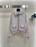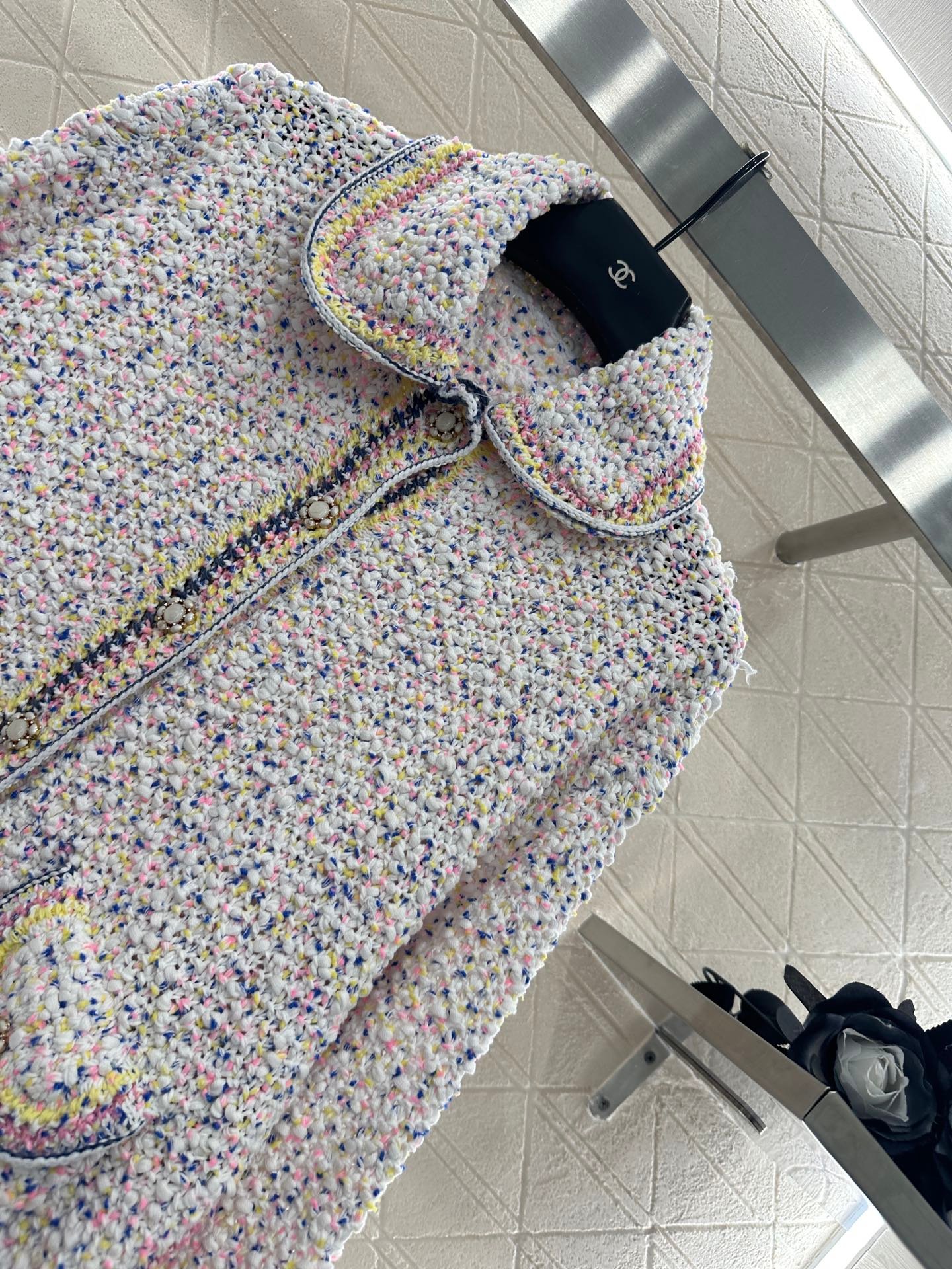 Cotton and wool yarn weaving is soft, sticky, thick, and skin friendly. The regular pattern is matched with a long sleeved lapel cardigan, and the cutting is full of three-dimensional color stripes. The edging color is coordinated with the large body color dot weaving line, and the camellia shaped placket adds a sense of layering. The finely engraved letters enhance the sense of luxury. The single wear interior looks fashionable and stylish