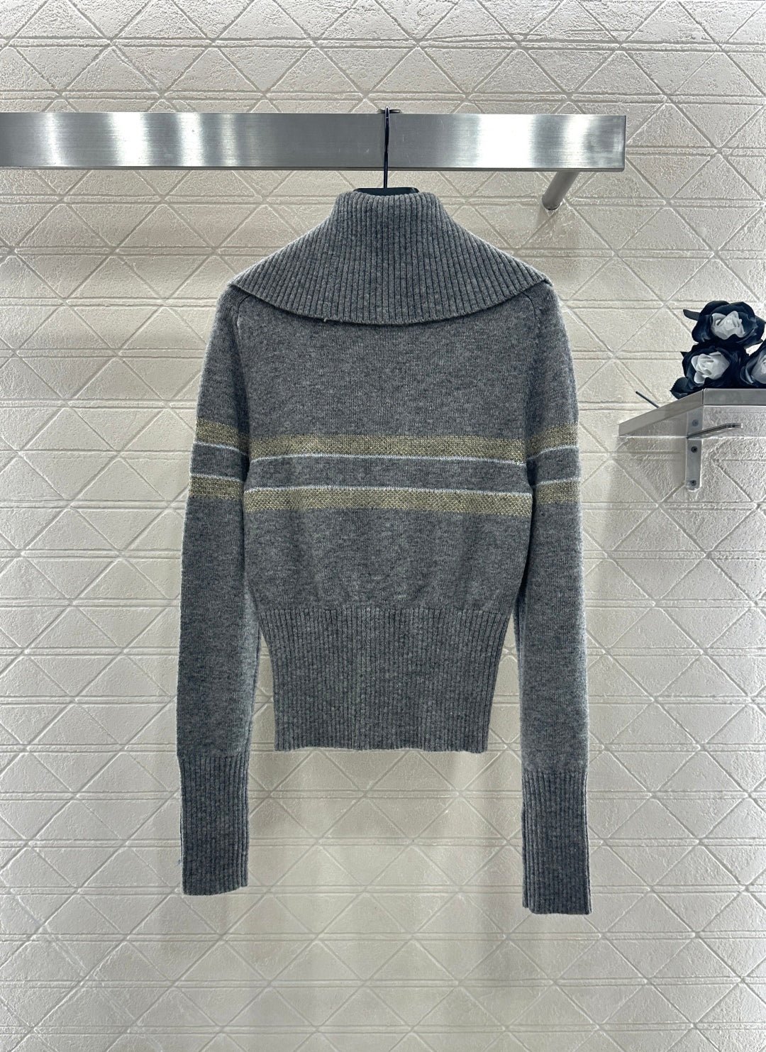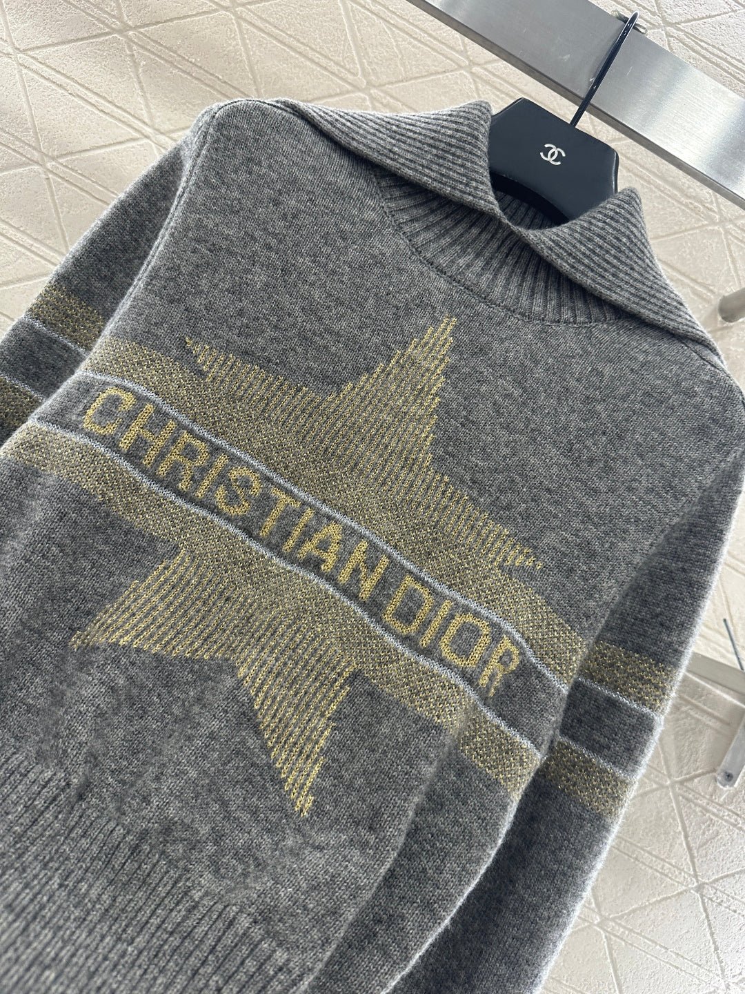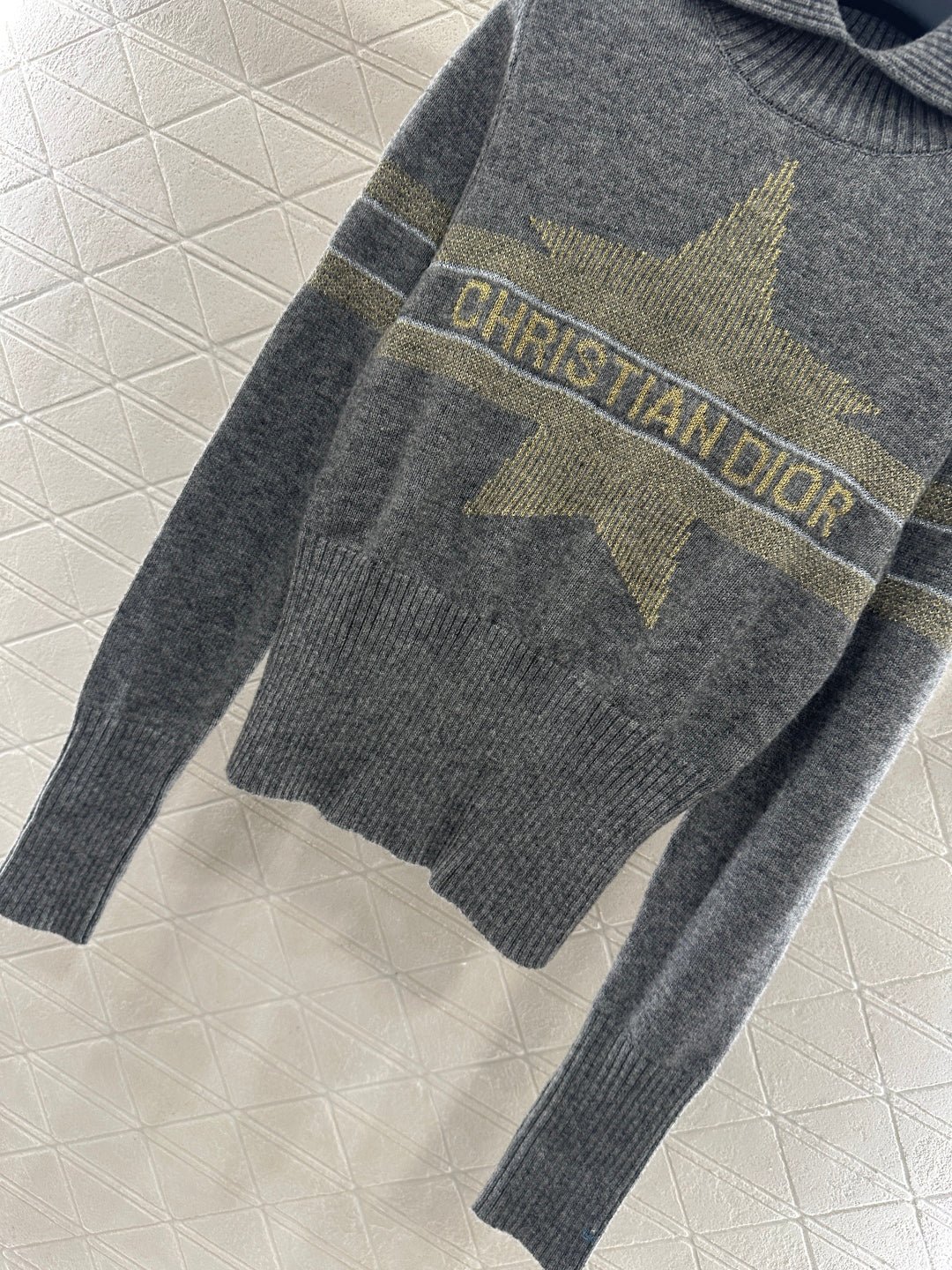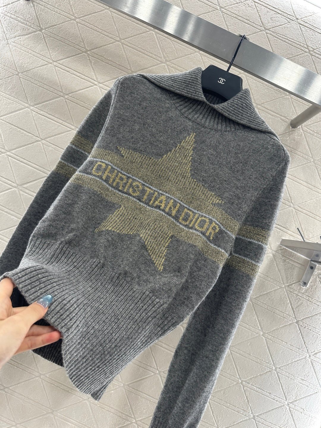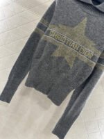 Crafted from cashmere and wool yarn, with a premium texture and comfortable softness, this sweater features a large collar and long sleeved cut. It is tightly knit with intricate details and grooves, providing better insulation and wind resistance. The wide threaded cuffs complement the hem, and the horizontal bar on the chest is embellished with letter hooks ➕ The pentagram pattern decoration highlights the brand’s tone, with a regular shoulder design that is simple and versatile for autumn and winter daily wear, handsome and fashionable.
