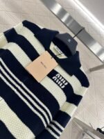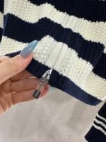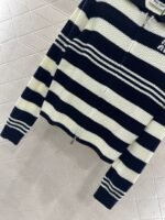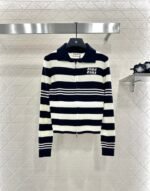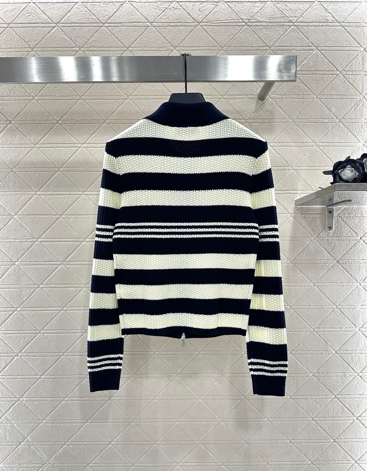 Woven from wool yarn, soft and delicate, with a comfortable texture. Featuring a lapel zipper and cardigan cut, the garment is adorned with elastic threads in the same color scheme, showcasing a unified and coordinated tone. The overall horizontal stripe design echoes the fine stripes on the chest and wrist, creating a rich visual effect and adding artistic flair. The elastic fabric accommodates and decorates the body shape, while the chest logo decoration exudes a simple and sophisticated style, exuding a strong sense of sophistication.