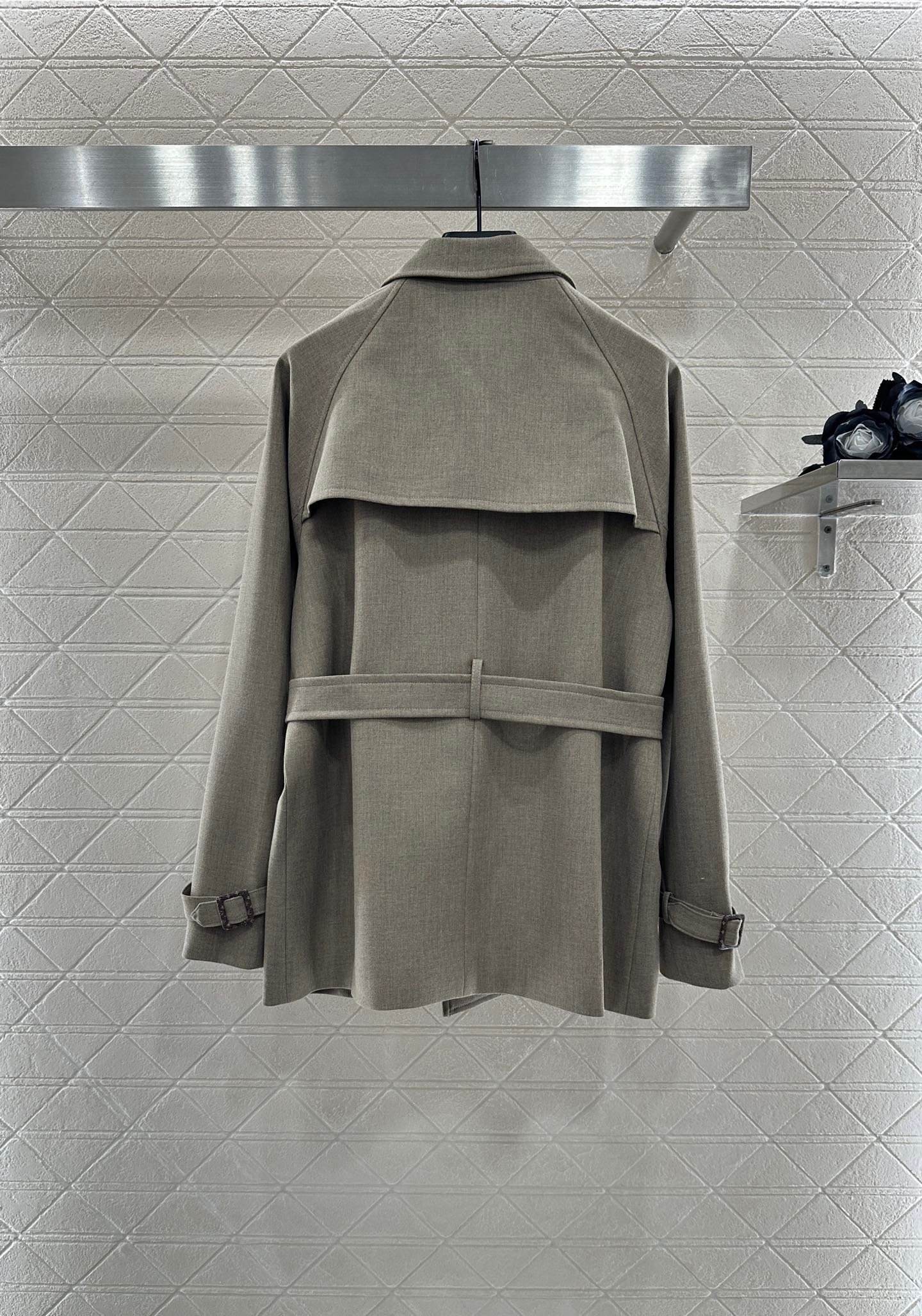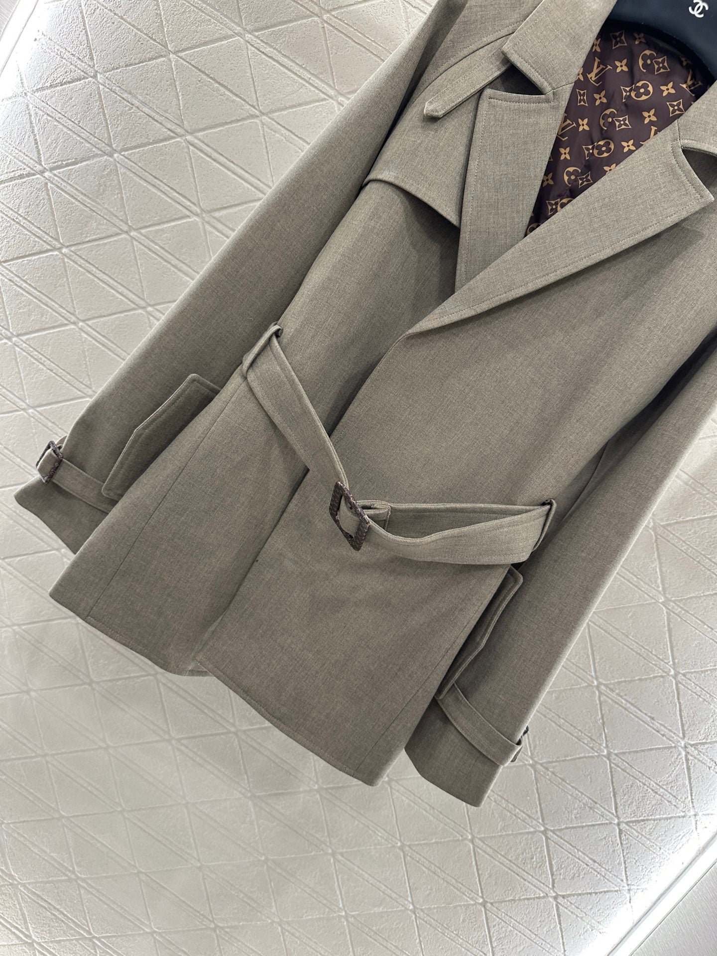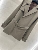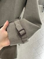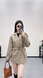 Excellent texture and appearance. The medium to long lapel jacket features a timeless minimalist design with a hidden open collar and a perforated waistband to create a fashionable and high-end atmosphere. The asymmetrical shoulder strap buckle is rich in layers, showcasing the brand’s style. The oat color is stable and versatile, with no restrictions on the style. The straight H-shaped decorative bag accommodates the body and is filled with four leaf clover letters
