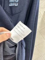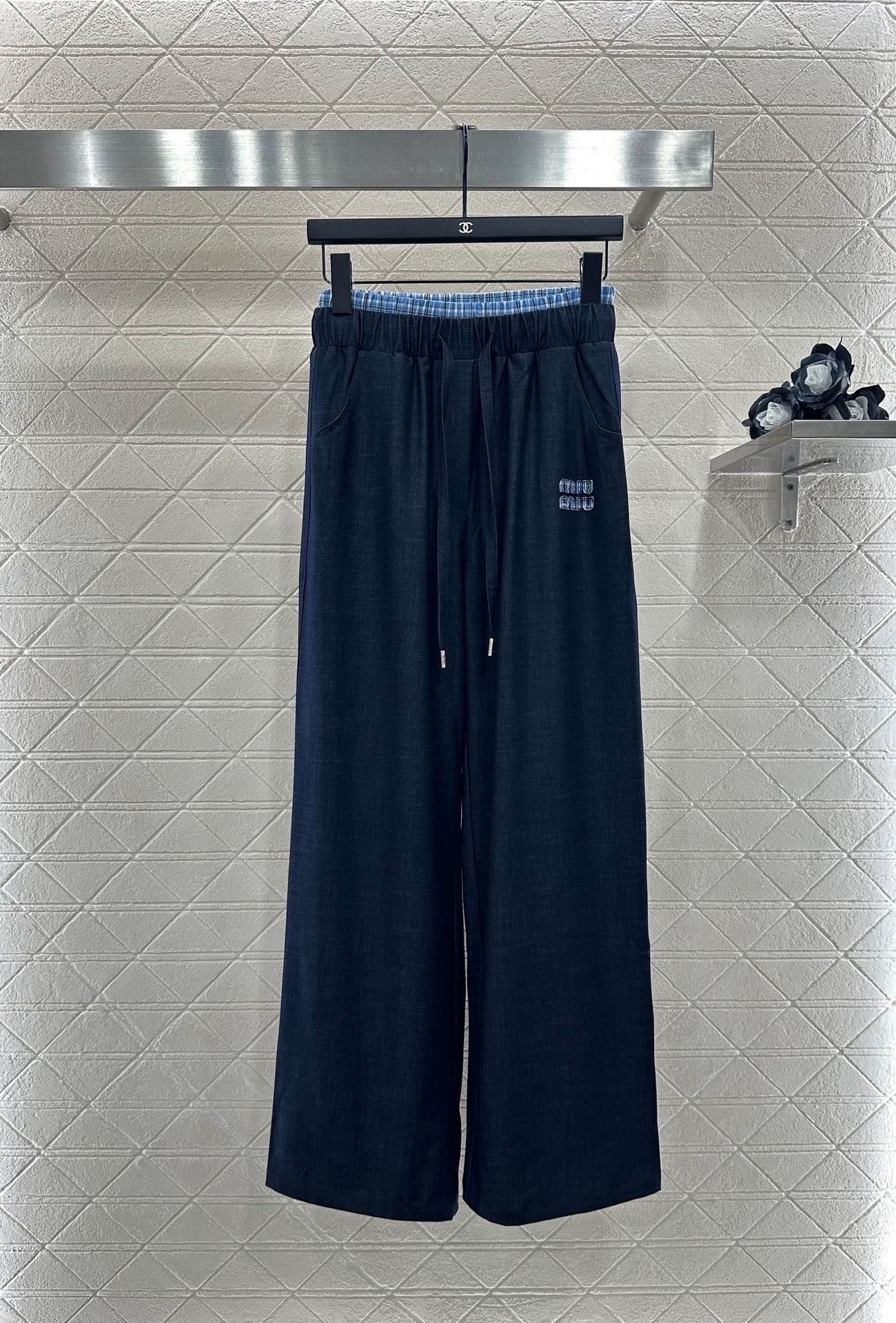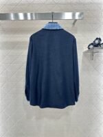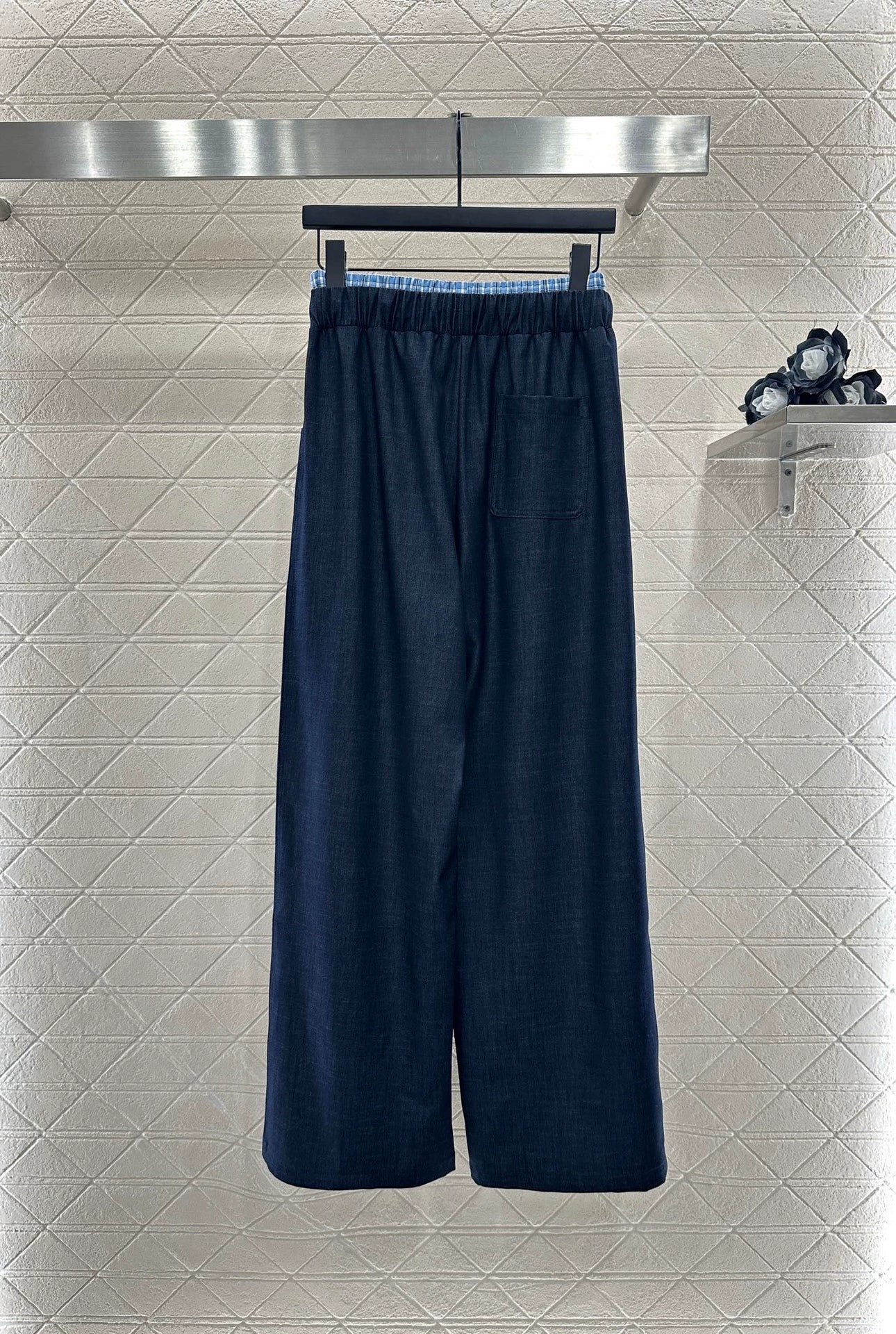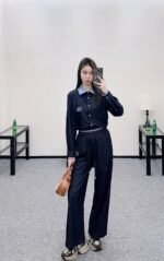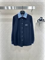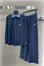 The texture is smooth and comfortable to wear, with a front shoulder lapel shirt and a large retro deep blue silhouette. The loose feeling is full of top decoration. The figure is elegant and exquisite. The pointed collar is matched with blue and white checkered shirt fabric splicing decoration, which echoes the cuffs and waistband to enhance the artistic texture. The cutting details are highlighted by the letter logo, highlighting the brand texture. It is matched with the same series of wide leg drawstring straight leg pants to decorate the leg lines. It is a fashionable and stylish outfit