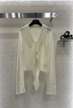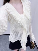 The dense fine needle process presents a clear texture, comfortable and stylish lapel knit top with a versatile cut. The plain color collar surrounds the three-dimensional layered lace extending to the front, and the long edge of the ribbon creates a romantic design sense. The wavy lace edging is matched to form a matching diamond grid texture throughout the body, enhancing the texture and increasing the brand style. The regular slim fit version is full of Korean style on the upper body