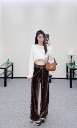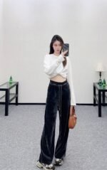 Velvet material fabric is soft and comfortable, with a flowing and stylish design. The high waisted drawstring and wide leg pants are designed with a snug elastic webbing to decorate the waist and a twisted drawstring to create a casual effect. The relaxed and stylish pants feature a signature letter logo at the waist, instantly enhancing the brand’s style and making it easy to control. The three-dimensional edges of the pants legs outline the contours, while the wide leg pants are treated with inclusiveness and embellishment of the leg shape