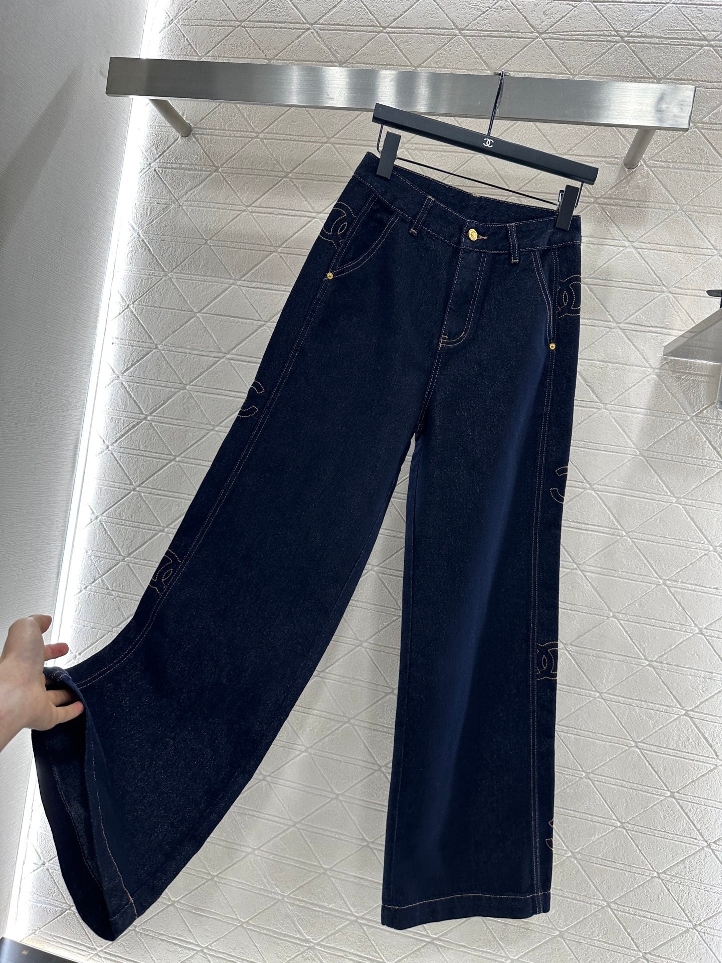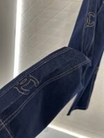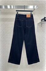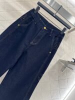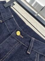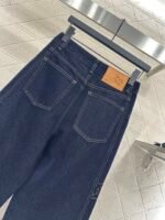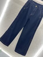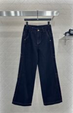 Twill cotton denim material texture is crisp and stylish, with wide legs and straight leg pants. The overall body is washed with enzymes, evenly dyed, retro deep blue, versatile and durable. It is suitable for autumn casual wear. The outer side of the legs is embroidered with a double C letter pattern, and the three-dimensional cutting capacity increases. It is more eye-catching and fashionable, and the engraved letters on the back waist echo the exquisite and durable details. It highlights the brand style and fashionable style