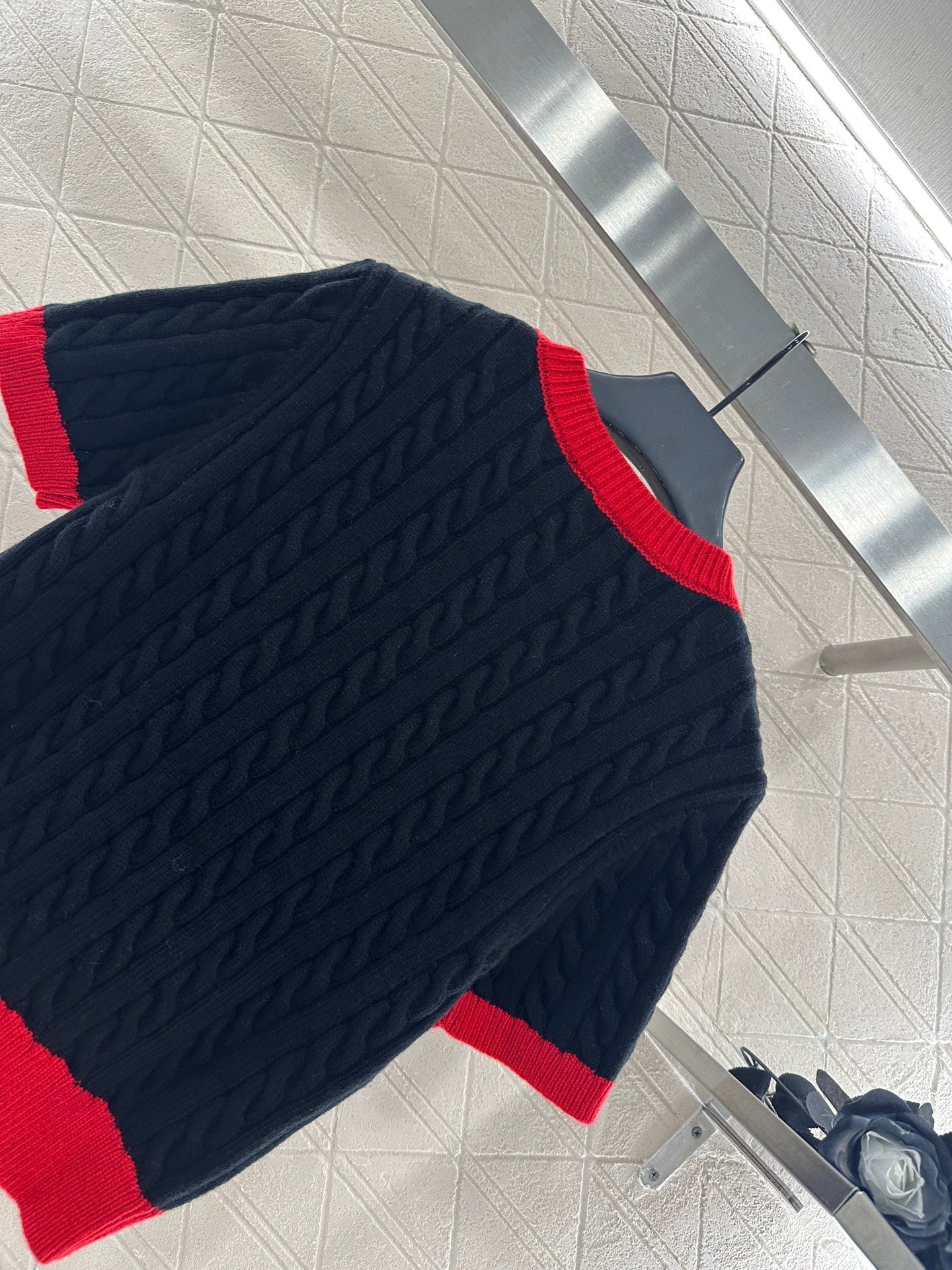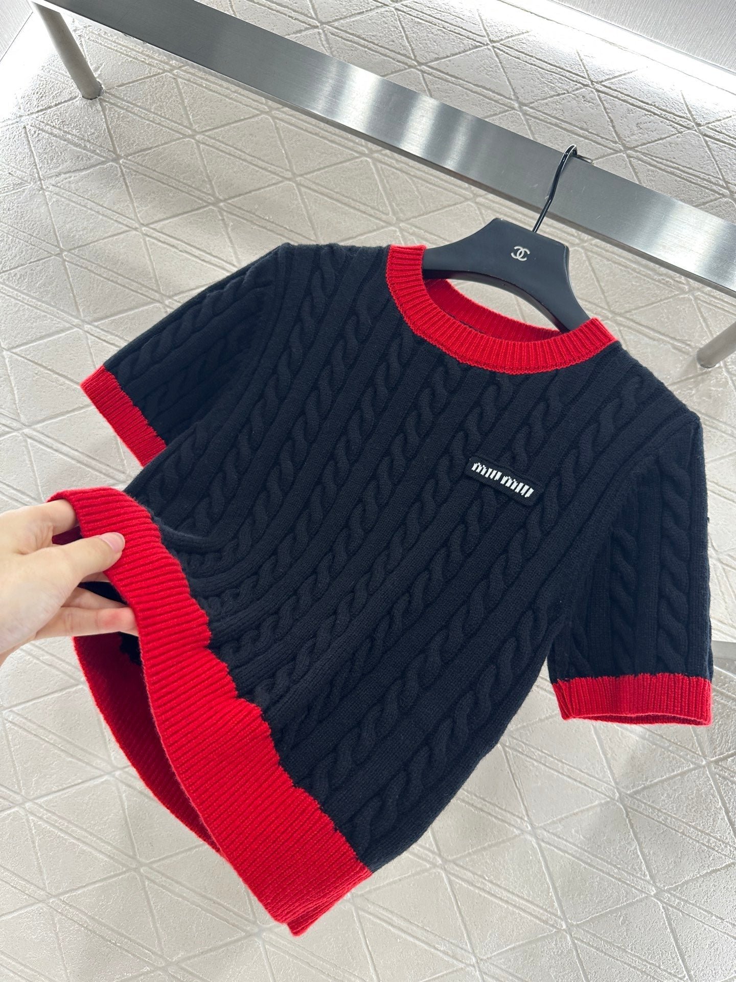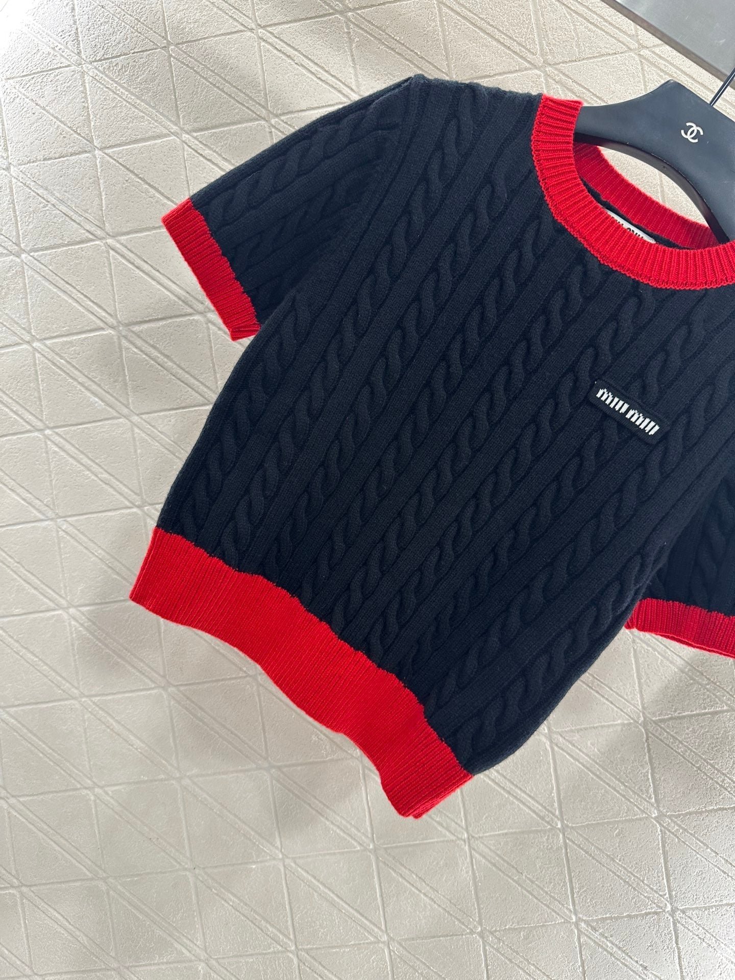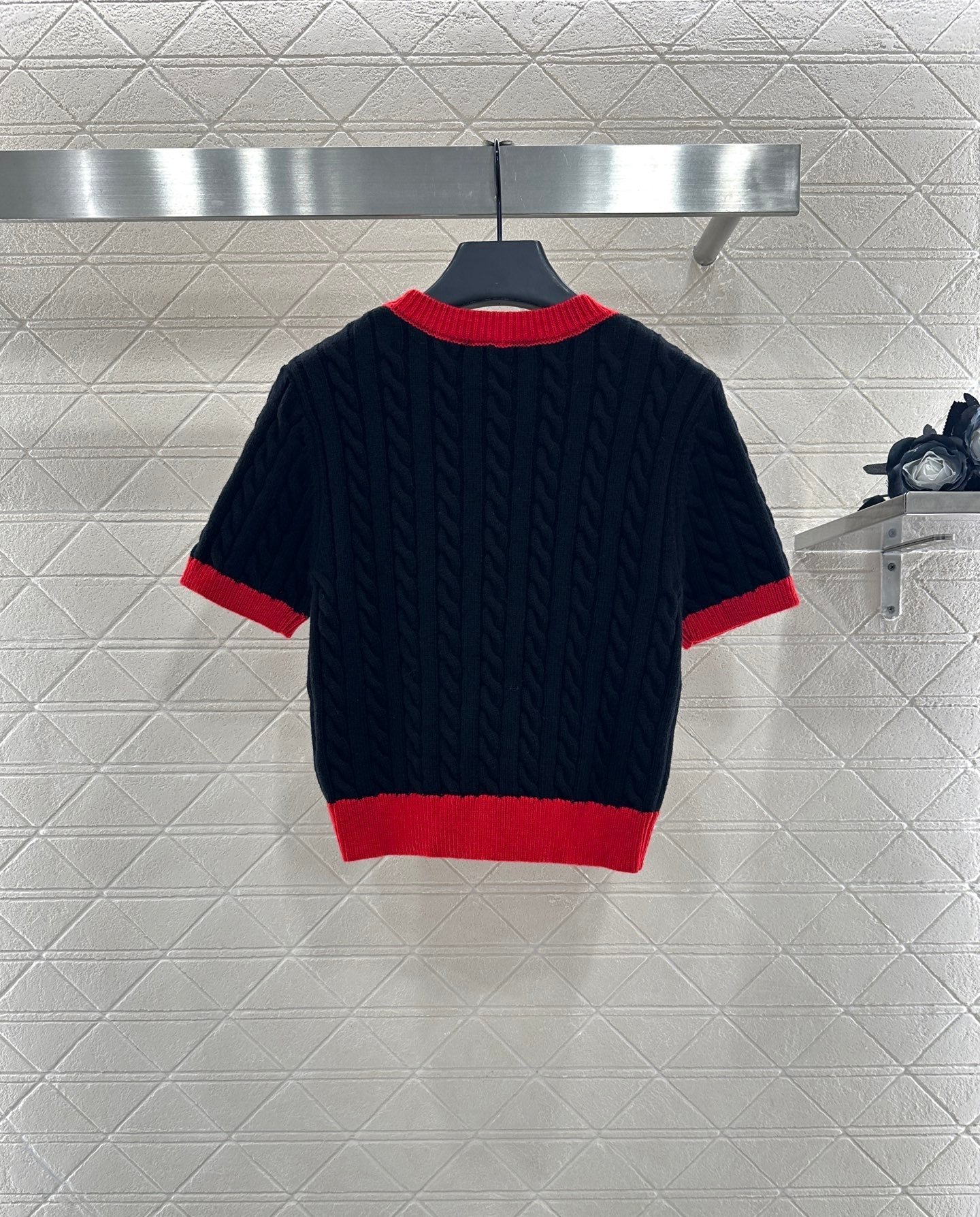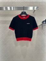High quality, comfortable, soft, round neck, knitted short sleeves, cut vertically all over the body, Fried Dough Twists crochet texture, large body, thread binding on the collar and cuffs, forming red and black color collision, durable, easy to highlight full details, texture, letters, brand logo, embroidery, embellishment of the chest, delicate, stylish, versatile, shoulder fitting, inclusive, fashionable and casual