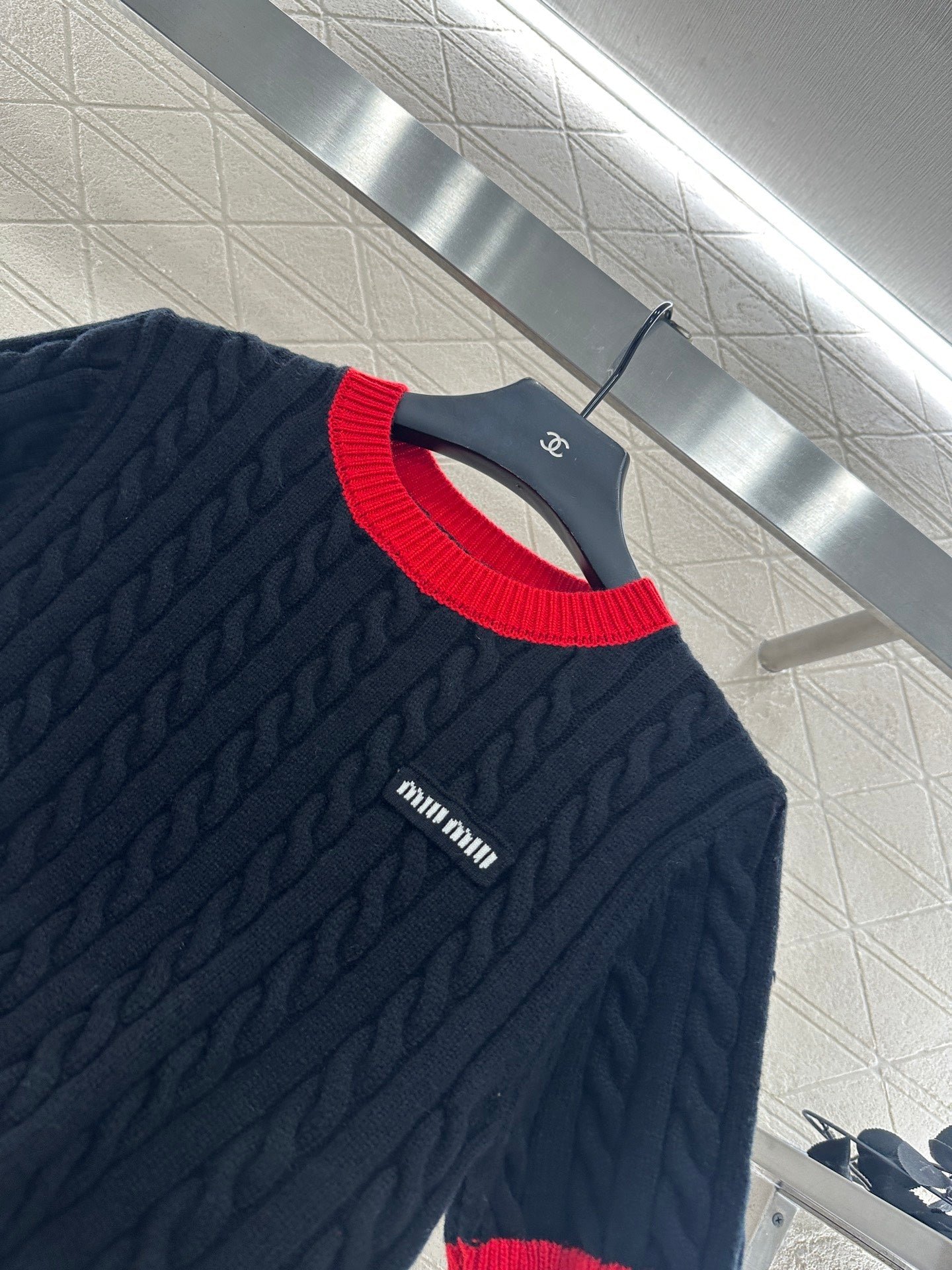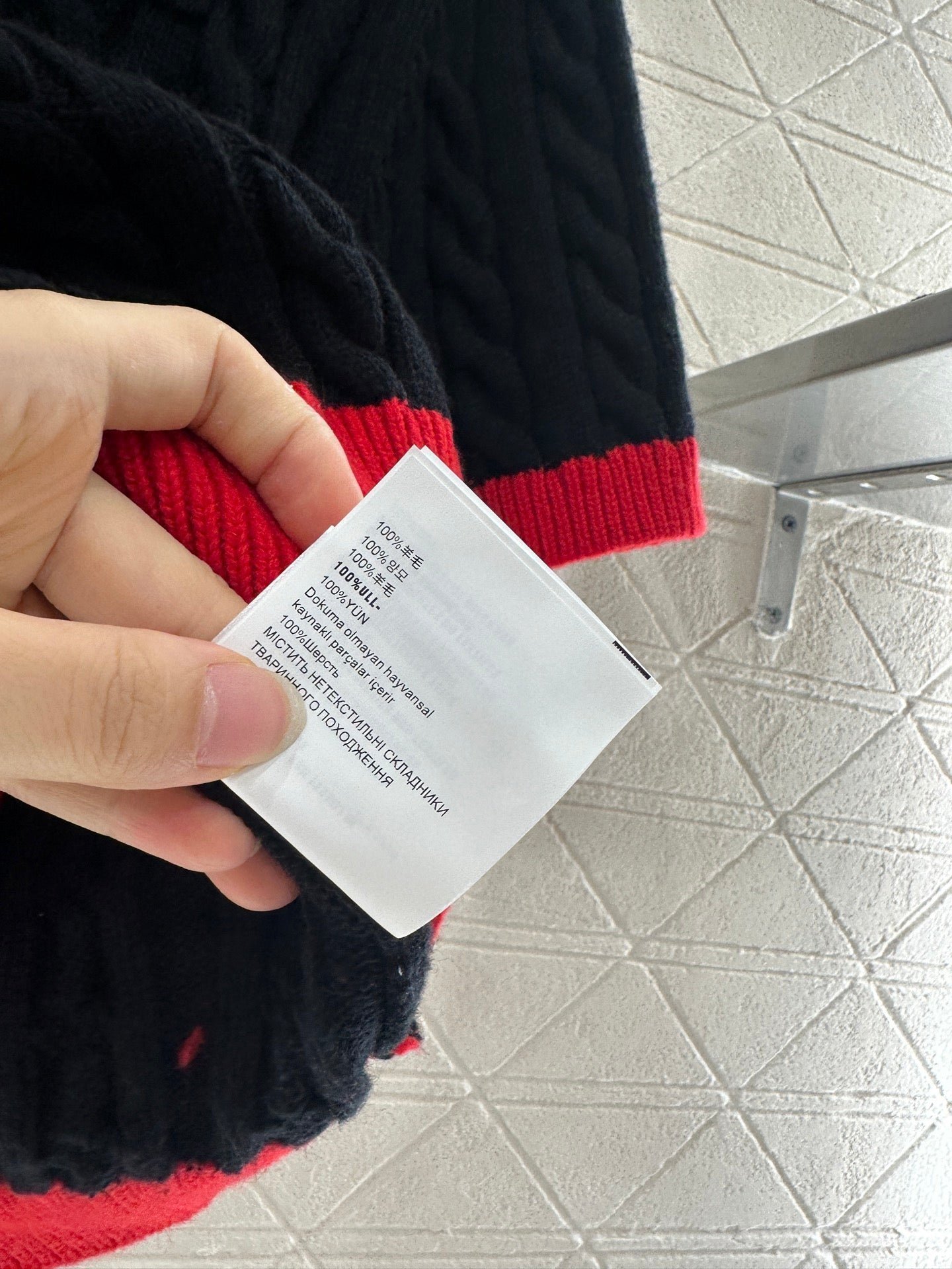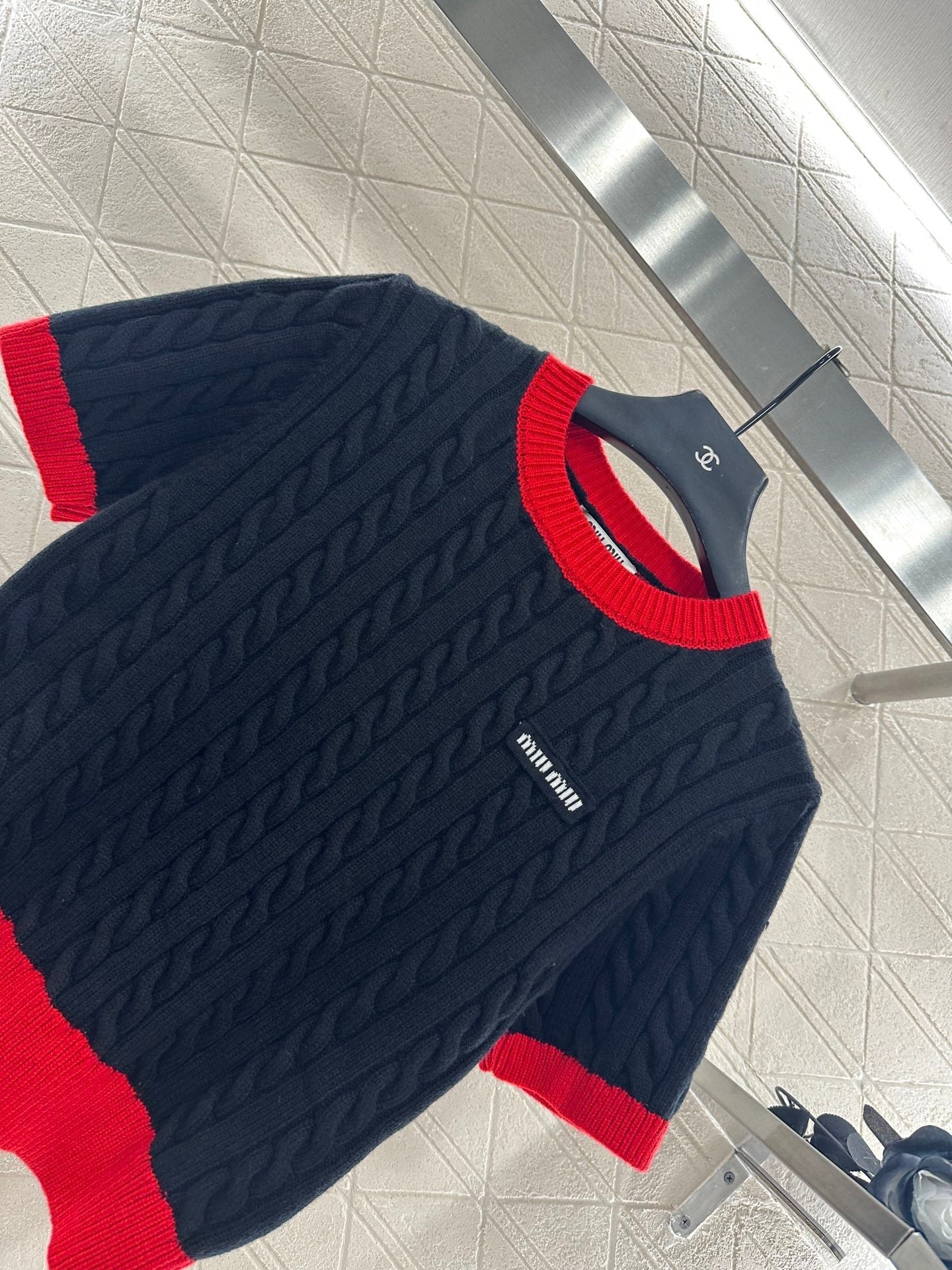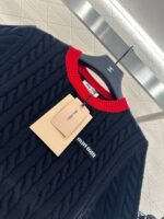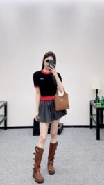 High quality, comfortable, soft, round neck, knitted short sleeves, cut vertically all over the body, Fried Dough Twists crochet texture, large body, thread binding on the collar and cuffs, forming red and black color collision, durable, easy to highlight full details, texture, letters, brand logo, embroidery, embellishment of the chest, delicate, stylish, versatile, shoulder fitting, inclusive, fashionable and casual