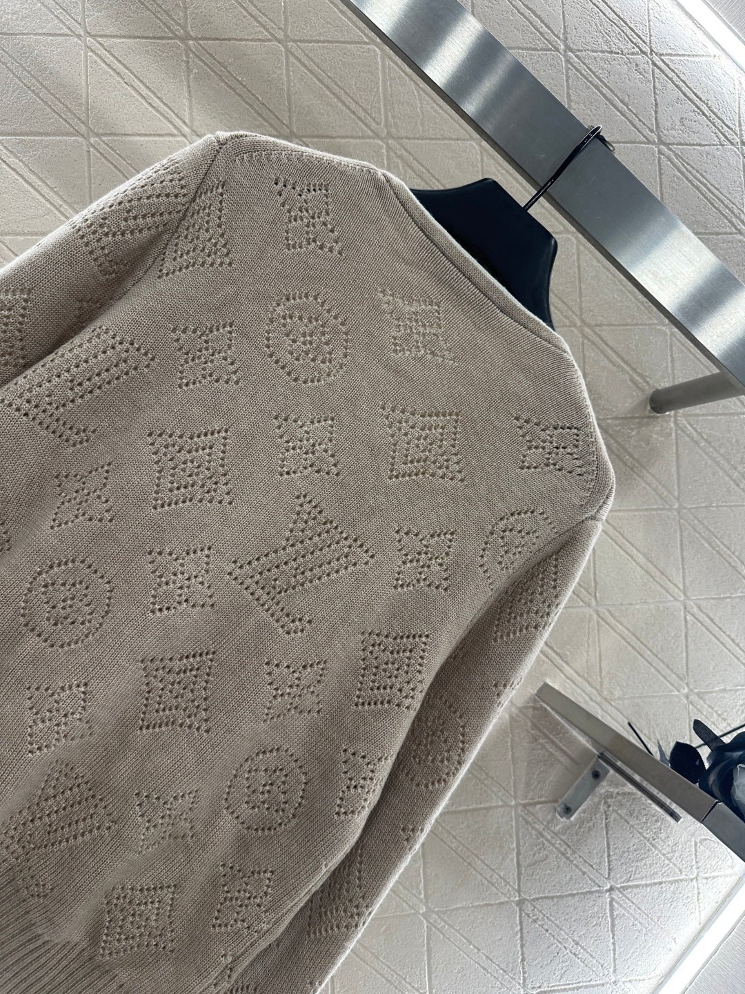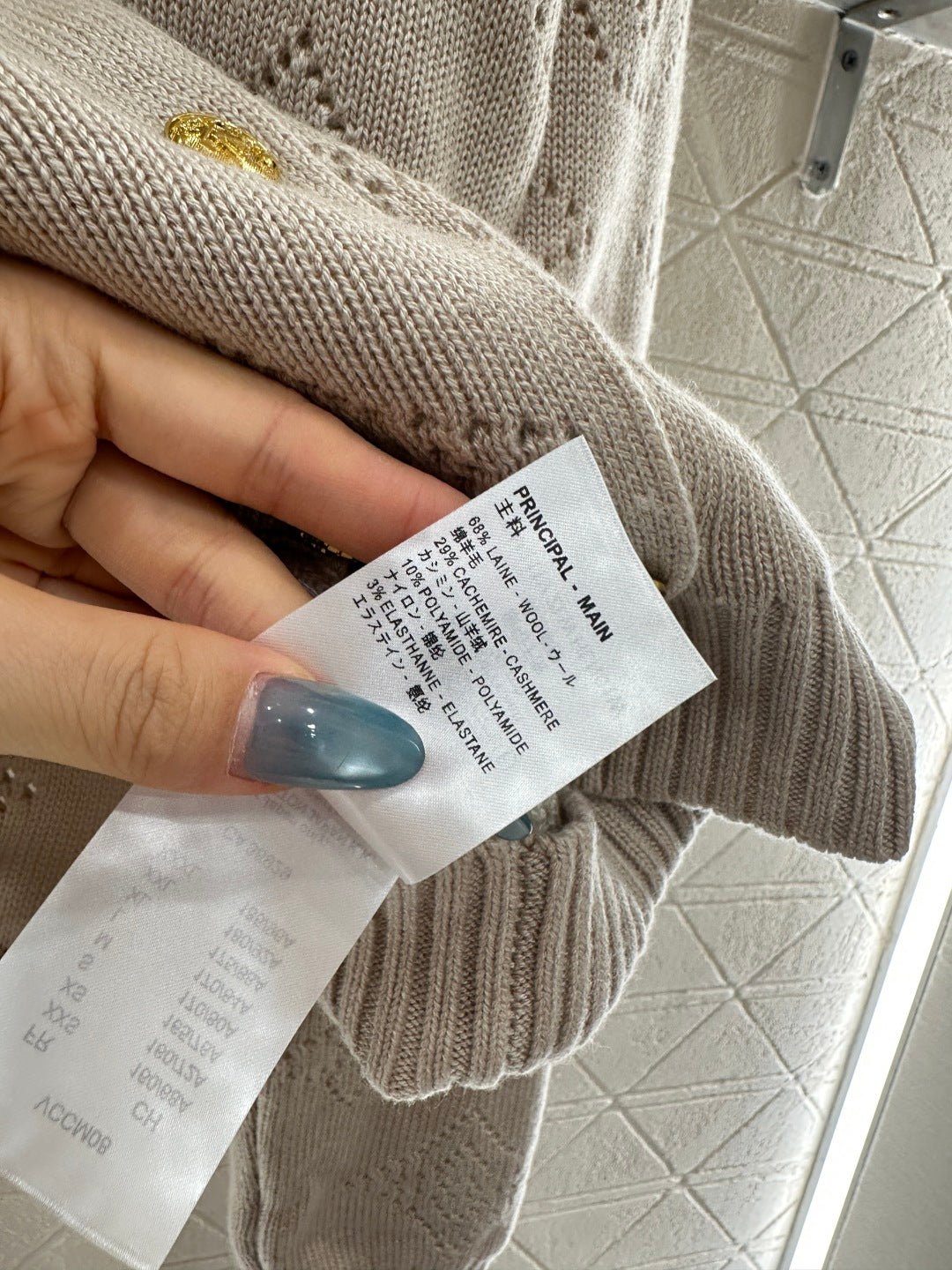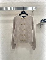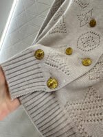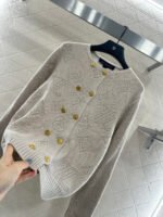 Woven from cashmere and wool yarn, with a premium texture and comfortable softness, this round neck shoulder long sleeved knitted cardigan features a unique double breasted design. The hollowed out texture outlines the letter logo and four leaf clover elements, complementing each other in a fashionable and charming way, highlighting a gentle temperament. The edging is tightened with elasticity, highlighting a high-end tone. The regular style decorates the body, making it a simple and versatile piece for daily use throughout the four seasons.