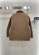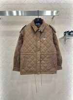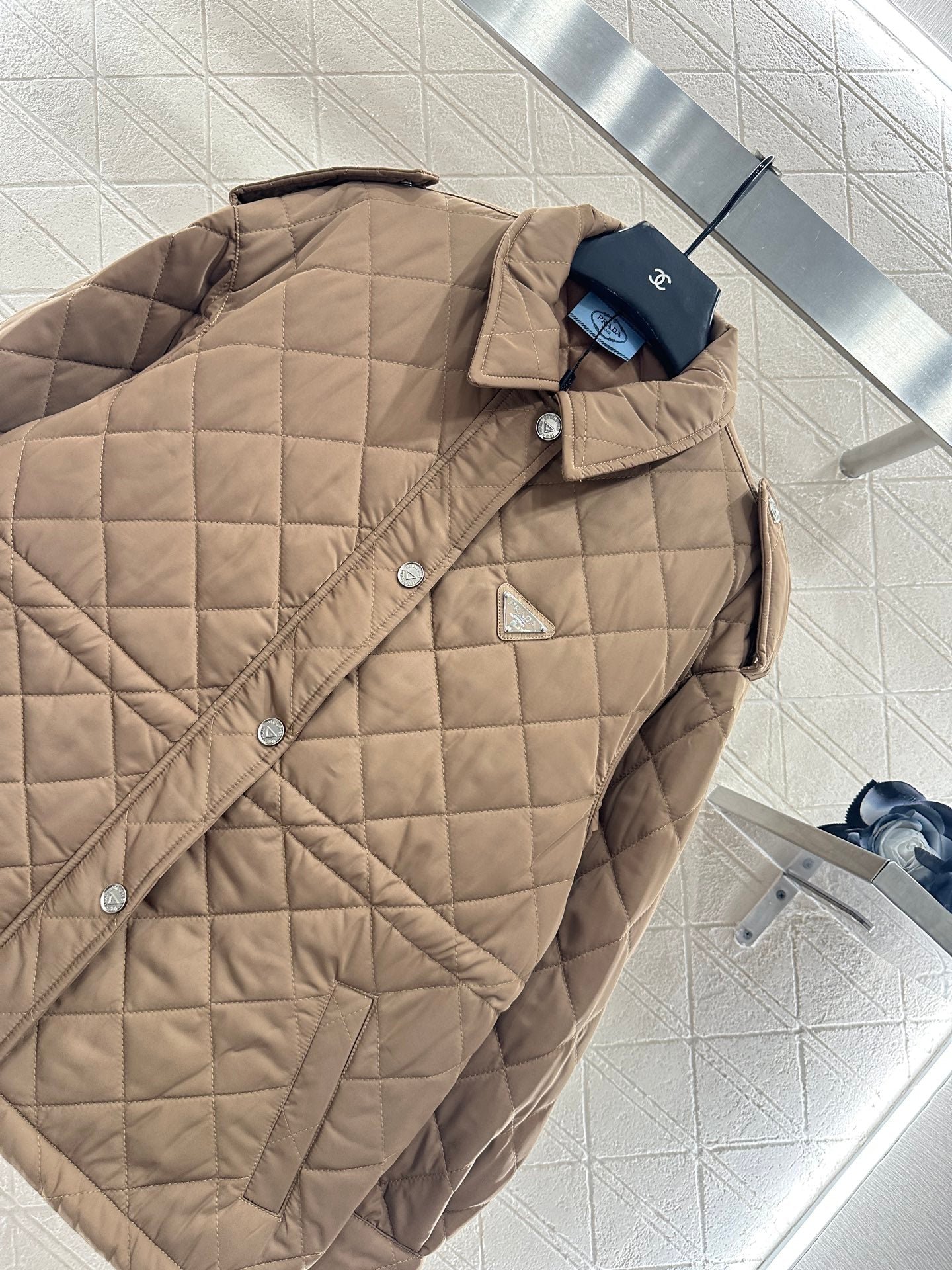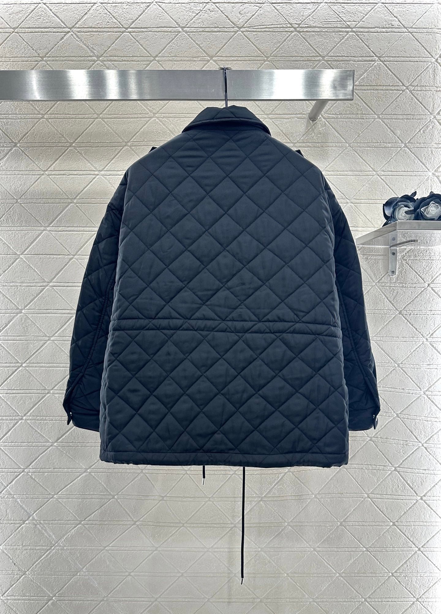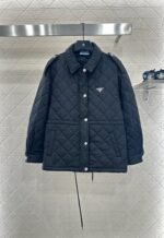 Windproof and waterproof nylon material, its craftsmanship is restored, the material is upgraded, and the function of keeping warm in autumn and winter is enhanced. The down cotton filling inside makes the whole piece lightweight and warm. The zipper opening design and shoulder cuff buckle edge contour treatment. The whole body adopts diamond grid embossed pattern, with slanted pockets to warm hands and increase capacity. The design is rich and practical, and the elastic drawstring at the waist of the hem can be adjusted to outline curves for a more fitting and inclusive fit, with full details. The standard triangle logo on the chest highlights a low-key and high-end feel, successfully demonstrating quality and breaking free from dullness, integrating warmth and fashion.