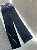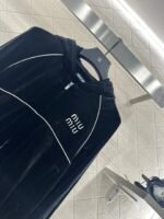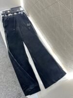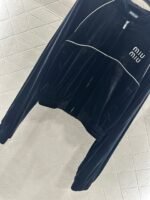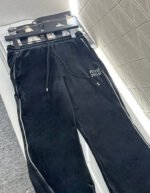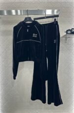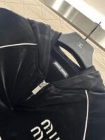 Velvet material, glossy texture, comfortable drape, hooded drawstring zipper jacket, handsome and full of fashionable style. The contour line is white with tied edges, and the letter logo is designed in a simple way to showcase the brand’s style. When worn, it shows off its personality and style. Paired with the same series of drawstring wide leg straight leg pants, the outer webbing of the legs echoes, modifying the leg shape to appear thin and relaxed. The complete set of matching is more brand charming and fashionable.