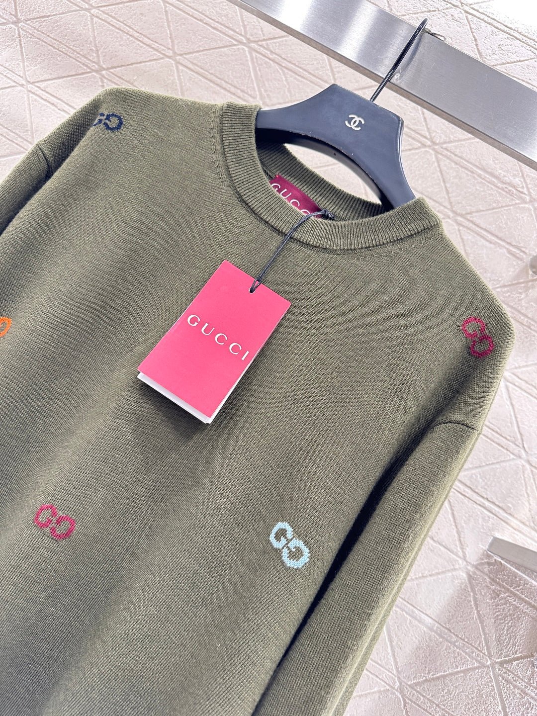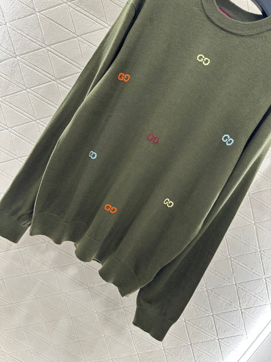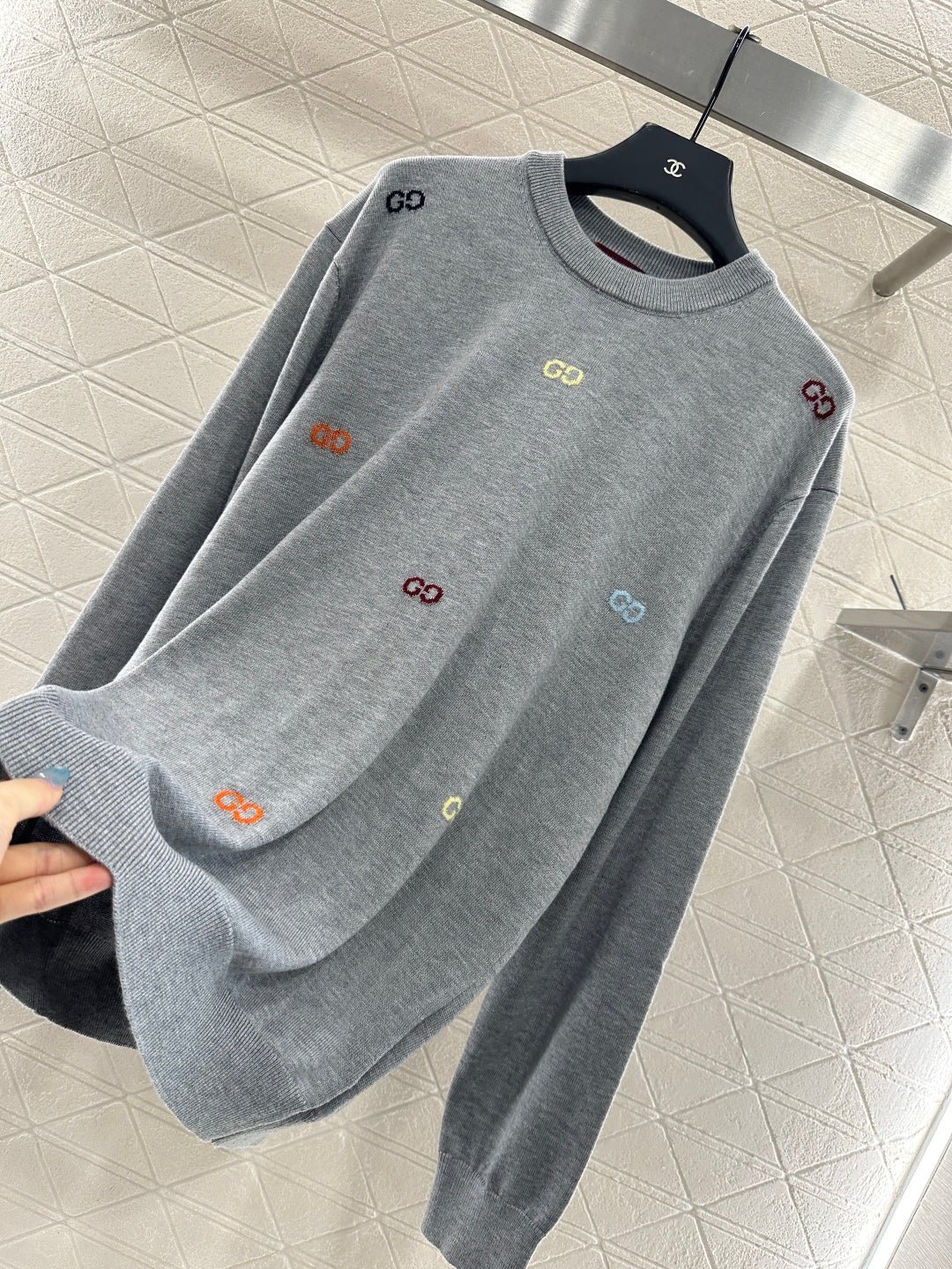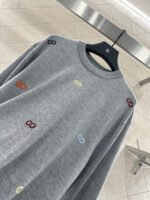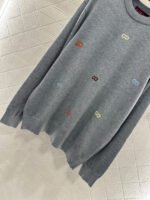 Woolen yarn weaving, premium texture, comfortable and soft, round neck knitted pullover sweater cut, overall artistic gray black ➕ Colorful double-G color scheme, combined with threaded edging, easily highlights the perfect detail texture, exquisite and stylish, making the outfit elegant and fashionable. Loose silhouette oversized shoulder design, accommodating body shape, fashionable and casual to wear.