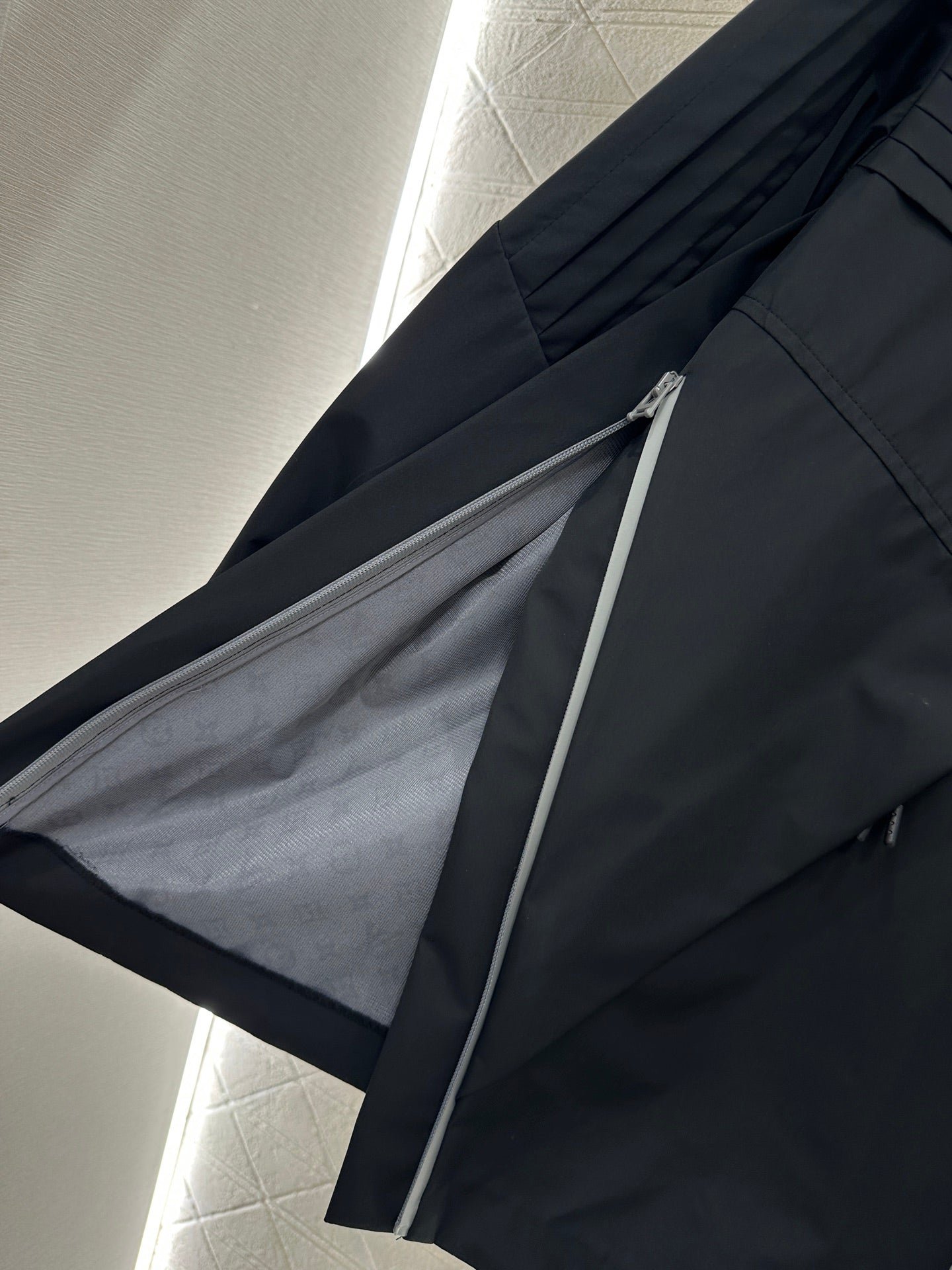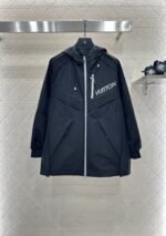 Sturdy nylon material texture, high-end, crisp and stylish hooded zipper jacket with symmetrical distribution, diagonal cutting, pleating lines, relaxed neutral coordination, contrasting color zipper, full of outdoor leisure atmosphere, medium long silhouette, oversized hem presenting natural micro A expansion with drawstring elasticity, easy to adapt to body shape, single-sided letter emblem and lining fully covered with four leaf clover letters echoing the old money style, lighting up details