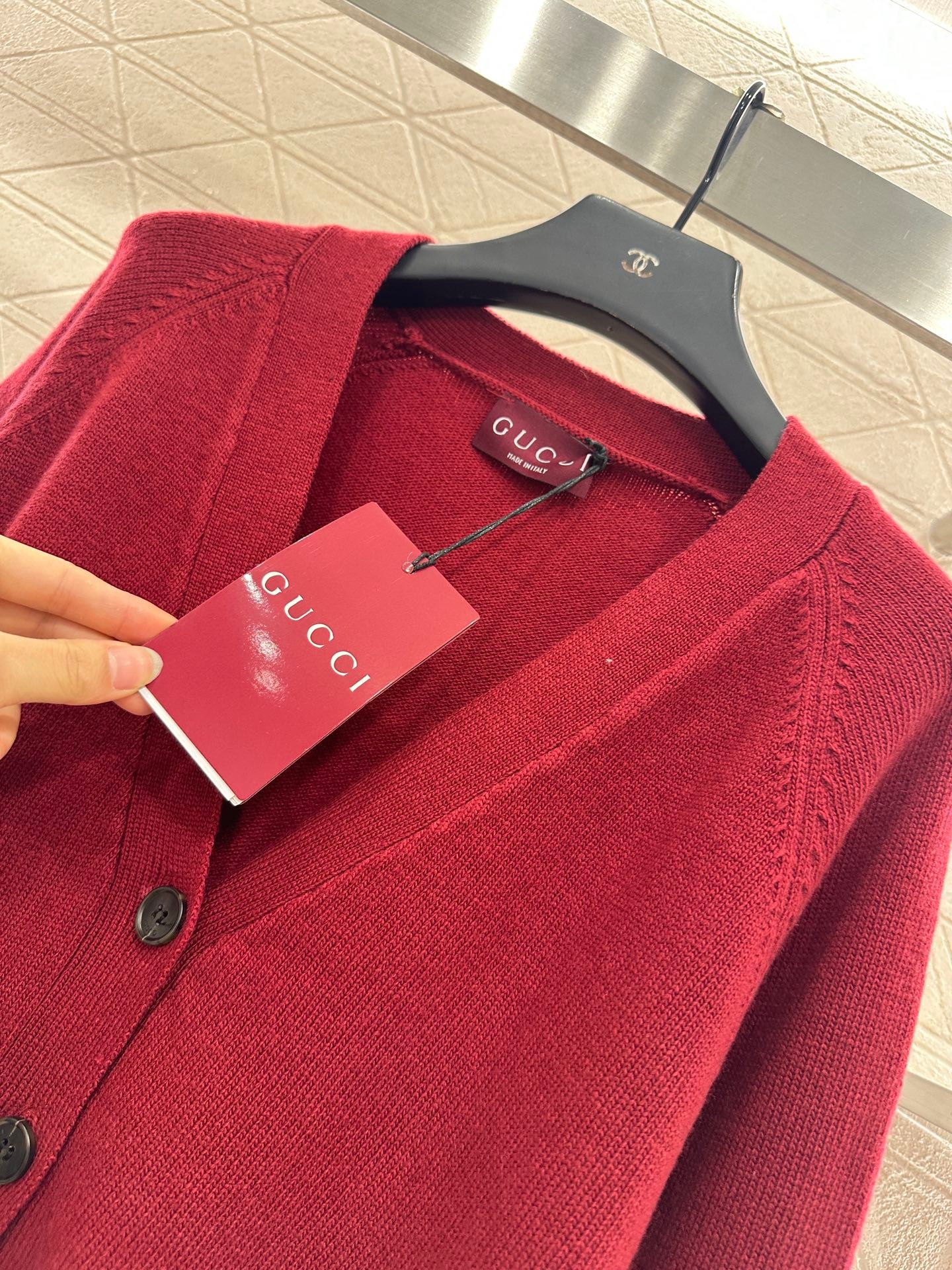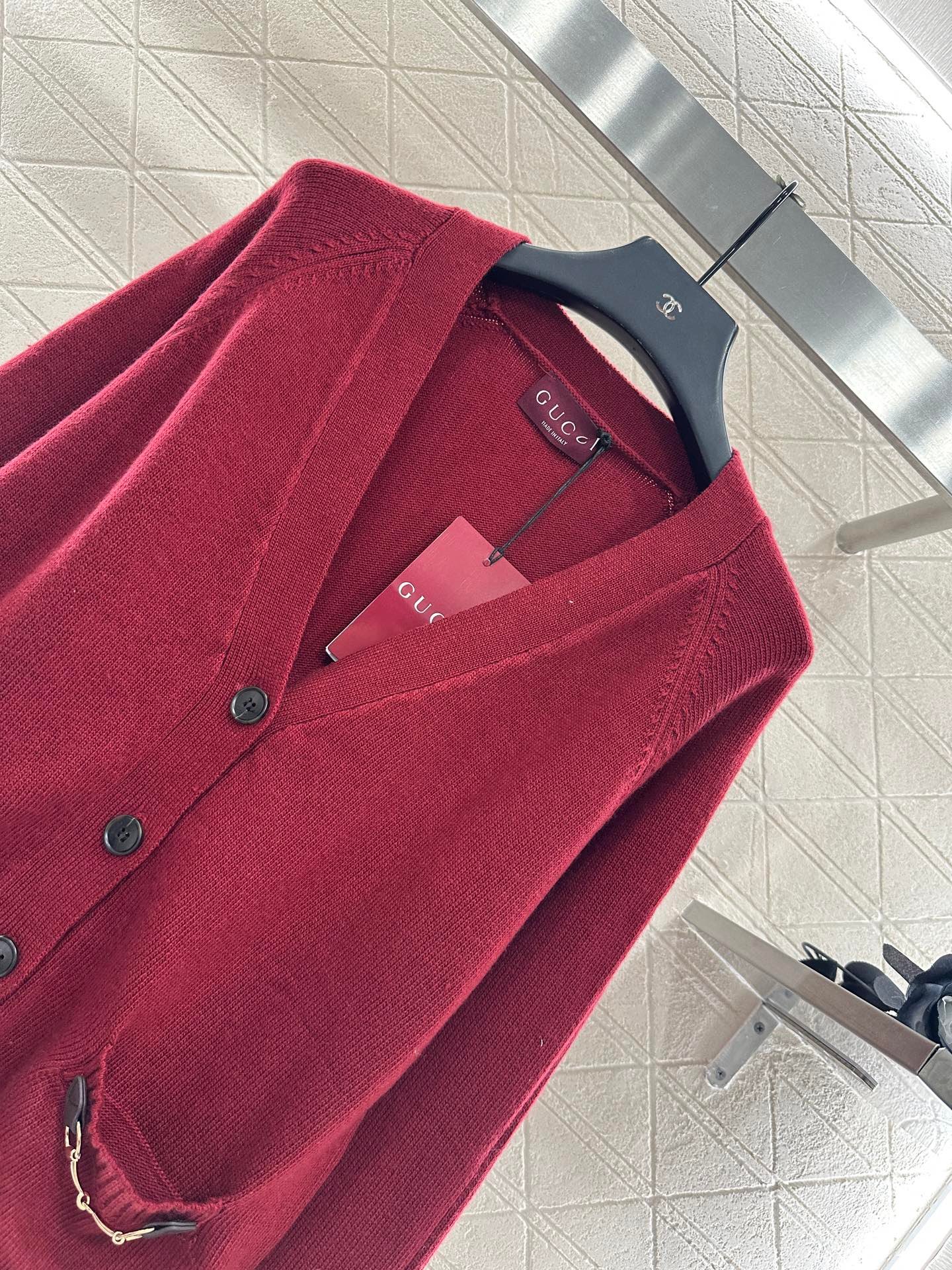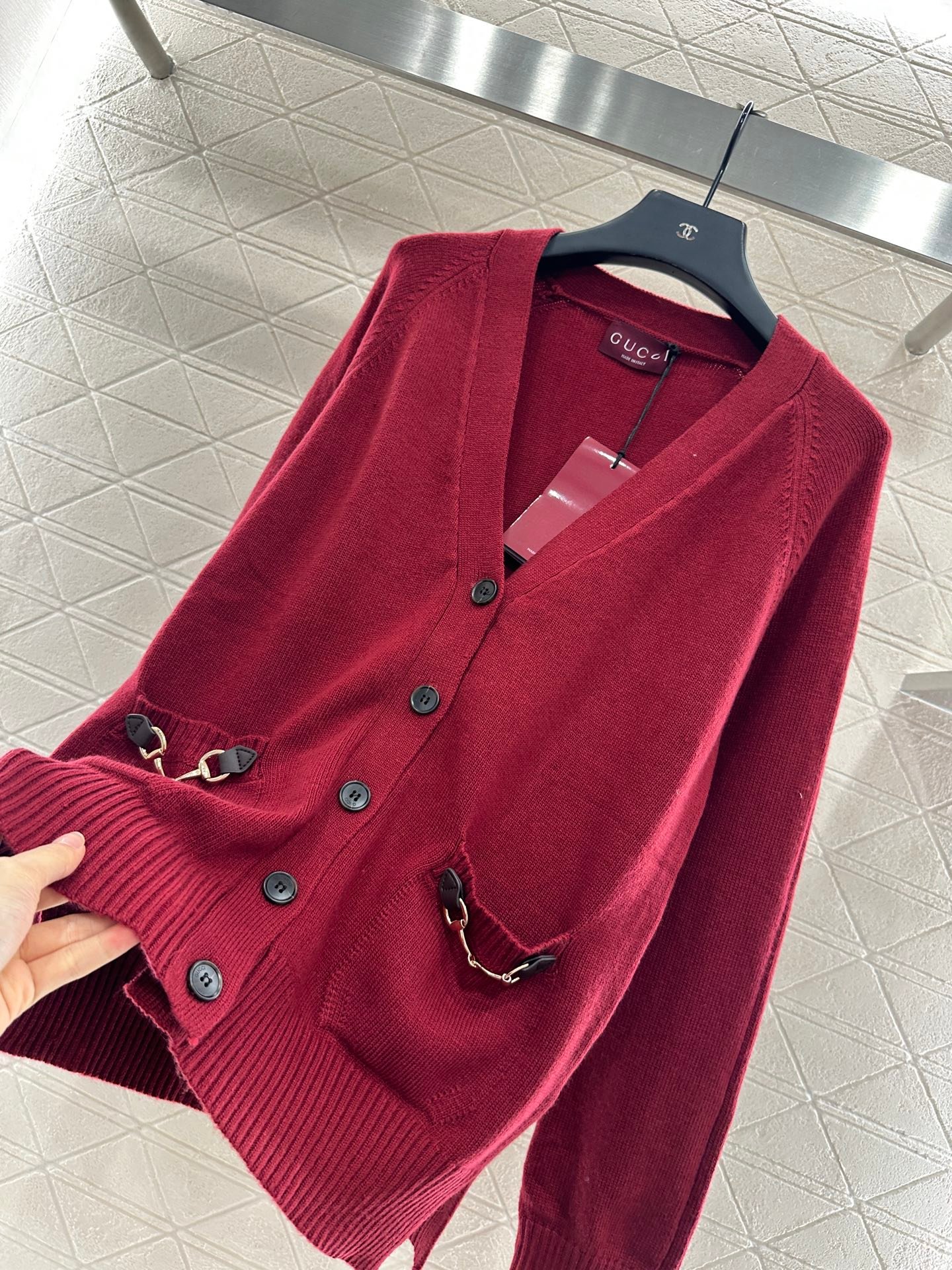 High quality, comfortable, soft V-neck knitted cardigan cut in Angora red color with threaded edging, easily highlighting full marks of details. Texture leather horseneck buckle decoration in the pocket is exquisite and stylish, making the outfit elegant and fashionable. Regular shoulder design, accommodating body shape, fashionable and casual