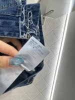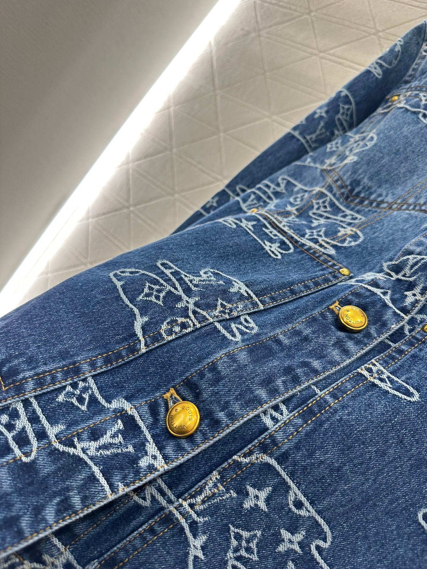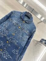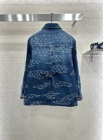 Cotton denim fabric, excellent breathability, soft and skin friendly, with a lapel jacket and straight leg pants set. The whole body is washed with enzymes to create a natural polished white deep blue color. The irregular positioning distribution of auspicious cloud contours is embedded with jacquard technology, and the four leaf clover and letter patterns are laid out, giving a strong sense of old money. The front shoulder line of the top is matched with symmetrical pockets and style cuts, highlighting a straight and neat posture. Paired with straight leg pants of the same series, the checkerboard leather logo on the waist and hips highlights the fashionable charm. The design details echo up and down, making the outfit more coordinated and high-end, full of style.