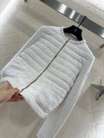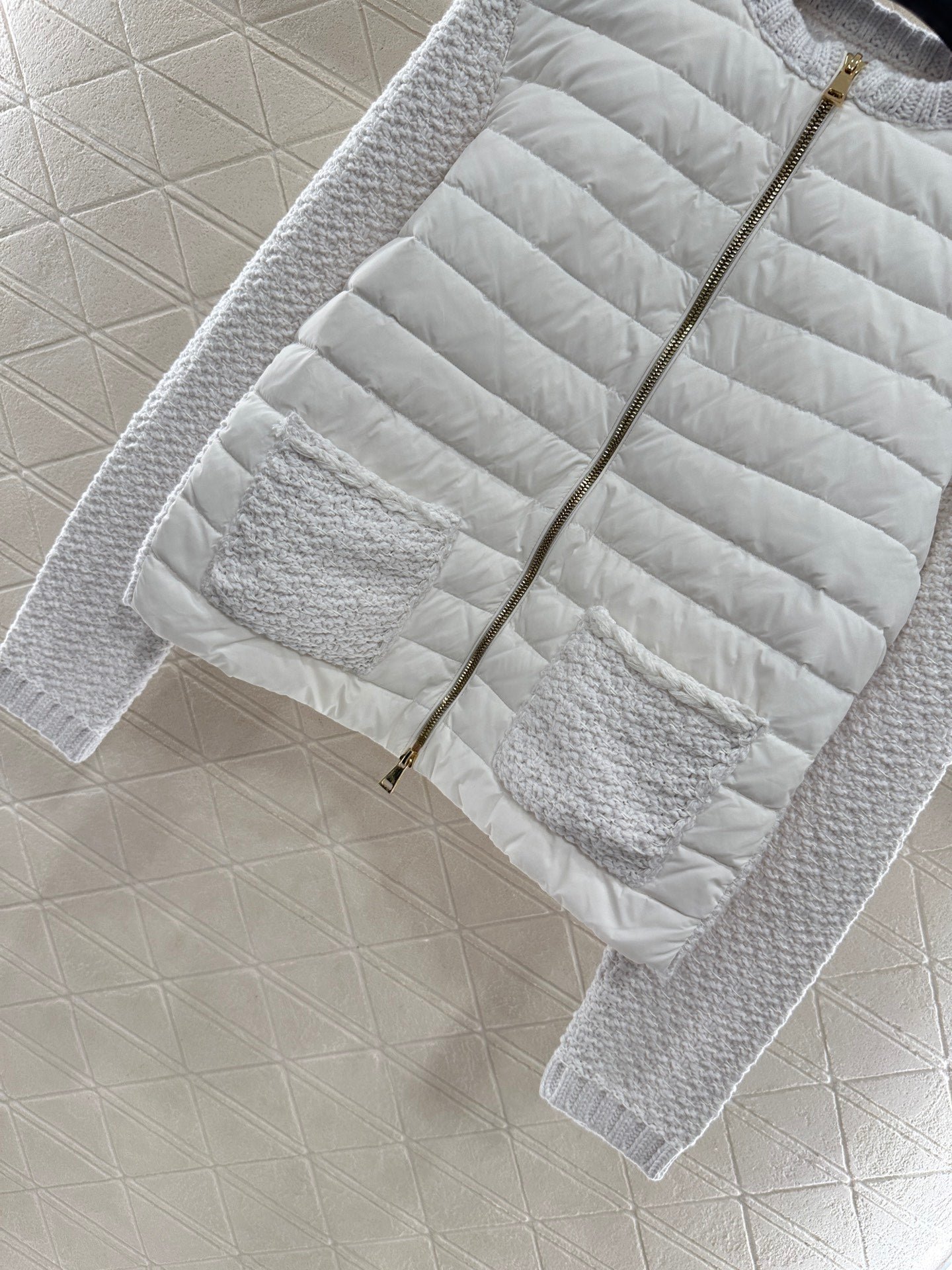 Combed knitted cotton ➕ Made of wool material, its craftsmanship is restored and upgraded, with crochet grain texture and windproof performance, adding extra points for keeping warm. The interior is filled with white goose down, making the whole piece lightweight and warm. The zipper stand up collar design, classic rectangular embossed treatment on the torso, versatile dressing styles, and arms ➕ edge binding ➕ Pocket splicing knitted flat needle texture, full of elasticity, more snug and warm. The iconic logo on the side arm is embellished, highlighting a low-key and high-end feel. Exquisite details can successfully break free from dullness, combining warmth and fashion,