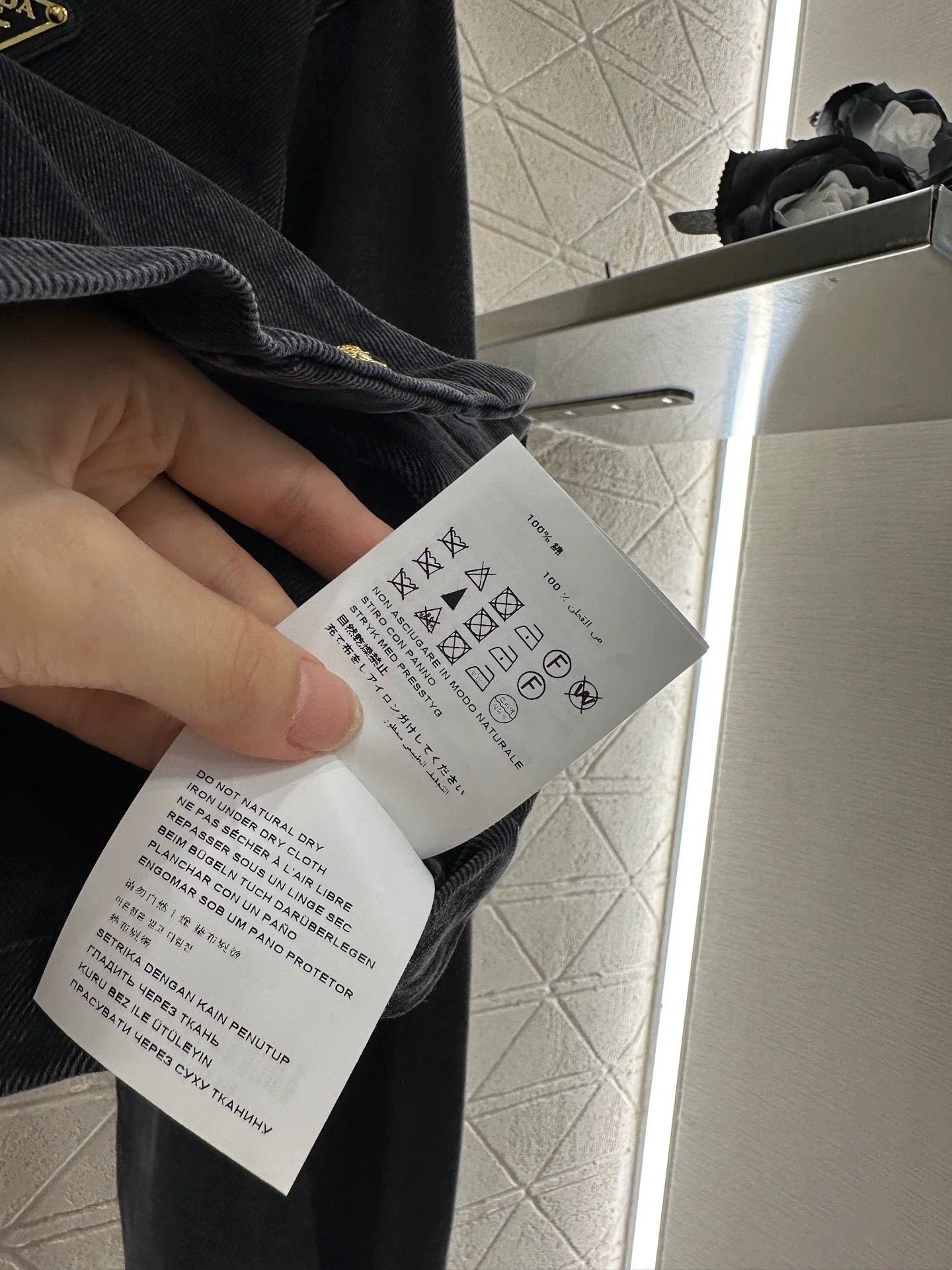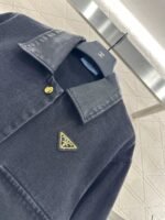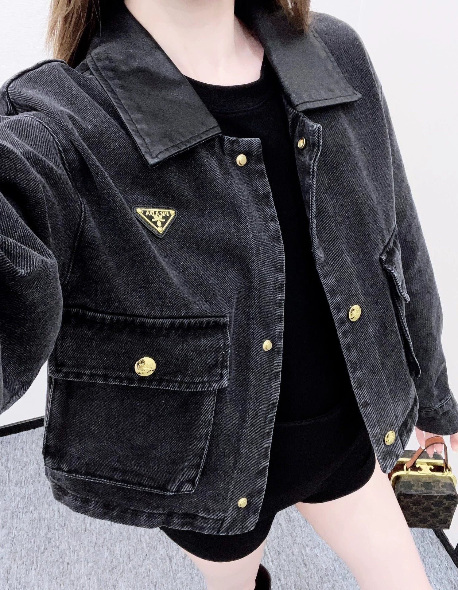 Twill cotton denim material texture retro outfit stylish multiple enzyme washed retro charcoal black flip pocket jacket cut collar edge splicing leather material collides with the body, matched with triangular metal logo on the chest and flip pocket