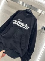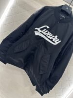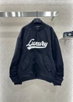 Windproof and waterproof nylon material, high-quality texture, full of appearance. The baseball jacket is cut with a black base throughout the body, and the elastic thread narrows the edge, making it more neat and close to the body. The letter logo on the open chest is full of artistic sense, filled with cotton inside, symmetrical flip pockets, keeping warm and stylish. The style is low-key and fashionable, with a full tone, easy to match, and a high-end and fashionable style.