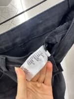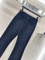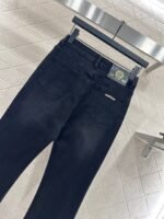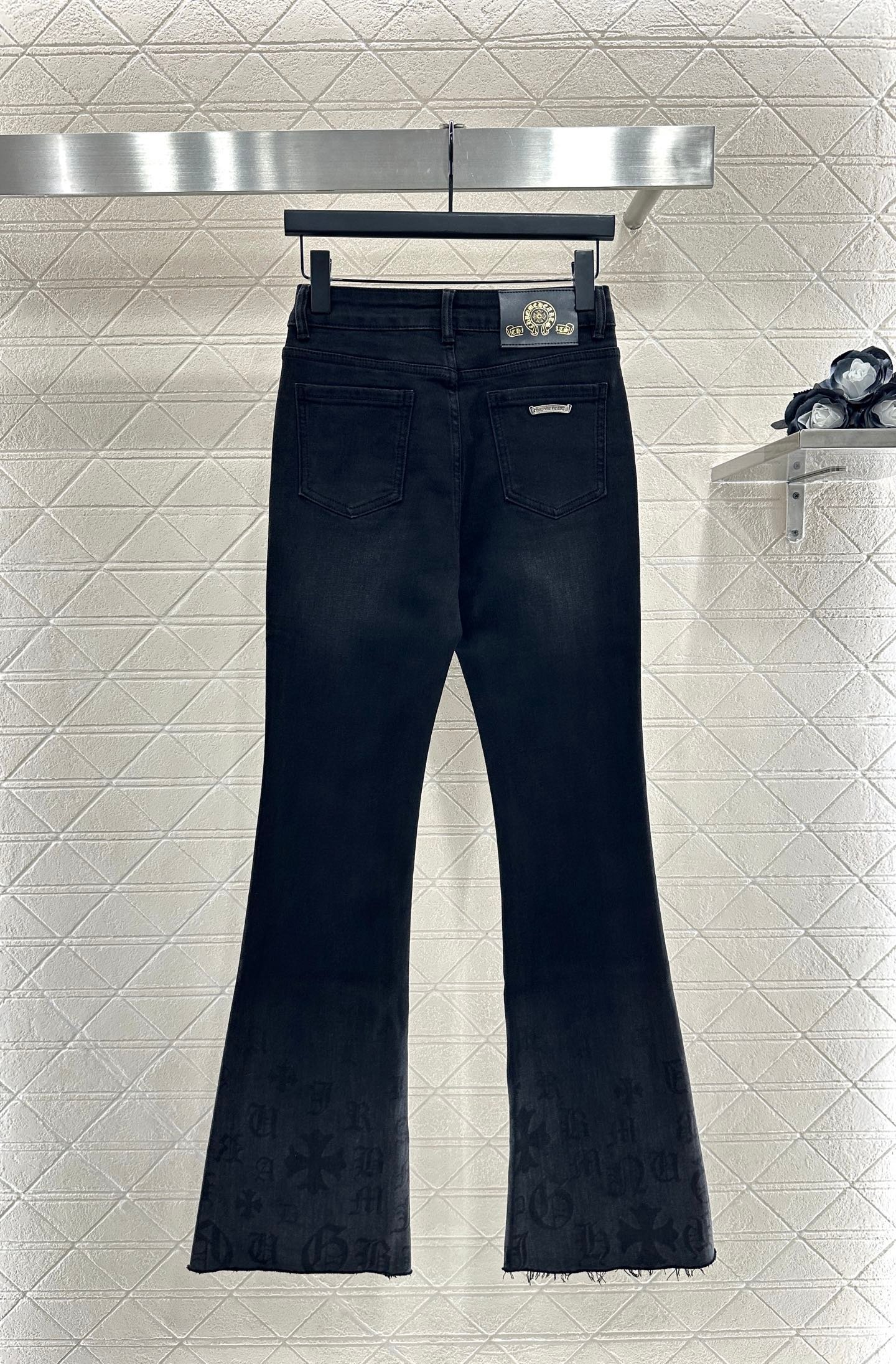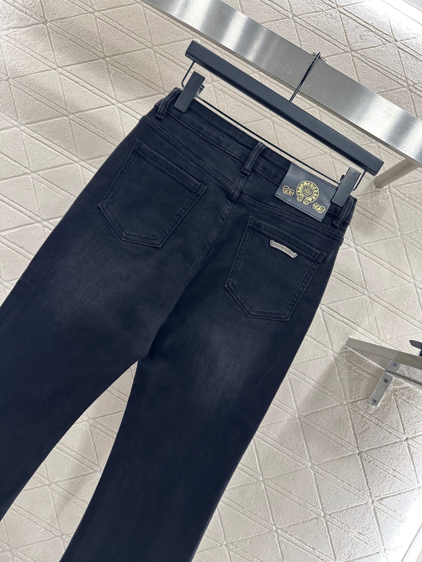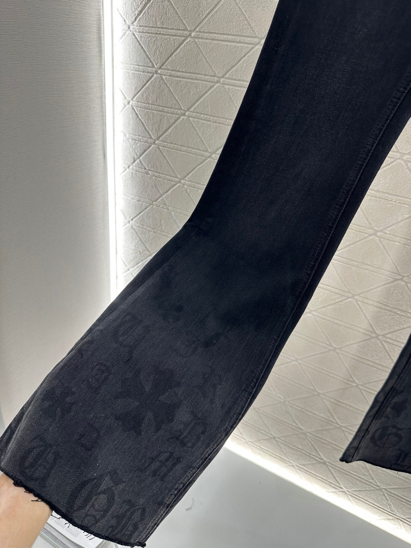 The twill cotton denim material is soft, comfortable, elastic, slim fitting, and treated with repeated enzyme washing technology. The thigh area presents a natural strip-shaped rubbing texture, and the high waistband buckle is designed with double pockets. The laser cross pattern at the bottom of the pants legs is embellished with an iris cross at the back pocket, echoing the brand’s style and instantly enhancing it