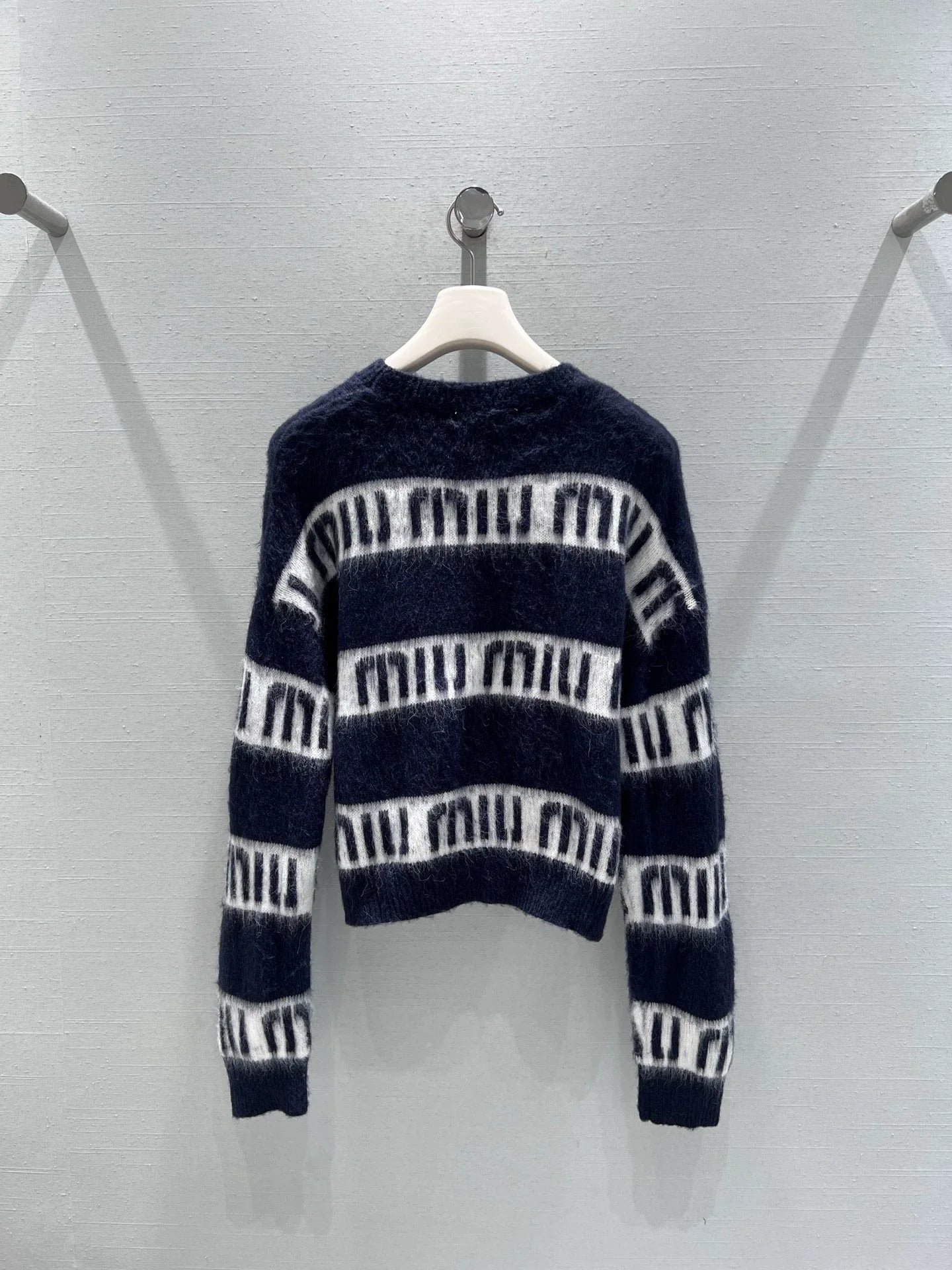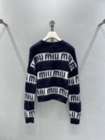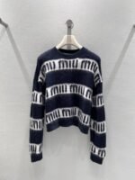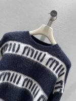Navy blue background color paired with white striped stripes with the letters miu printed all over the design