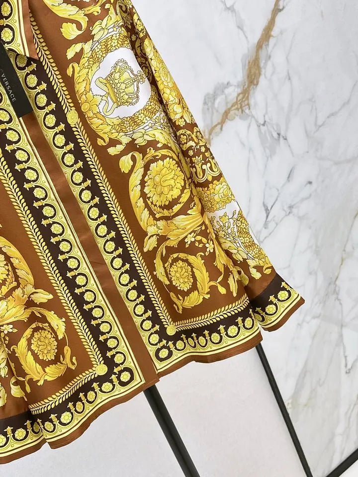 Rich gold and brown hues, 100% silk twill fabric, stunning Medusa metal buckle, original print, classic cut that flatters all body types. A retro, stylish, and sophisticated piece that’s incredibly slimming – a must-have for the sophisticated and elegant.