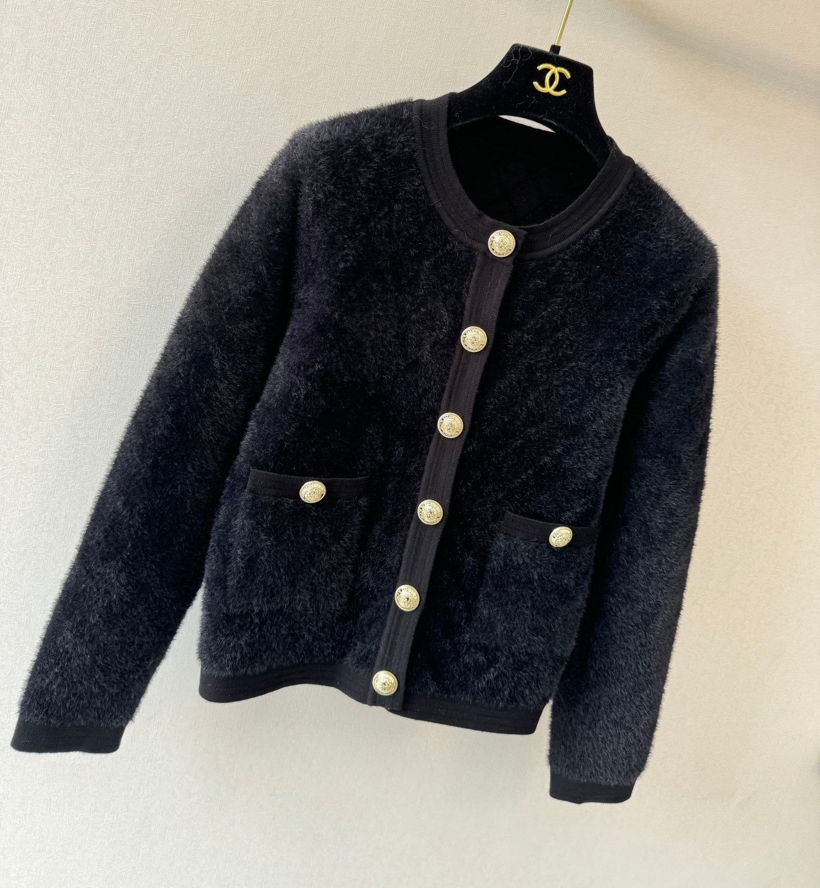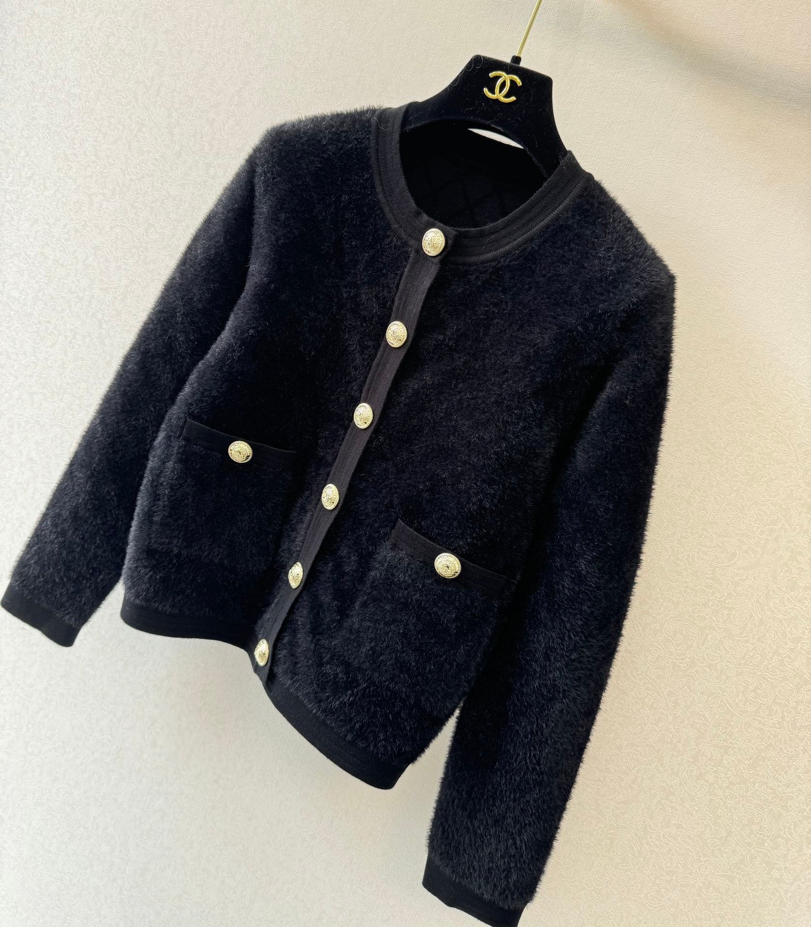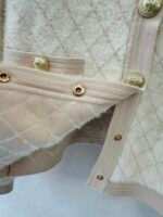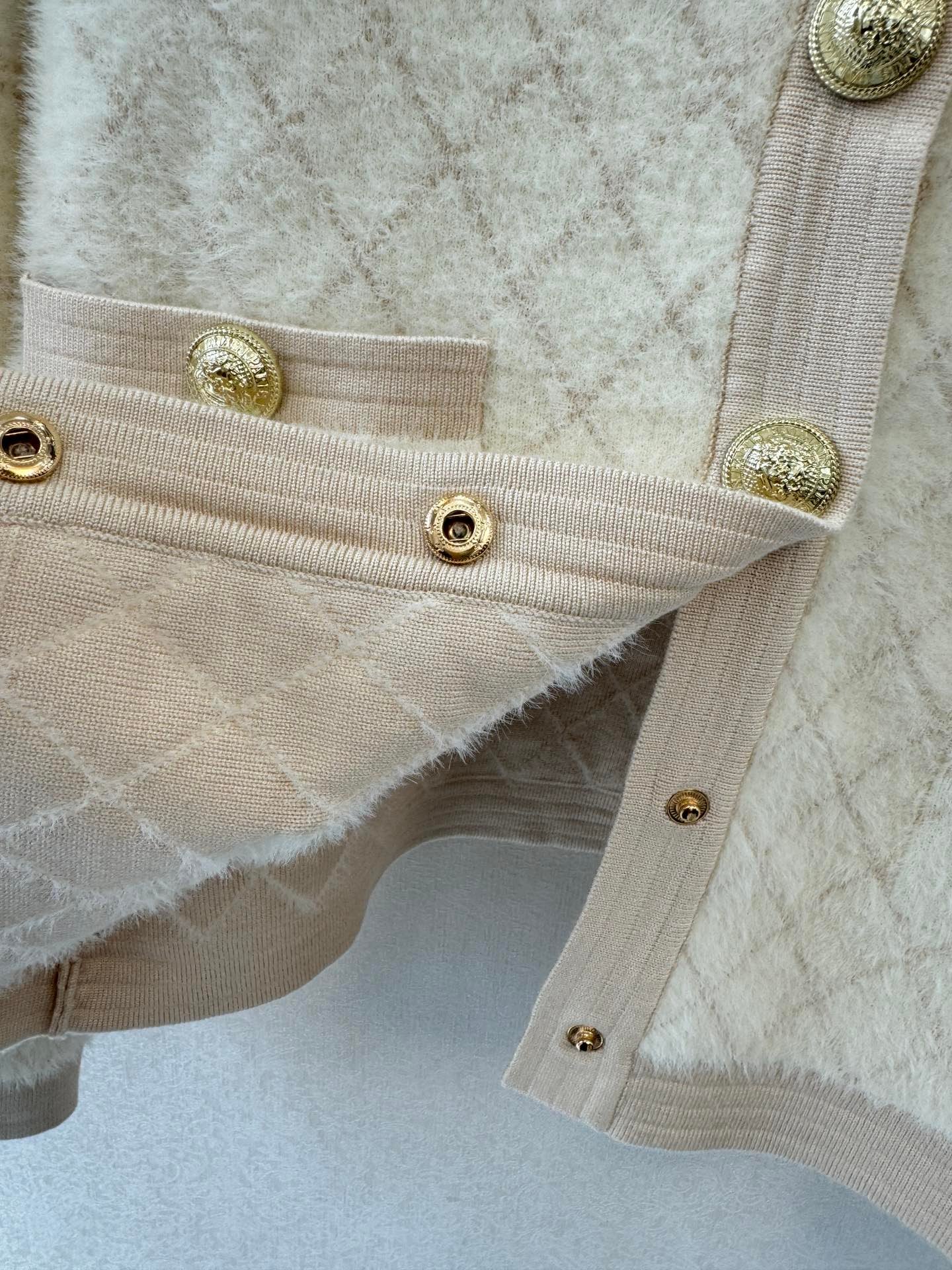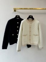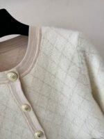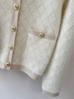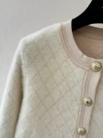 Gold button embellishment 59% wool blend fabric Plush fabric is soft and comfortable to the skin Diamond pattern is clear and three-dimensional Double pocket design on the front and back Round neck design Slim fit Suitable for matching with skirts or pants Versatile and fashionable