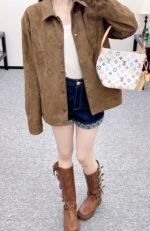 Customized YB imported suede material, with delicate texture and clear short velvet texture, retro brown is suitable for autumn and winter Maillard wear, lapel silhouette shirt version, can be worn as a jacket, embroidered with clover pattern and letter logo throughout, highlighting the brand style, and echoing the letter cloth label on the lining. The front is decorated with tortoise shell round button, the texture is more relaxed and simple, showing a casual and free style, fashionable and stylish.