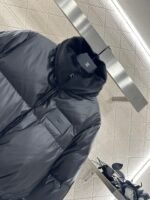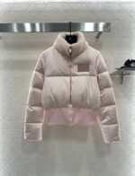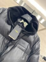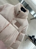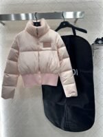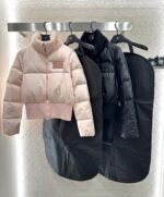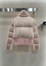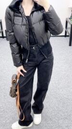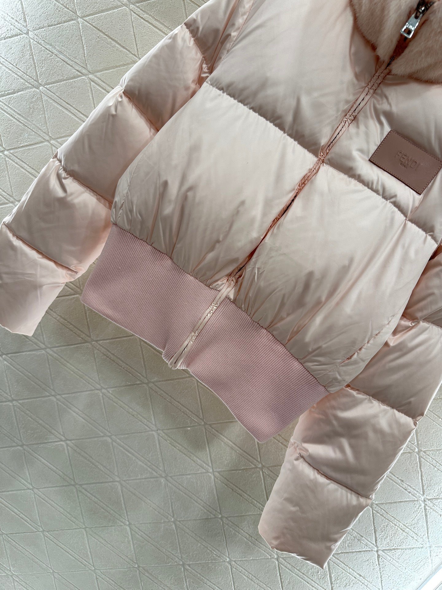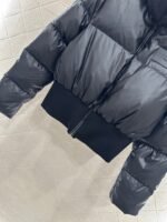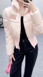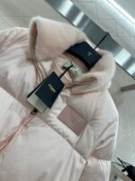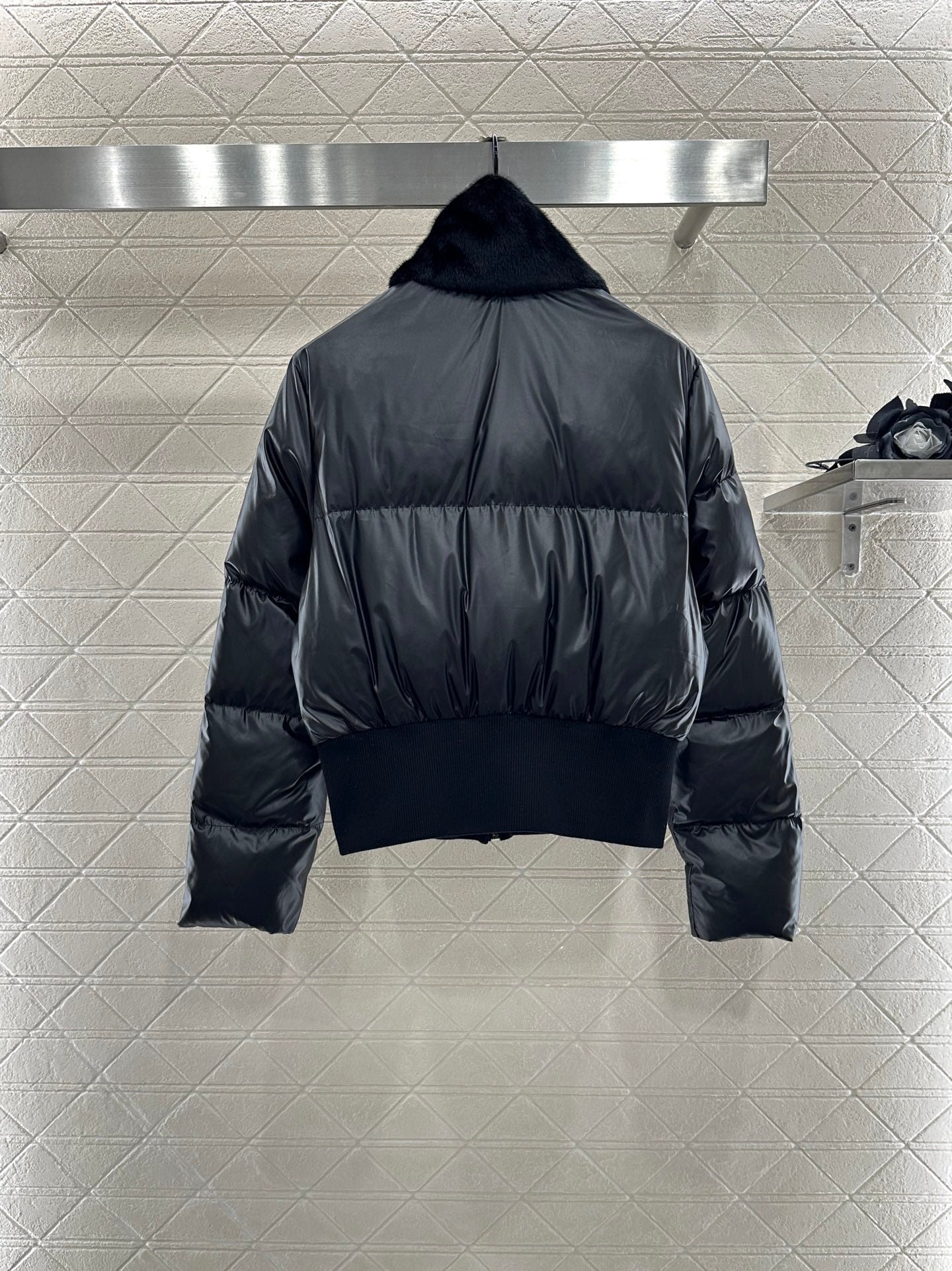 Made of custom YB windproof and waterproof glossy nylon with a white goose down lining, it’s lightweight and warm. The stand-up collar features mink fur for warmth and a luxurious finish. The zippered placket, accented with a satin finish, adds a playful touch, complementing the leather chest patch for a stylish look. Elastic threaded hem and cuffs provide added warmth, while the cropped silhouette offers a lighter, more stylish look, eliminating the heavy feel of autumn and winter.