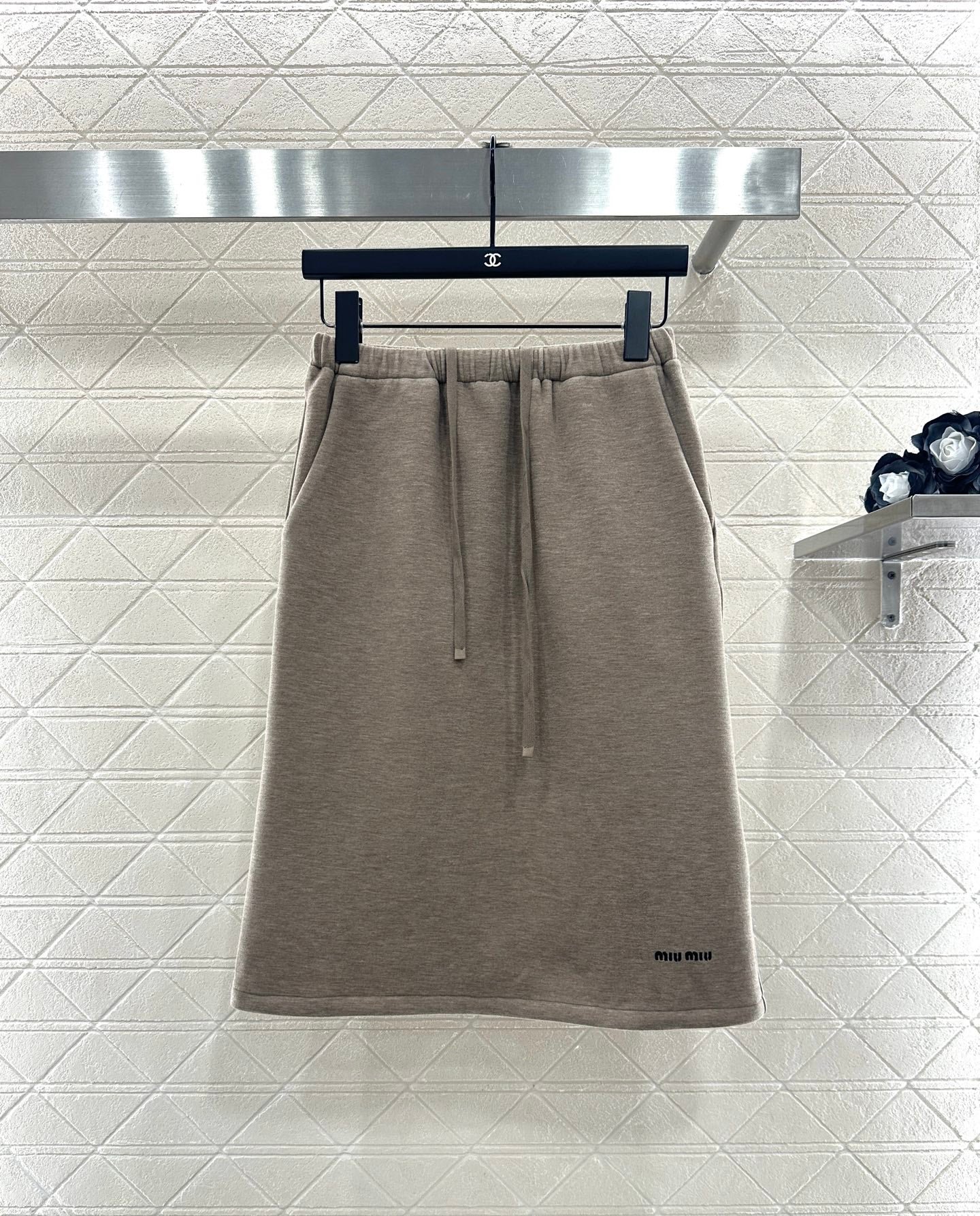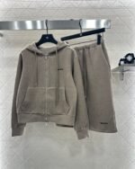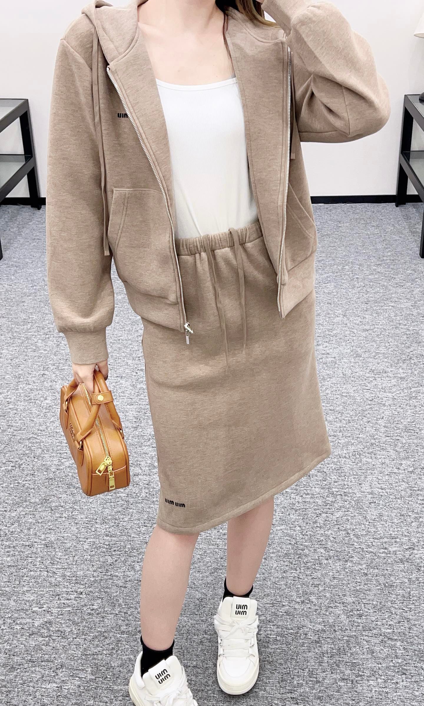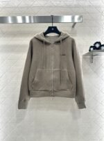 Customized YB imported cotton and wool material, skin-friendly and stretchable, comfortable and free, hooded zipper jacket version, easy to put on and take off, wear alone or open and layered, adding diversity to the outfit, contrasting color letter logo on the chest, low-key and high-end. Paired with the same series of knee-length skirt, it is elegant and energetic, with a moderate overall relaxation, and the whole set is casual and fashionable. Customized fabrics and accessories