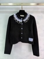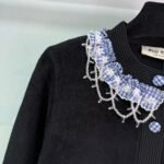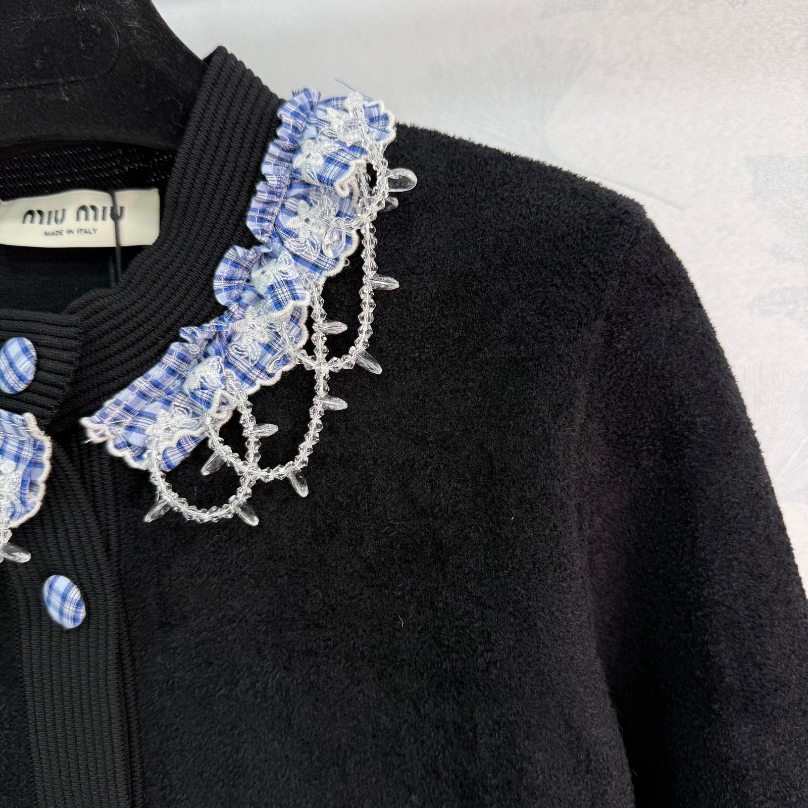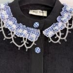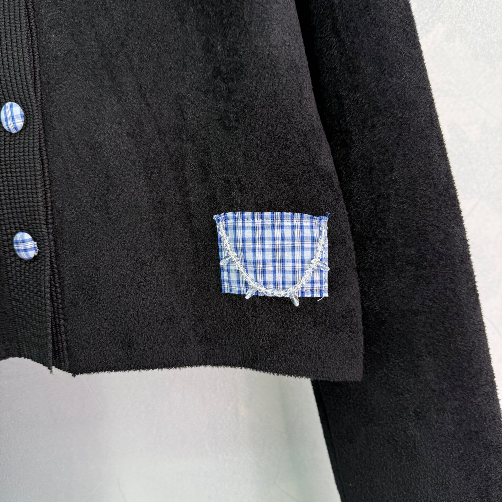 The blue and white plaid ruffle design is a super beautiful style. The neckline and hem are both blue and white plaid splicing, matched with pearl decorations. It has a strong sense of design and shows a playful and age-reducing style with elegant temperament!