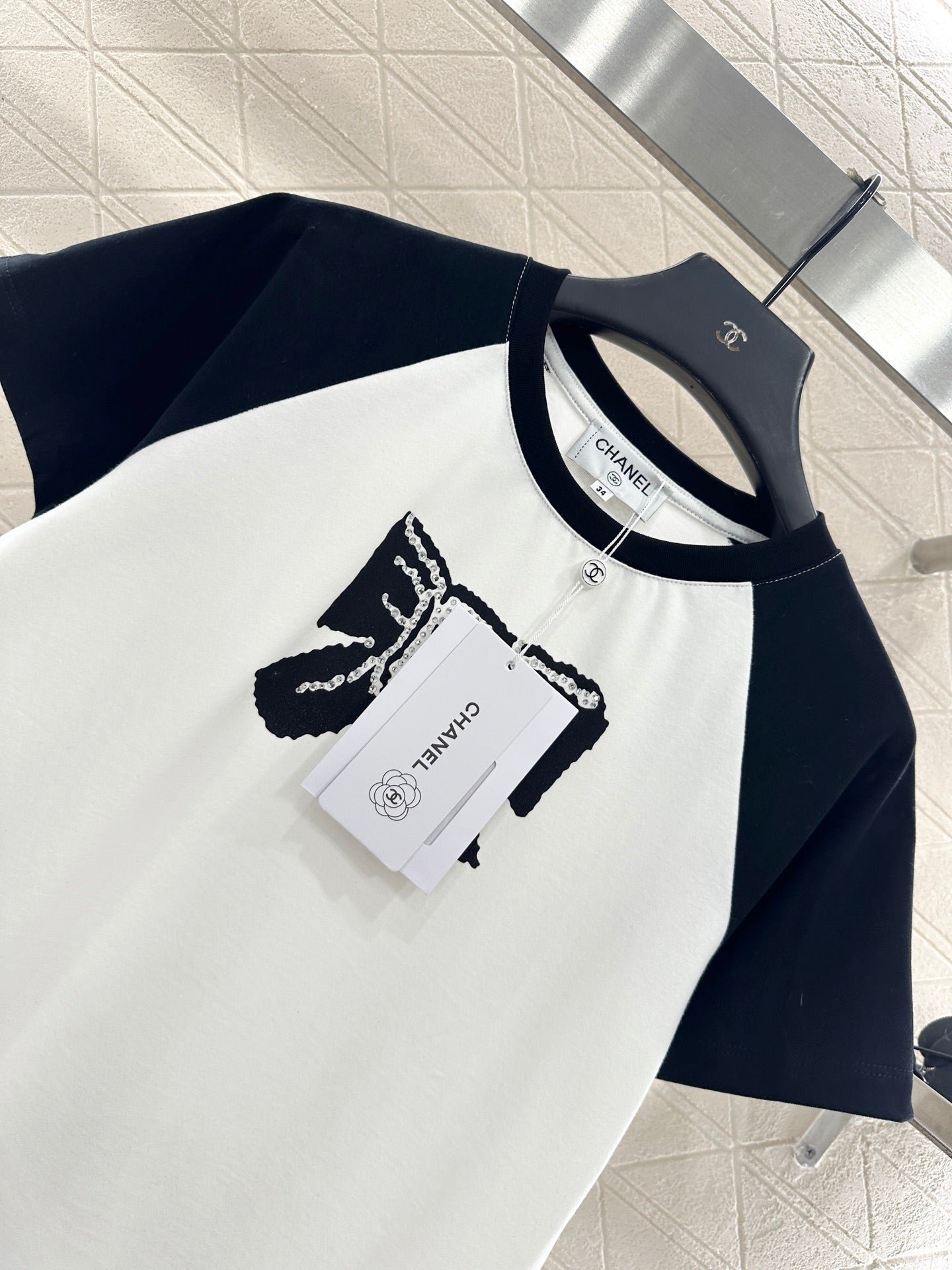 Customized YB original cotton material, breathable and comfortable, full of texture, regular short-sleeved T-shirt cut, highlighting the brand style, made of heavy cotton, slightly elastic, showing a slimming visual effect, using color matching to create a shoulder effect, with rhinestone hot diamonds on the chest to create a bow and letter double C pattern, youthful and beautiful breath doubled, showing a fashionable style, wearing it alone is colorful and fashionable