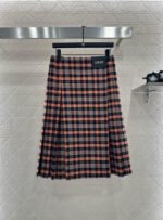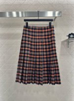 Cotton wool material, glossy texture, flowing and stylish, collar jacket and skirt set, covered with red, orange and black checkered patterns throughout the body, zipper and open top design, leather buckle engraved with letter logo, complementing the waist leather label, low-key highlighting the brand image, combined with flower bud inward elastic hem, the texture is more casual and fashionable, simple and high-end. Paired with a one-piece pleated half skirt from the same series, the waist is neatly pleated, and the front panel and pleated design are full of a sense of simplicity and durability, presenting a casual dressing style. The complete set is fashionable and stylish. Pairing them separately is also great.