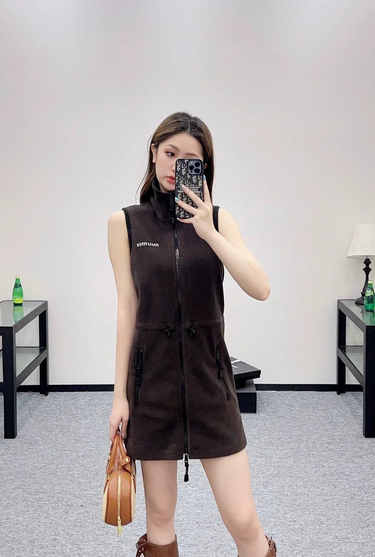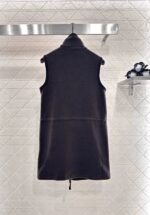 The texture of the fleece material is comfortable, warm, soft, and versatile, making it easy to wear. The sleeveless dress is cut and ready to wear in a plain color. The chest letter logo is decorated with details to enhance delicacy. The front zipper design can be turned over or worn as a high collar, and the elastic slit can be adjusted freely for easy on and off. The micro A straight tube is matched with the waist drawstring and zipper pocket, adding a neat feeling and outlining a graceful figure. The overall workwear is full of casual feeling