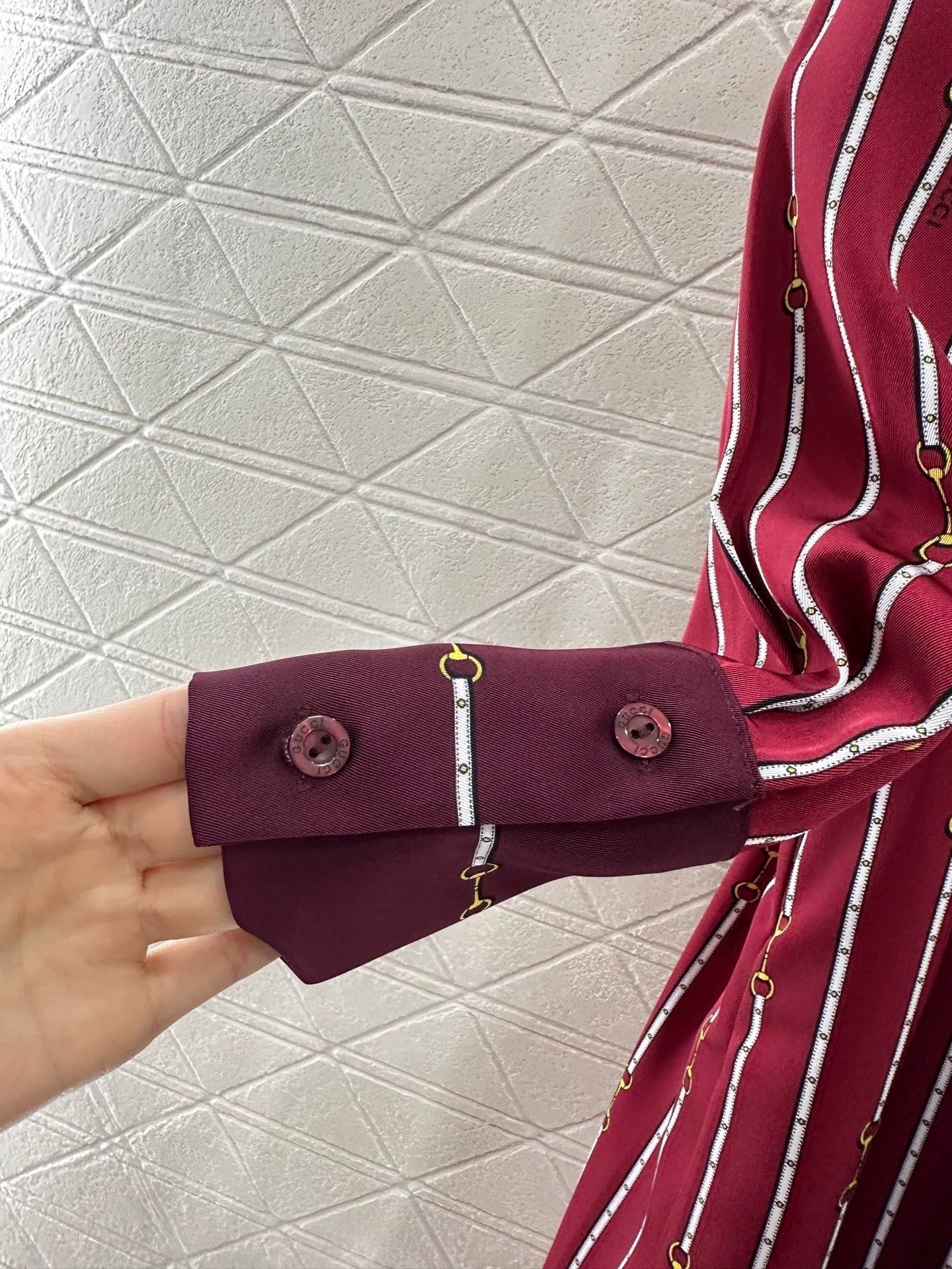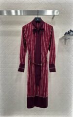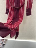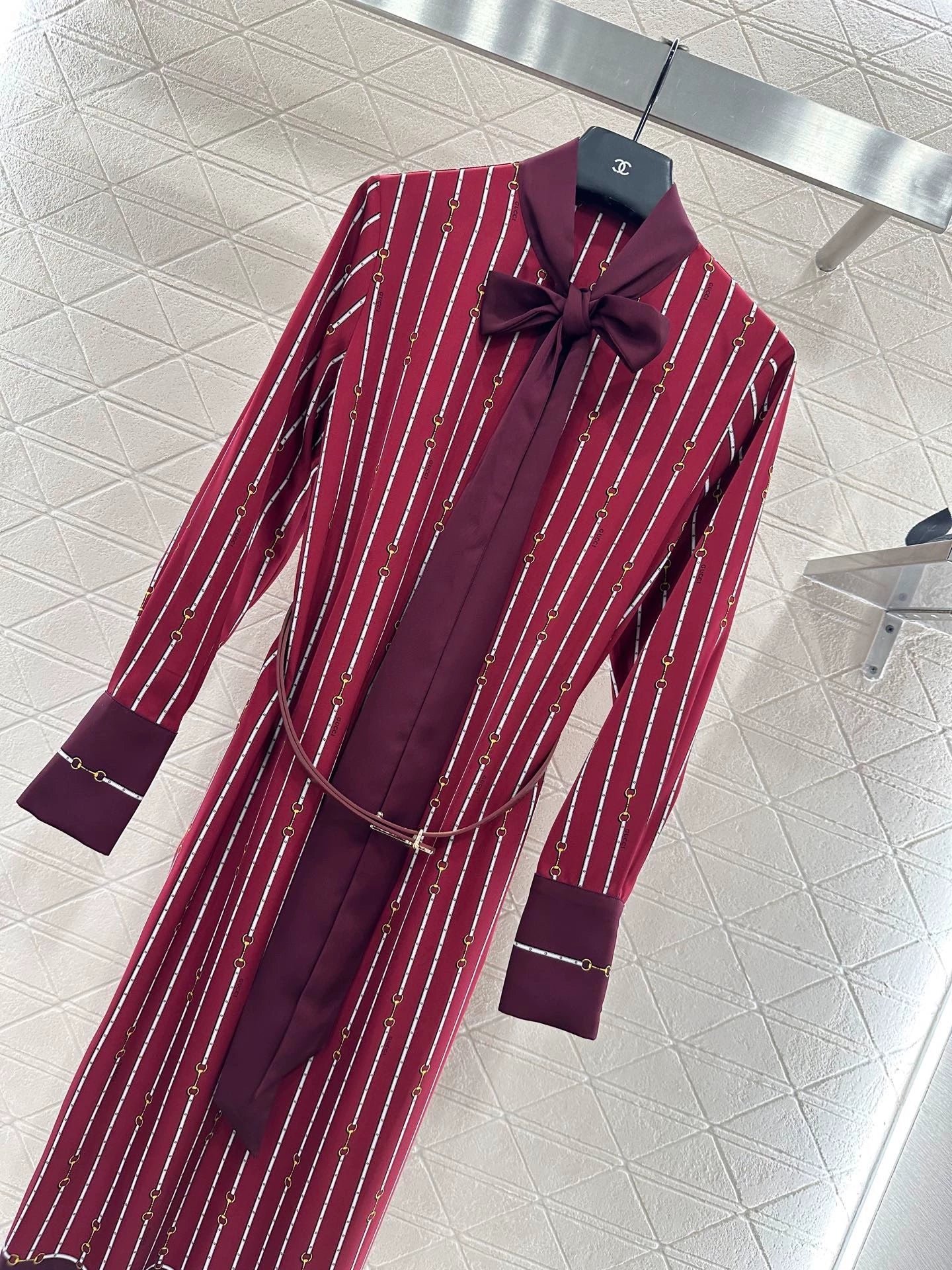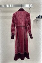 The twill thick material has a glossy texture and a flowing and flowing silhouette. The long skirt is cut with a ribbon, and the finished garment is covered with a vertical horseshoe chain buckle pattern in red and white. The cuffs and hem are decorated with plain edges and bow ribbons, highlighting the high-end brand style. The front shoulder is matched with a belt adjustment, highlighting the waistline and accommodating the body shape. It is easy to wear in good proportion, elegant and fashionable on the upper body, and suitable for daily commuting