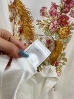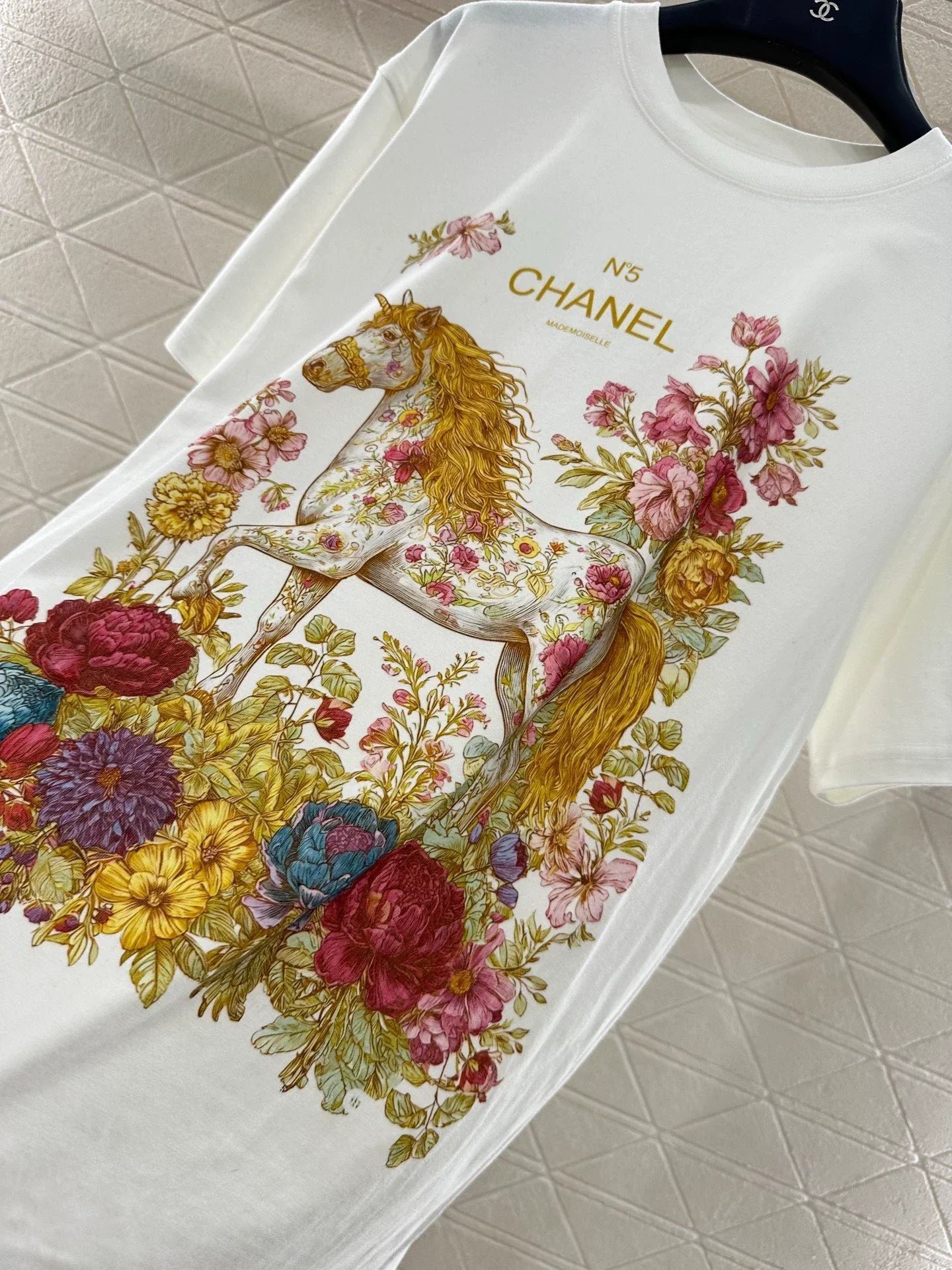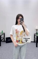 Made of all cotton material, with a premium texture, soft and comfortable. The loose short sleeved T-shirt is cut and made of heavy-duty cotton, which has a slight elasticity and presents a slimming visual effect. The body is covered with flowers and vines ➕ Decorated with romantic mythological elements such as unicorns, combined into a rich and coordinated red powder pattern, with letter logos that conform to the brand’s tone embellished in the center. The fairy style is unified and coordinated, with a full sense of design, making it fashionable and eye-catching when worn alone