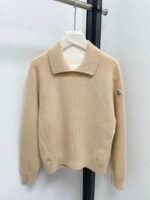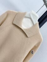 Cashmere high neck sweater, available in beige and orange, with a lapel design and classic badge embroidery embellishment.
