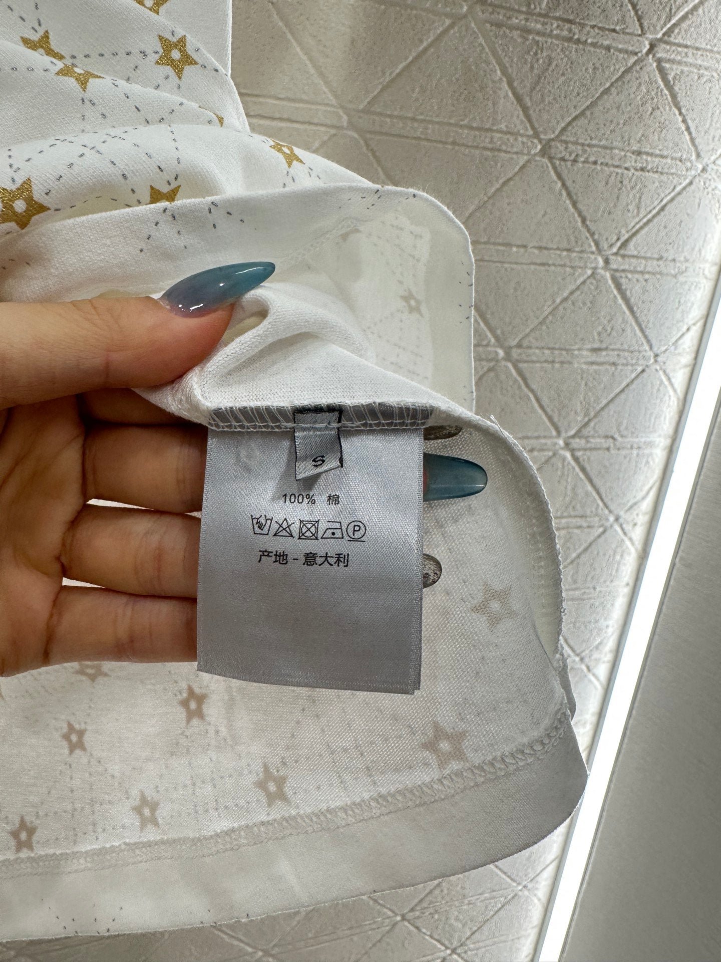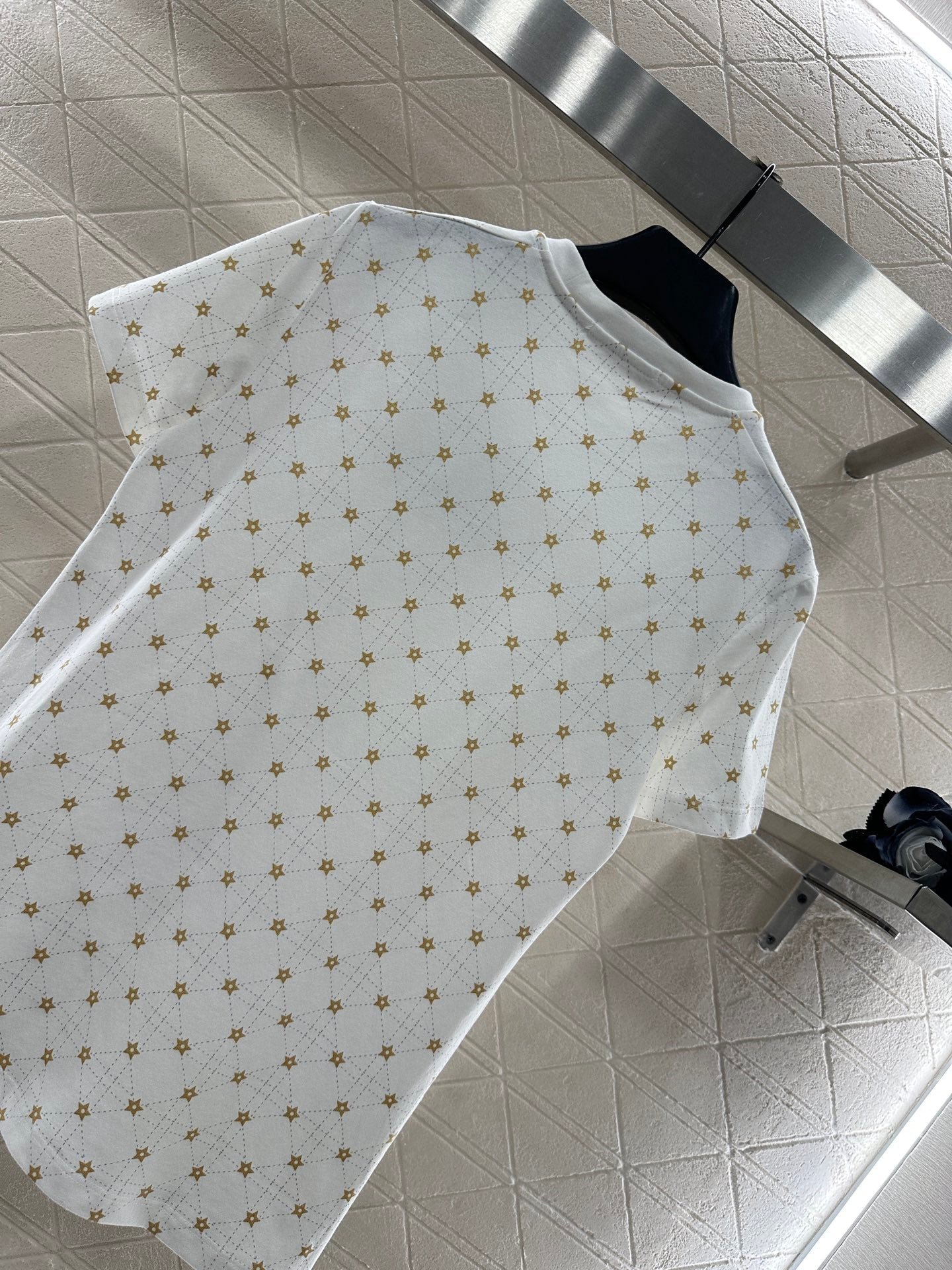 Made of silky cotton material, breathable and comfortable, with a rich texture. The regular short sleeved T-shirt cut highlights the brand’s style and is made of heavyweight pure cotton, with a strong sense of drape. Presenting a slimming visual effect, the entire garment restores the dotted Tengge pattern ➕ Five pointed star color scheme, using printing technology and contrasting colors on the chest to outline the brand letter logo pattern, enhancing the brand identity, highlighting the fashionable and high-end sense, creating a personalized style, fashionable and relaxed, and shining with fashion on the single wear and interior
