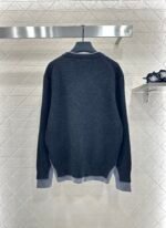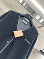 Crafted from cashmere and wool yarn, it is skin friendly, comfortable, soft and textured. The V-neck knitted cardigan has a unique design, with the collar edge, front placket, and cuffs exposed for contrasting colors, creating a fake two-piece layering effect. It provides both warmth and fashionable tone, and features a logo letter decoration on the chest, showcasing the elegant and academic atmosphere of the style. It is fashionable to wear it in autumn and winter.