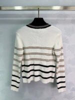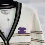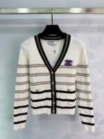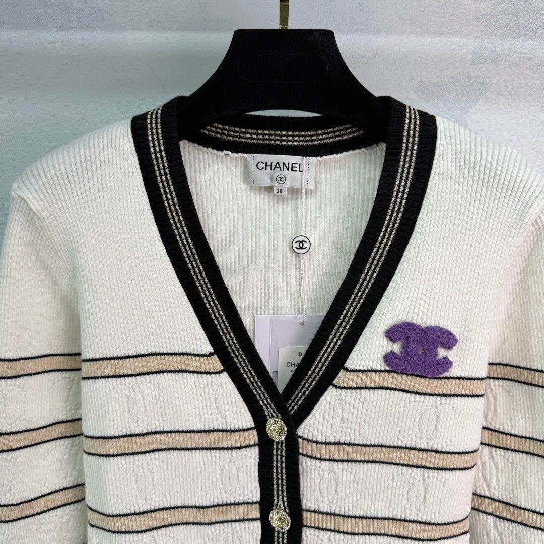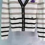 Imported yarn weaving texture, high-end and comfortable, soft V-neck knitted cardigan cut, all body vertical pit stripe texture pattern ➕ Double C dark pattern logo combined with contrasting stripes and threaded edges, easily highlighting full marks of detail and texture. Double C round buckle exquisite and stylish. Whole body contrasting stripes make it easy to wear elegantly or artistically versatile. Regular shoulder design, accommodating body shape, fashionable and casual
