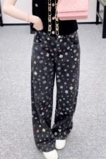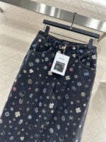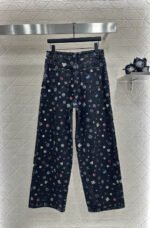Twill cotton denim material with multiple washings presents a crisp texture, straight leg wide leg pants with symmetrical cut pockets, durable basic contours, high-end all body laser full coverage, irregular and staggered camellia flowers ➕ The fifth element features a double C pattern with colorful interweaving and jumping, complemented by gold buckles, highlighting the brand’s diverse and complex visual effects, creating a romantic and beautiful style full of personality and creativity. The pants embrace the body shape, and the brand’s high-end design is fully satisfied