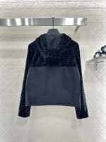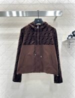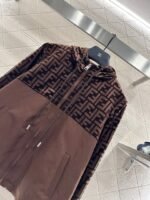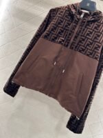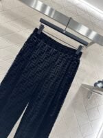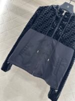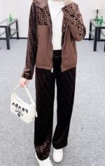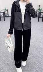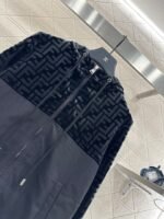 Jacquard cotton material, glossy texture, high-end style, lapel suit cut, single row black gold letter placket, simple and atmospheric, covered with iconic letter jacquard pattern throughout the body, waist buckle belt outlining curves, adding design highlights, high-end style, covering hip and crotch lines, shaping and slimming, enhancing body tolerance, adding noble and elegant charm, commuting and attending important occasions, showcasing luxurious taste.