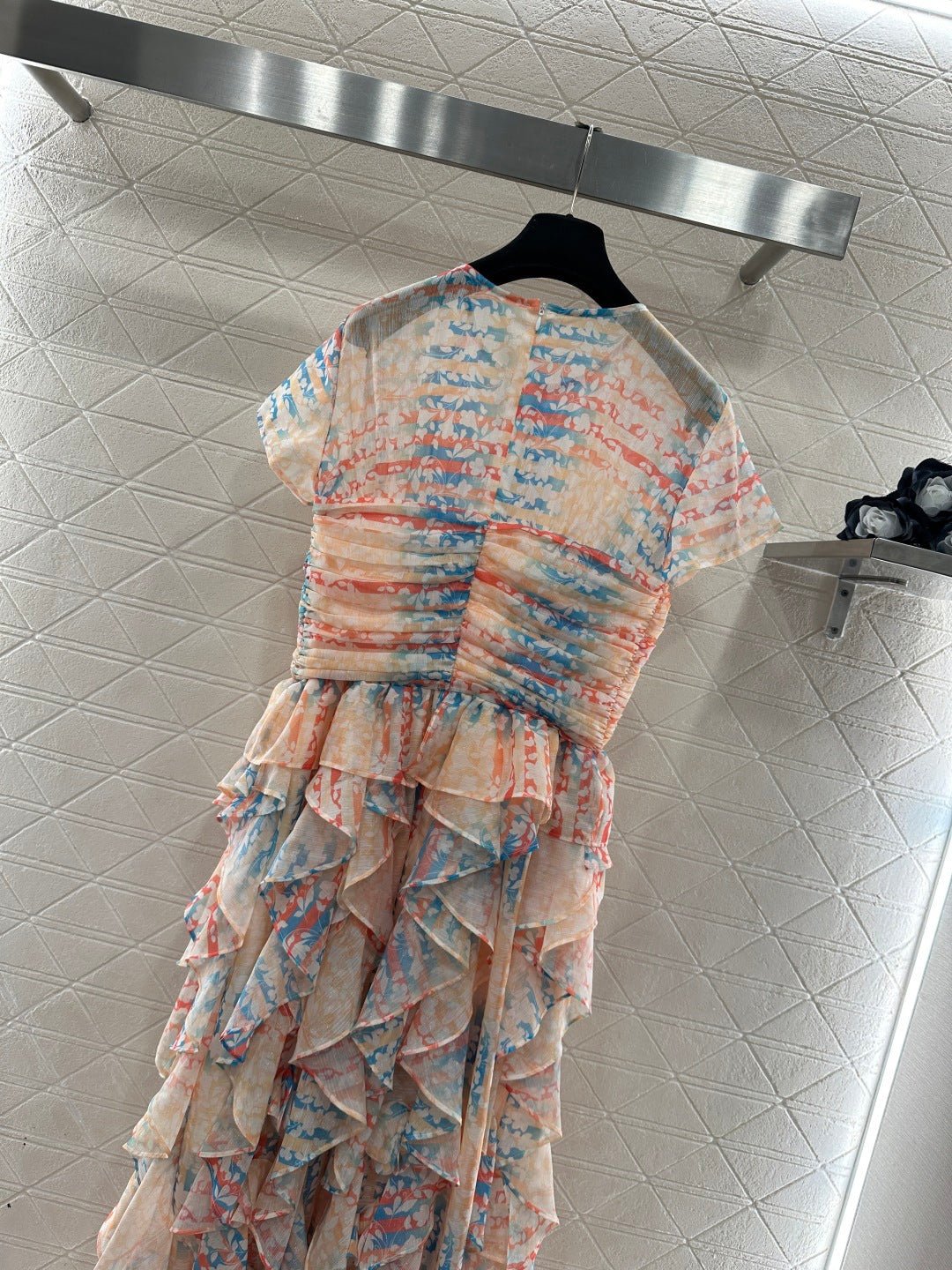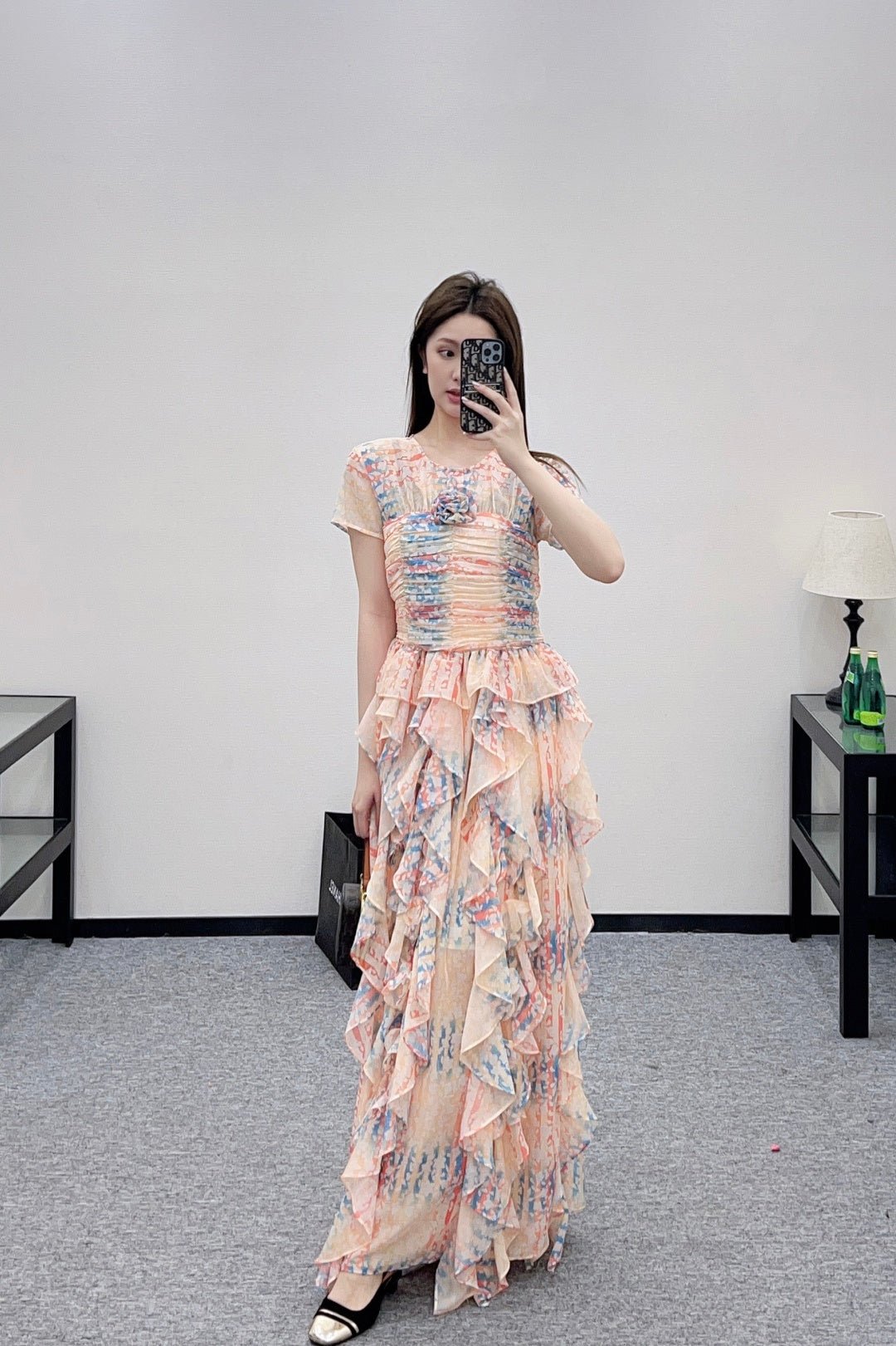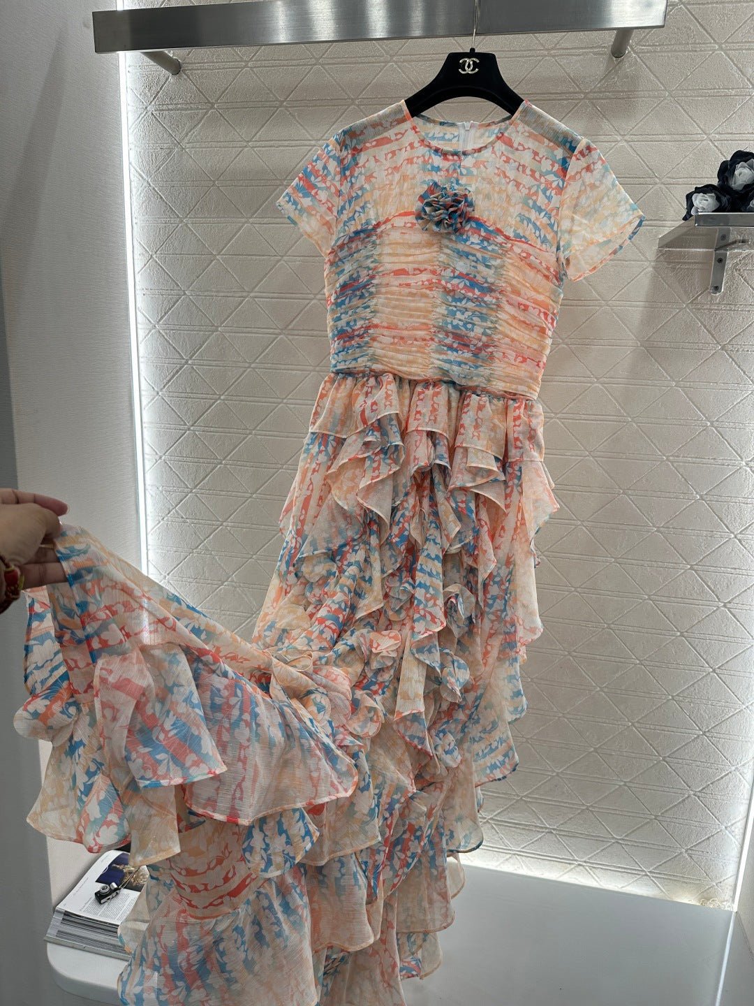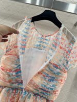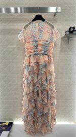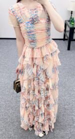 Made of silk yarn, this dress is lightweight, soft, and gentle on the skin. The round neck and short sleeves, combined with the watercolor-like floral print, exude romance itself! The pinkish-orange and light blue watercolor wash is gentle and dreamy. The pleated texture and layered ruffled hem create a graceful and ethereal look as you walk. The camellia embellishment on the chest is the perfect finishing touch, capturing the romance and sophistication of French elegance in every detail. Wearing this dress is like walking a spring painting! The horizontal pleats at the bust and waist accentuate the figure and flatter the hips, making it a perfect choice for an early spring vacation.